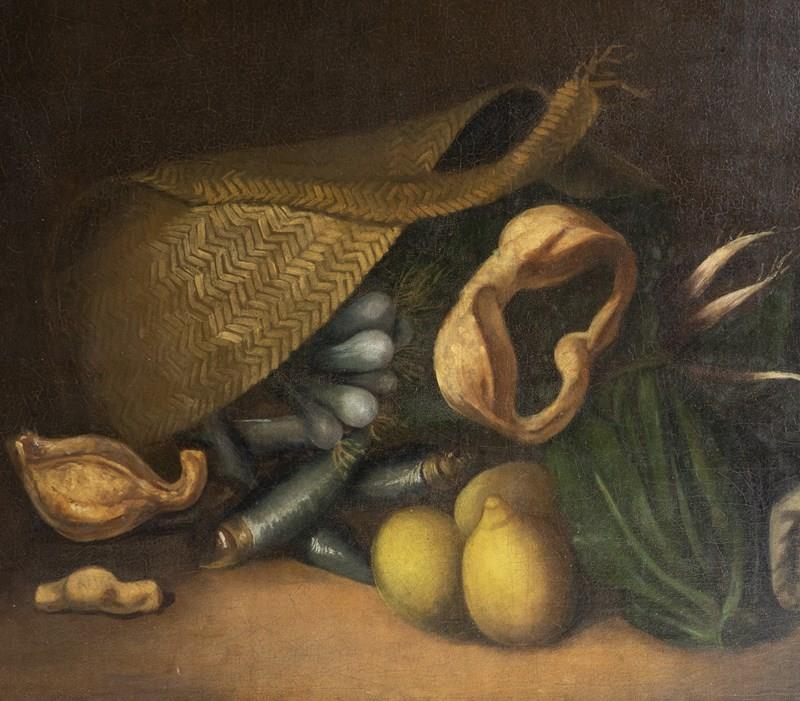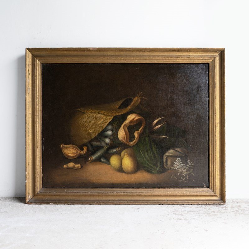 ANTIQUE ORIGINAL OIL ON CANVAS PAINTING DEPICTING A BASKET OF INGREDIENTS