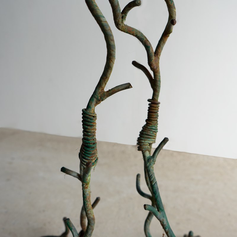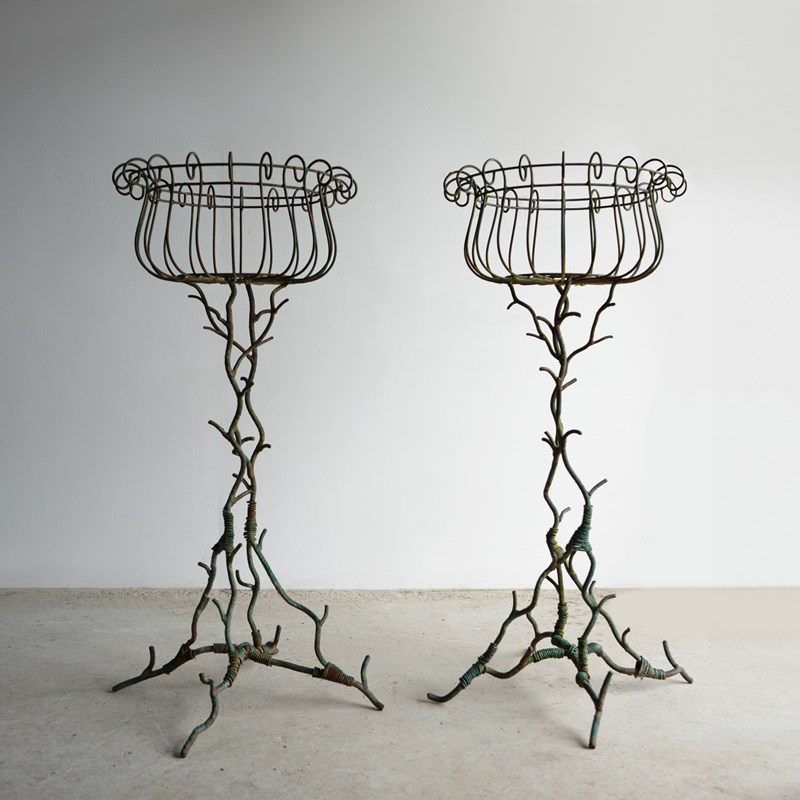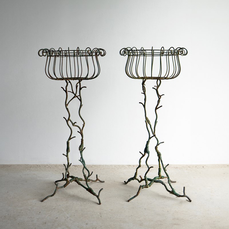 Pair of antique plant stands. Naturalistic wrought iron and wirework bases in the faux bois taste to emulate branches and twigs.