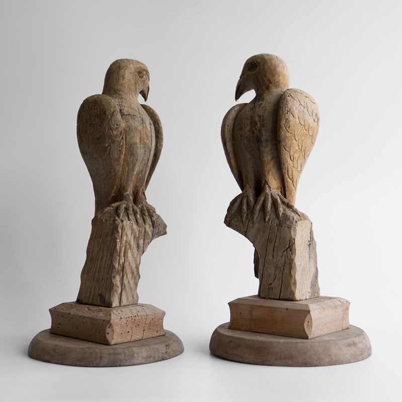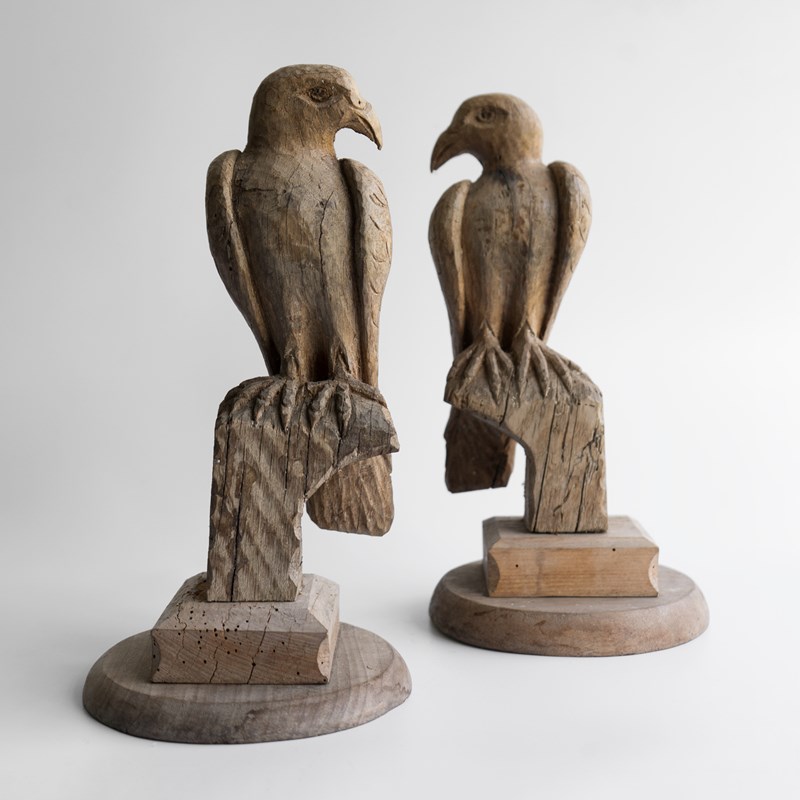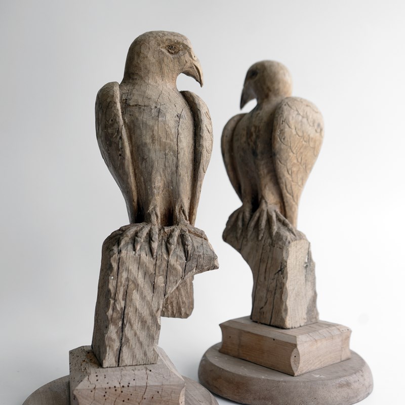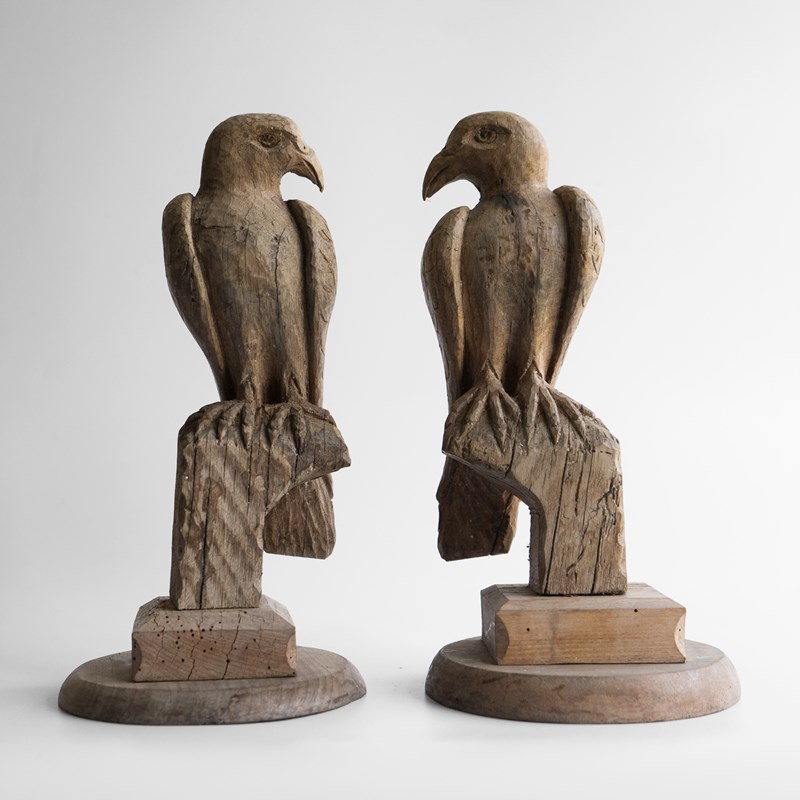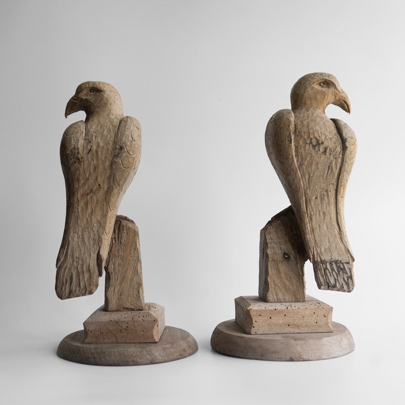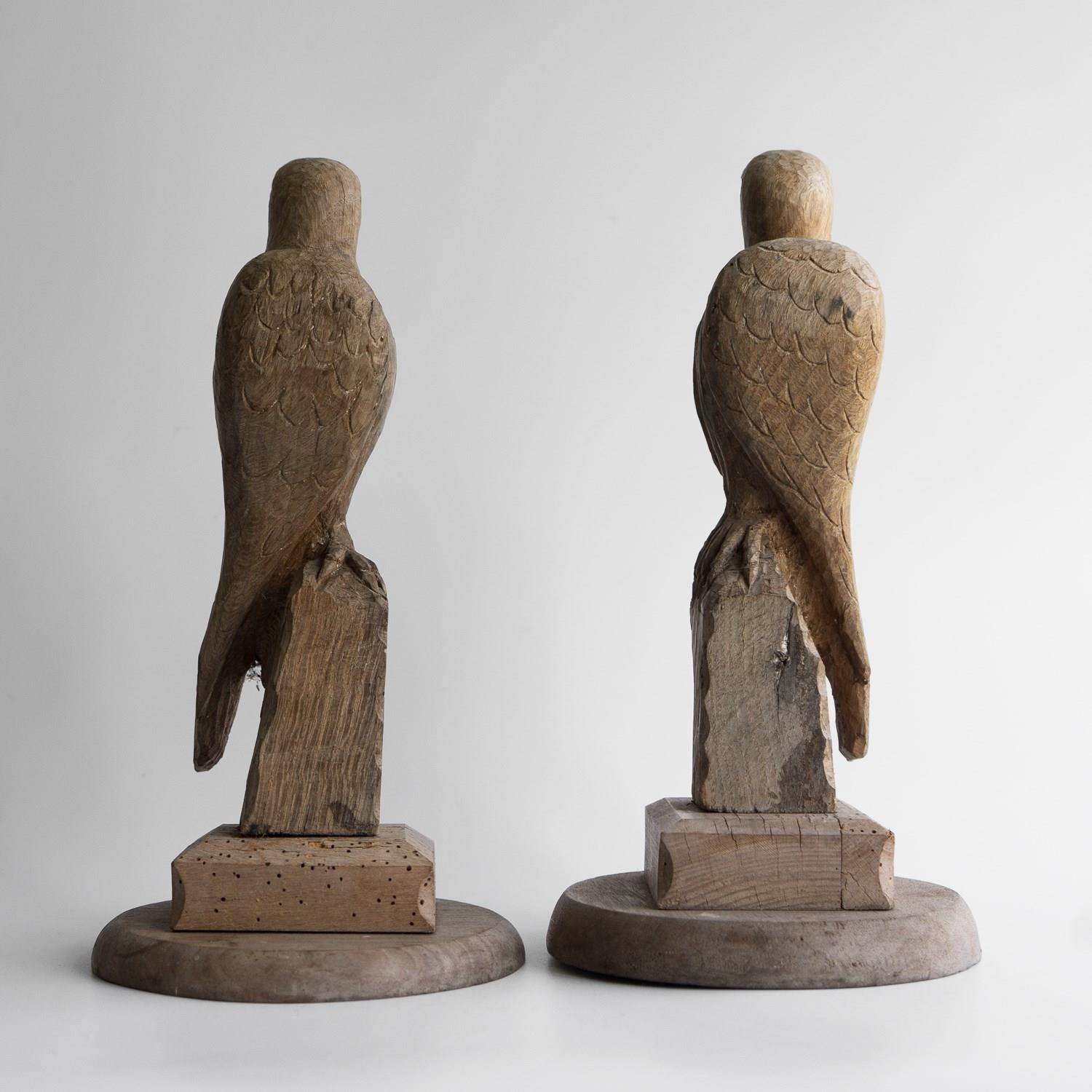 Pair Of Antique French Folk Art Carved Oak Falcon Figures, Wooden Bird Sculpture