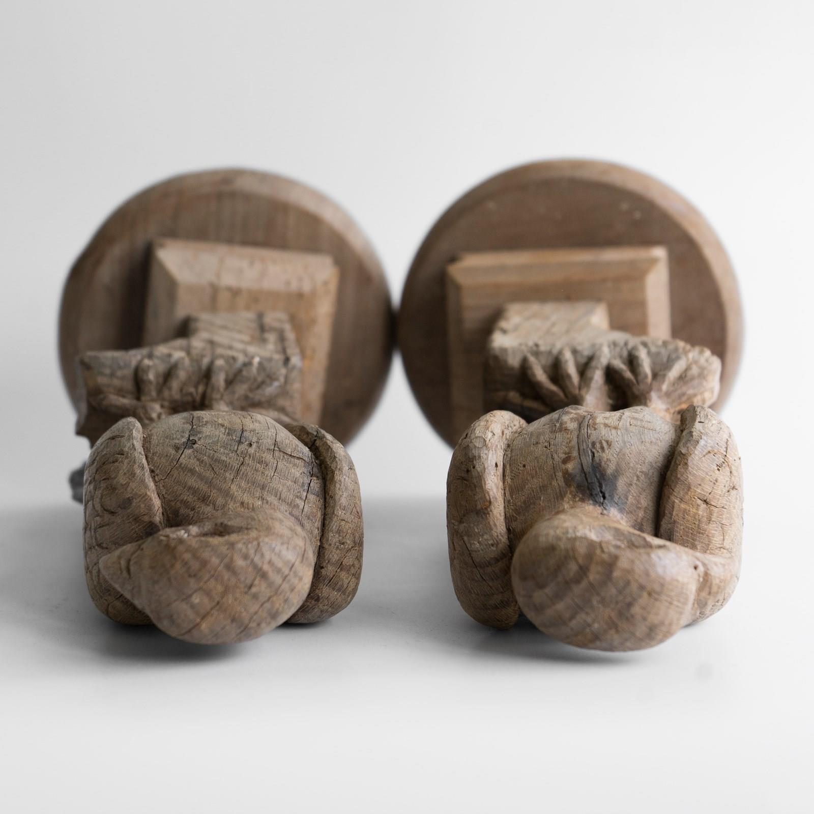 They were probably originally carved to be finials on top of a building or could have formed part of a wider carving on a piece of furniture or ship or similar.
