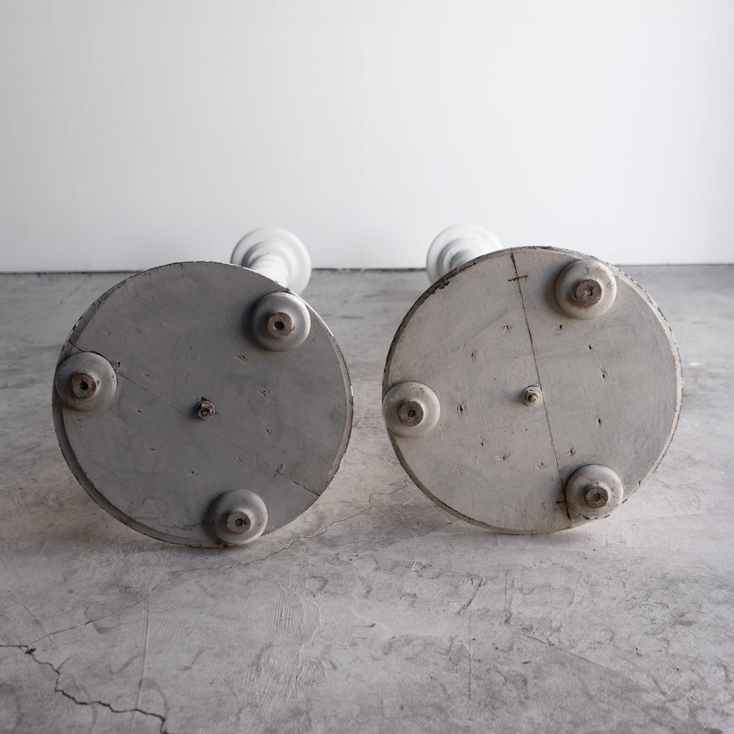 A matching pair of wooden stands with chunky carved twisted columns, simple circular tops and bases with squat bun feet.