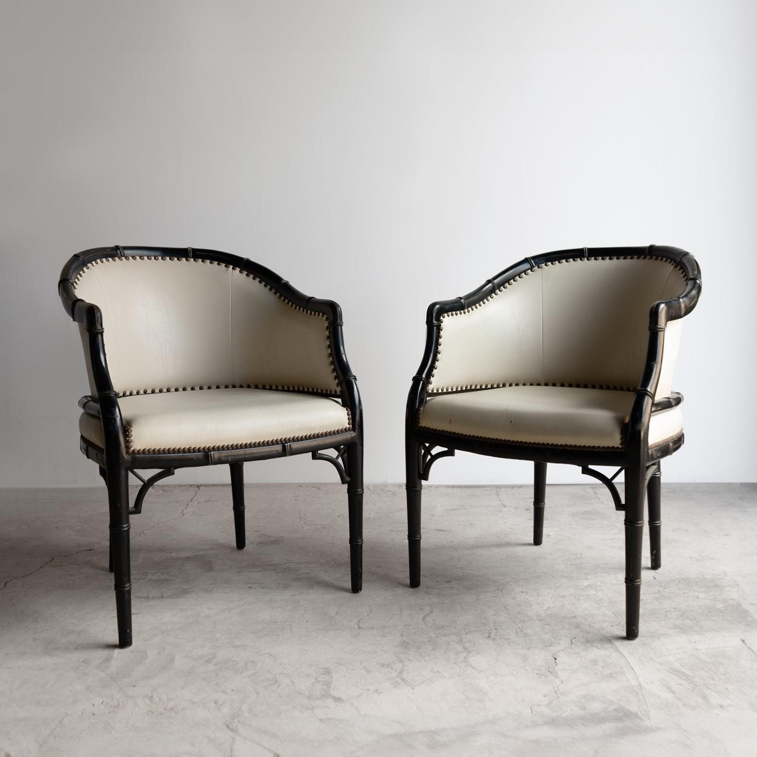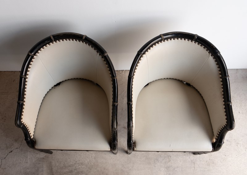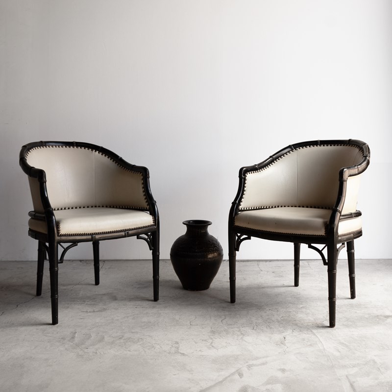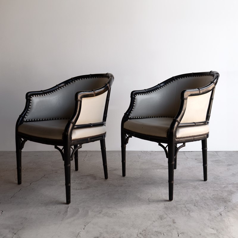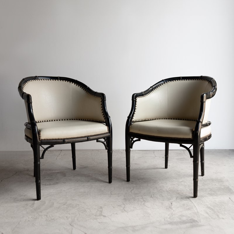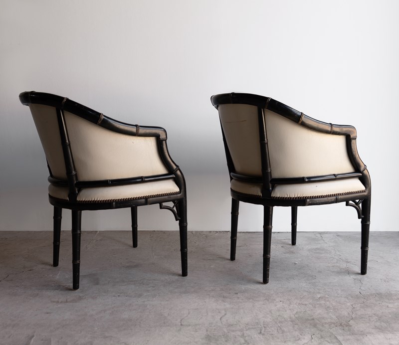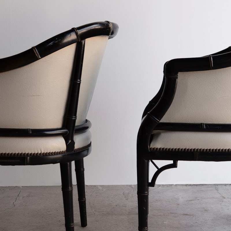 Pair Of Vintage Chinoiserie Ebonised Faux Bamboo Tub Chairs, Mid 20Th Century