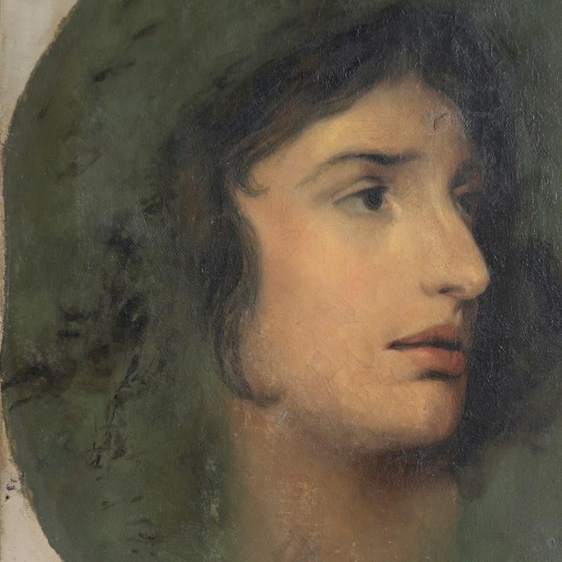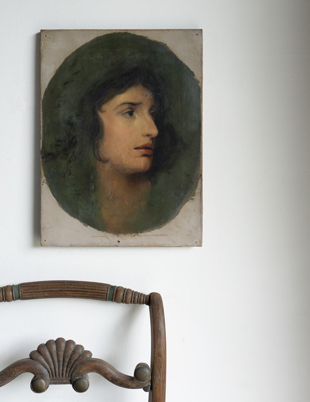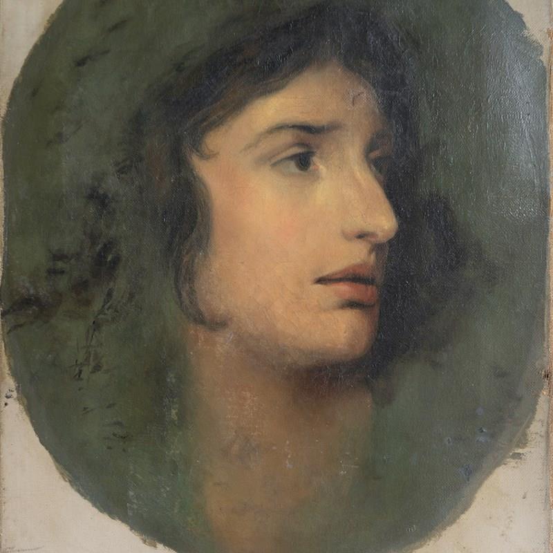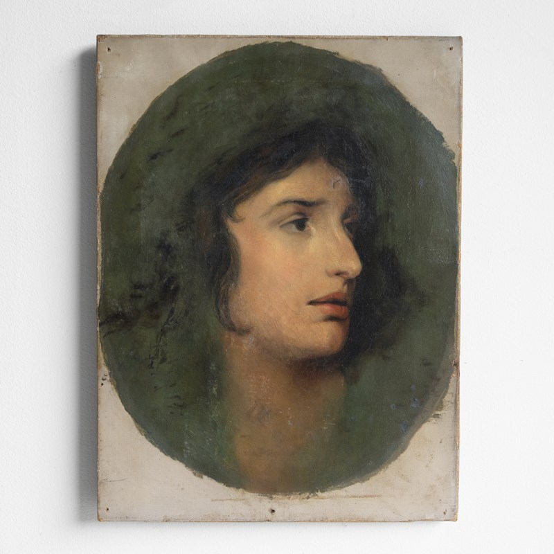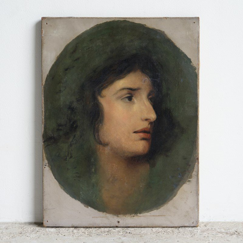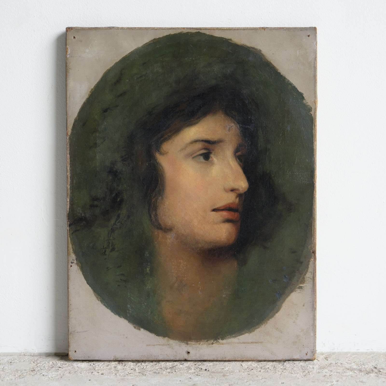 Antique original oil on canvas painting. A romantic and skilled depiction of the famous Welsh actress Sarah Siddons (1755-1831). Siddons was the best-known tragedienne of the 18th Century, and her most notable role was as Lady Macbeth. The contemporaneous critic William Hazlitt dubbed Siddons "tragedy personified". Her portrait was painted countless times by the great and good during the 18th/19th century.