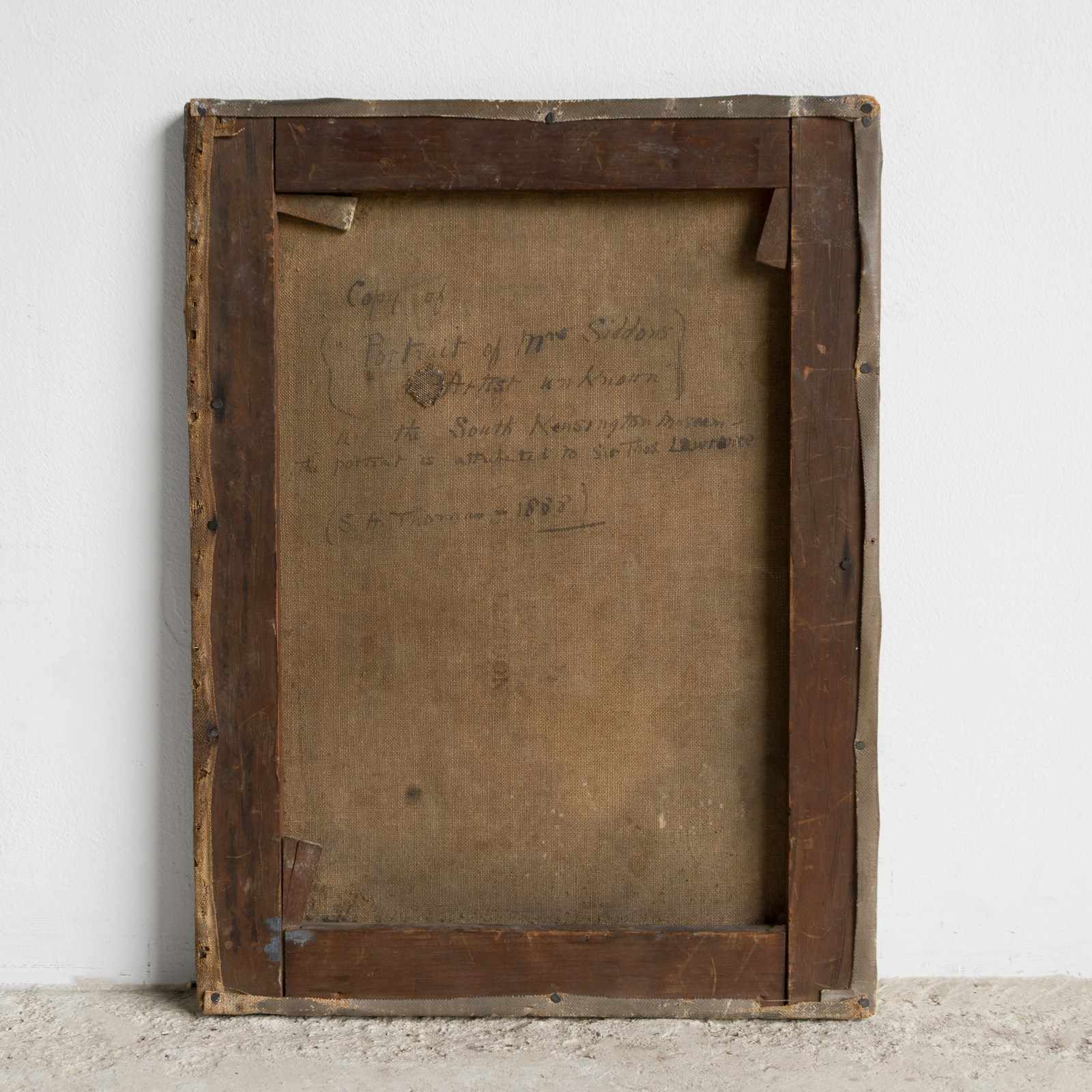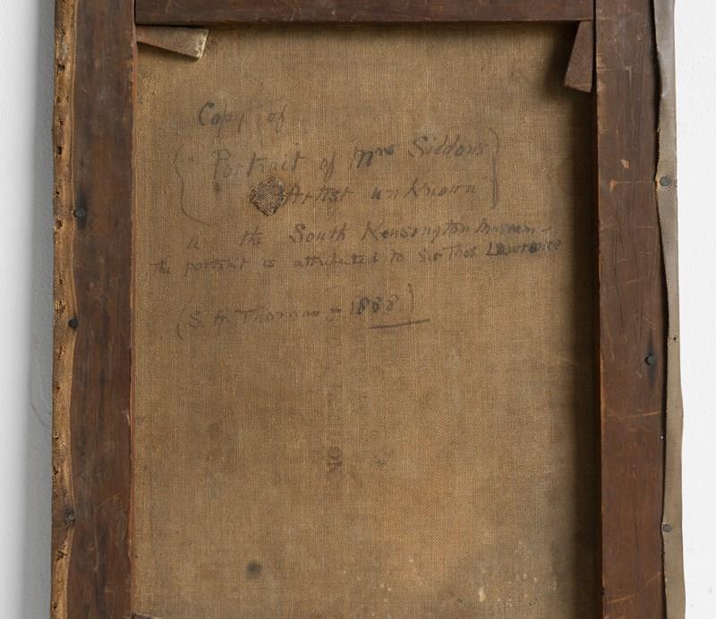 Inscribed verso: ‘Copy of (“Portrait of Mrs Siddons“ Artist Unknown), In the South Kensington Museum, The portrait is attributed to Sir Thomas Lawrence’. It is also signed by the artist ‘S.A. Thomas’ and dated ‘1888’.