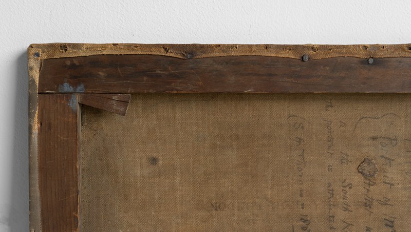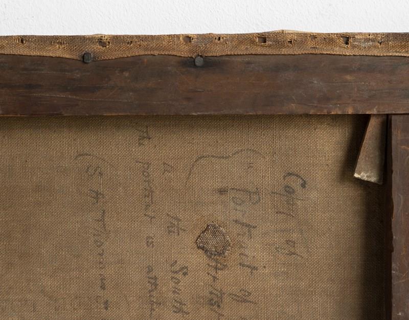 The painting is largely in good vintage order. There is some wear throughout commensurate with age, including some craquelure and some minor losses. There is one small patch repair to the canvas and some light touch-up restoration in a couple of small areas. Overall, we think the slightly worn feeling of the work adds to its romantic charm and is part of the reason we fell for this piece in the first place.