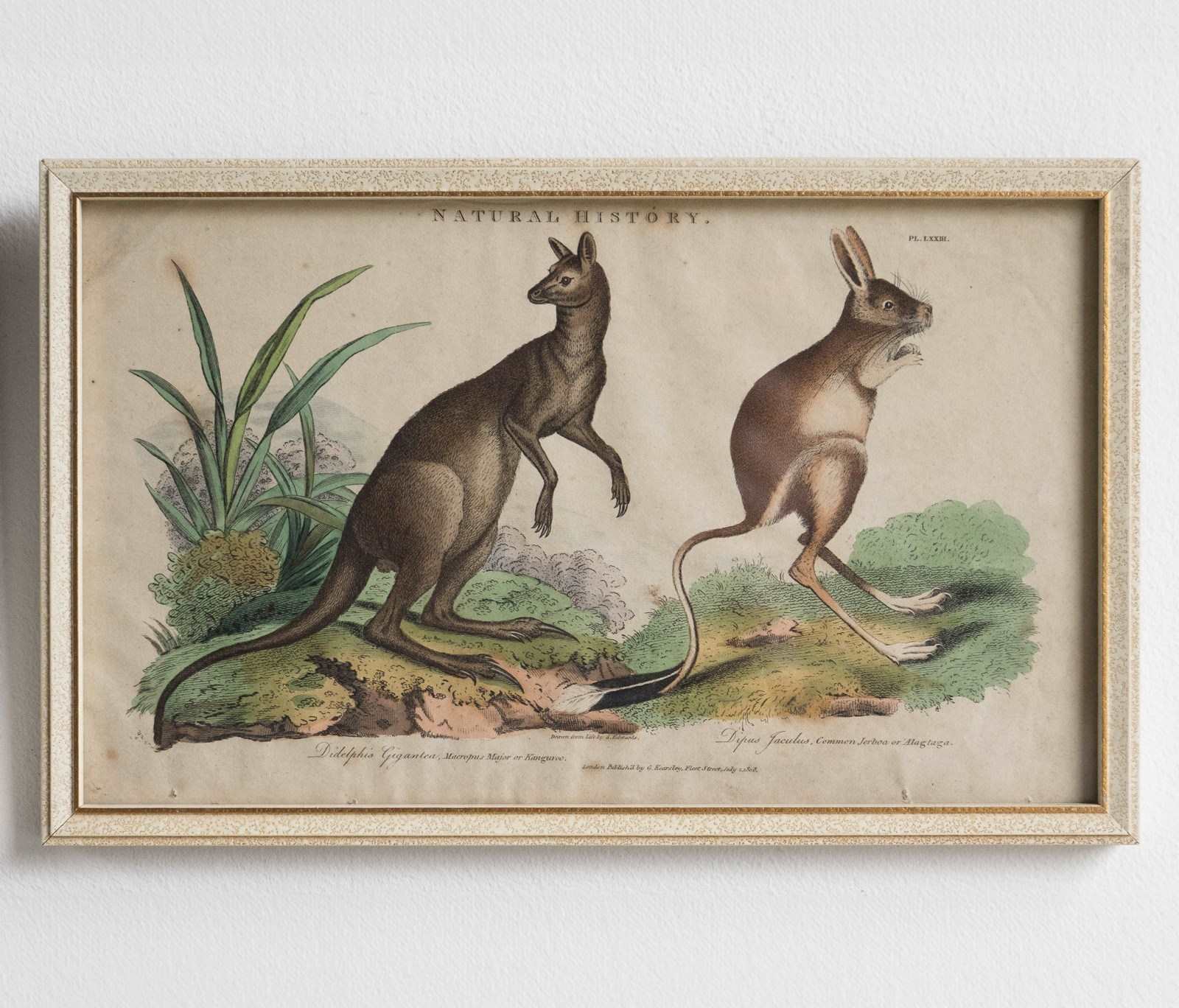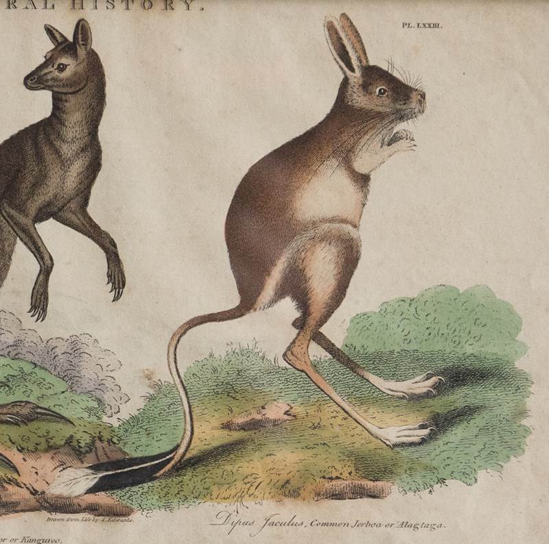 Plate LXXIII - Depicts ‘Didelphis Gigante, Macropus Major or Kangaroo’ and ‘Dipus Jaculus, Common Jerboa or Alagtaga’.