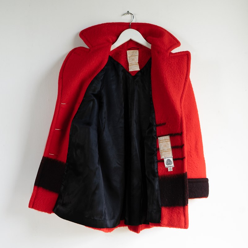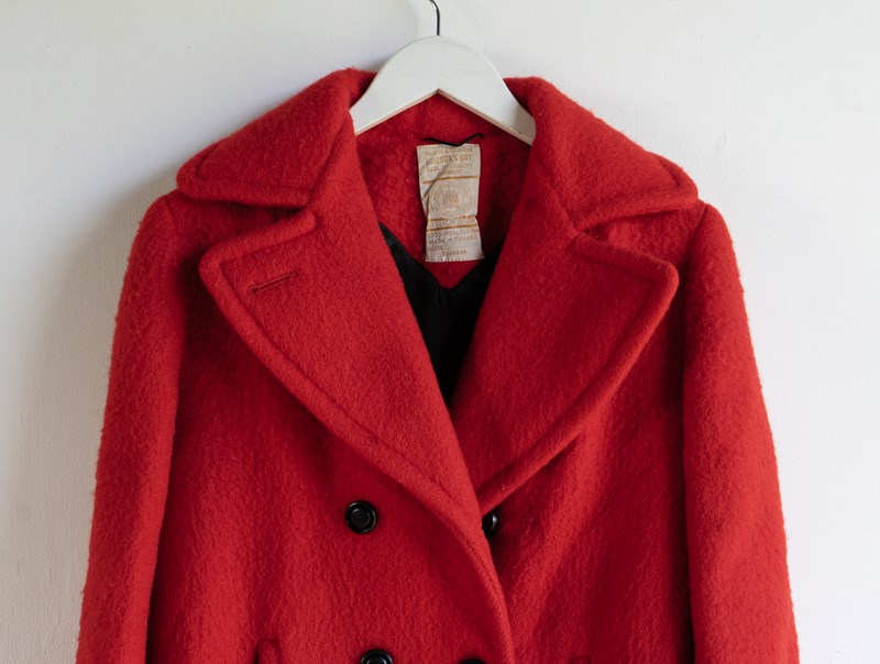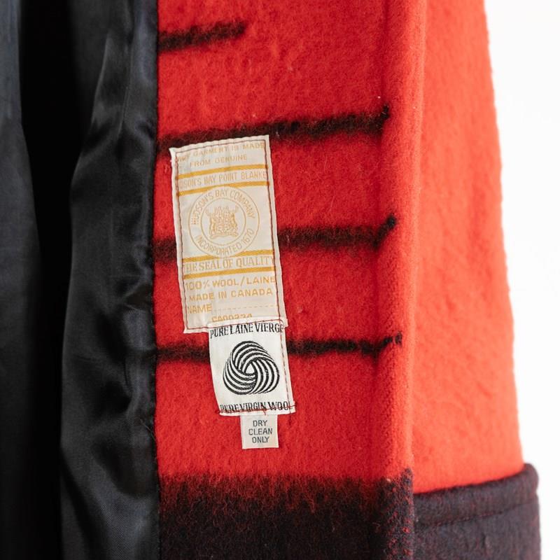 These coats are known as ‘point blanket’ coats. There was a long history in Canada and the Northern US of the European settlers trading wool blankets for fur pelts with Native American and First Nation tribes from the 16th century onwards. In the 1780s, the Hudson Bay Co. started selling these blankets more formally; they had distinctive stripes known as ‘points’ which determined the size and other characteristics. As the fur trade continued, the company sold these blankets to European traders and First Nations people alike. Often, they were just used as blankets, but the purchasers started to wear them more as garments with belts and buttons and toggles before people started making them into coats. In the early 20th Century, the company started formally making and selling wool coats from its department stores.