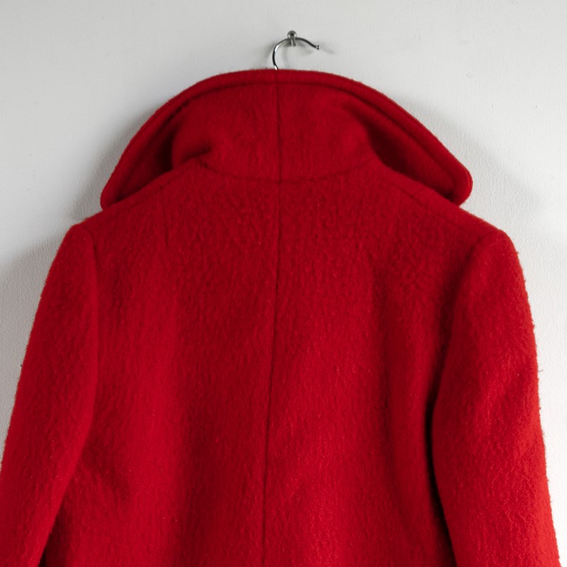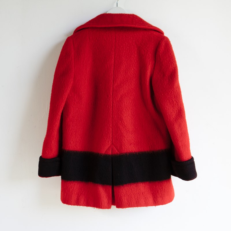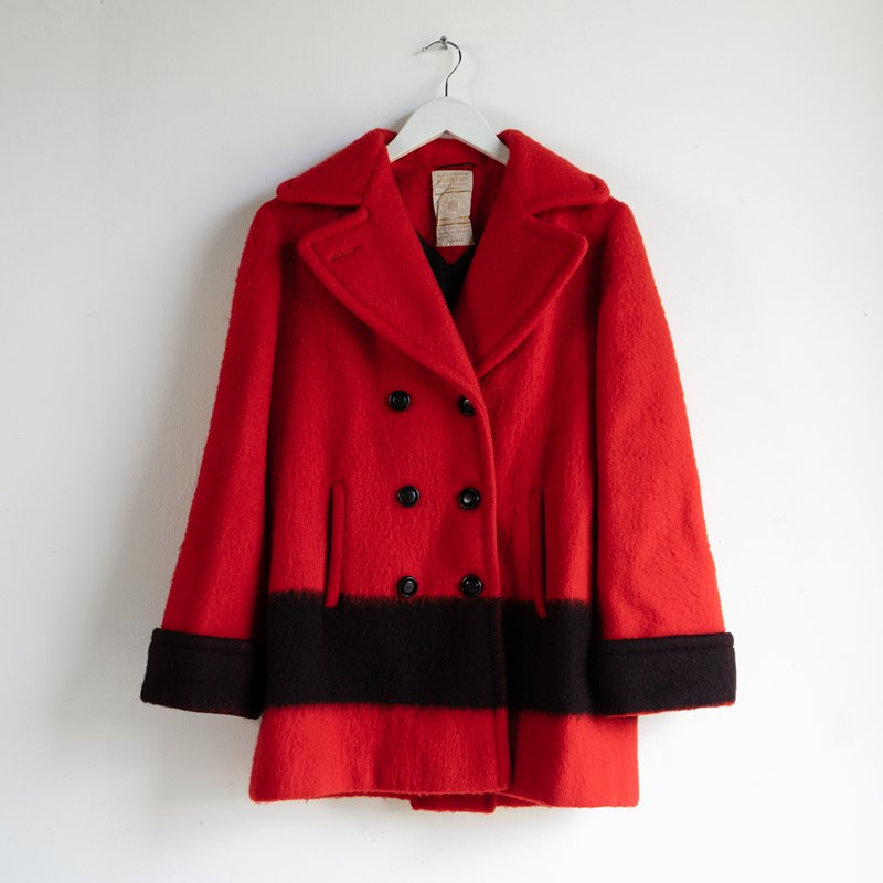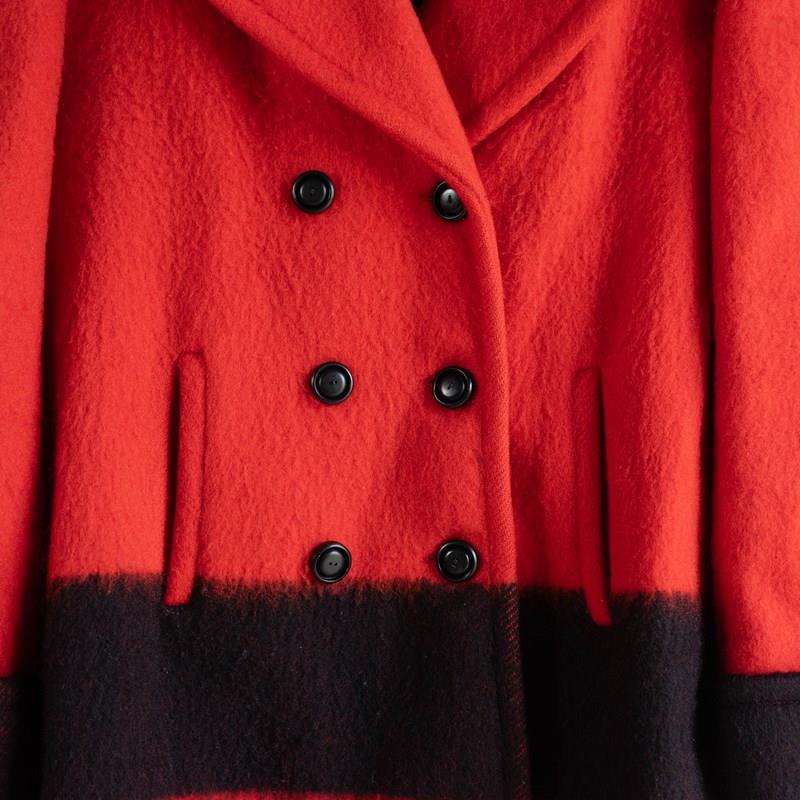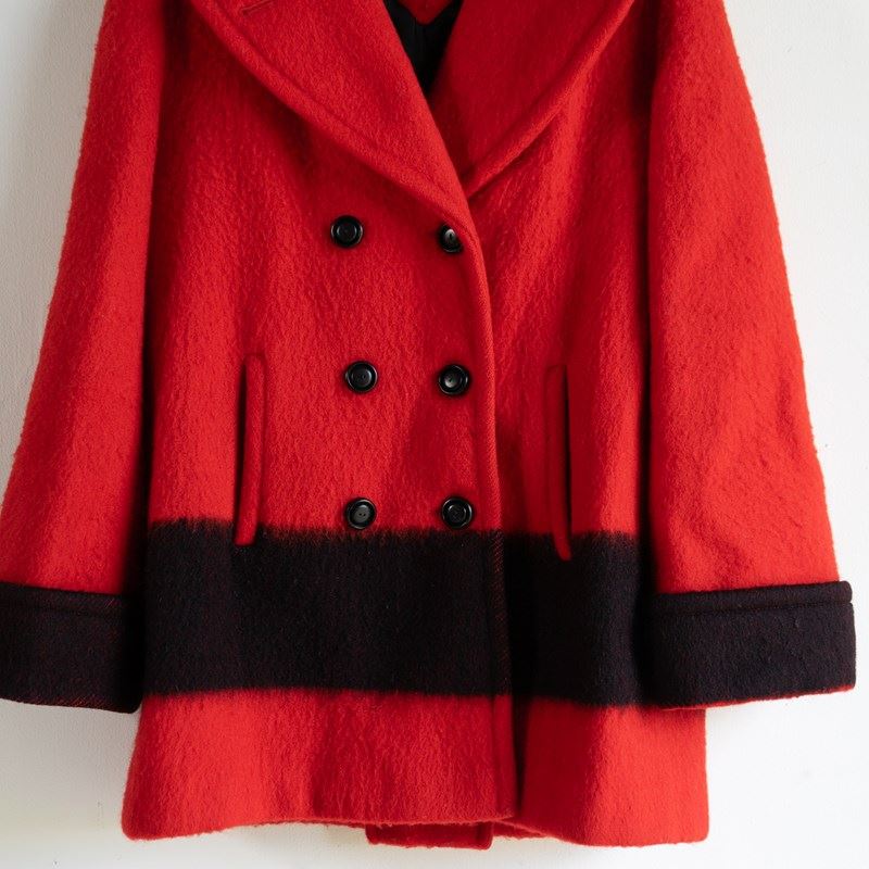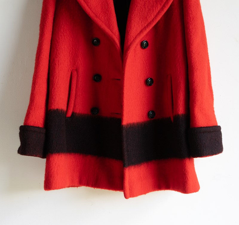 A high-quality and stylish pea coat, largely in red with a wide black stripe that runs along the lower section and matches up with the cuffs. It is double-breasted with six black buttons and wide lapels.
