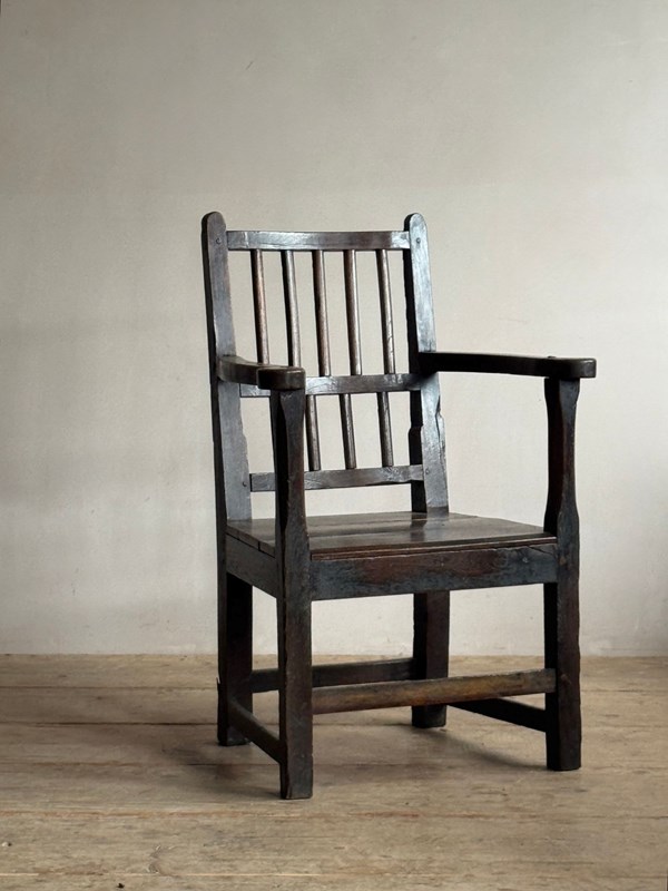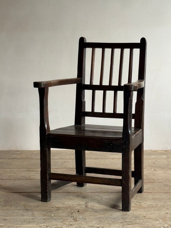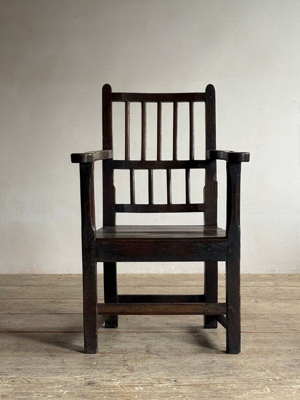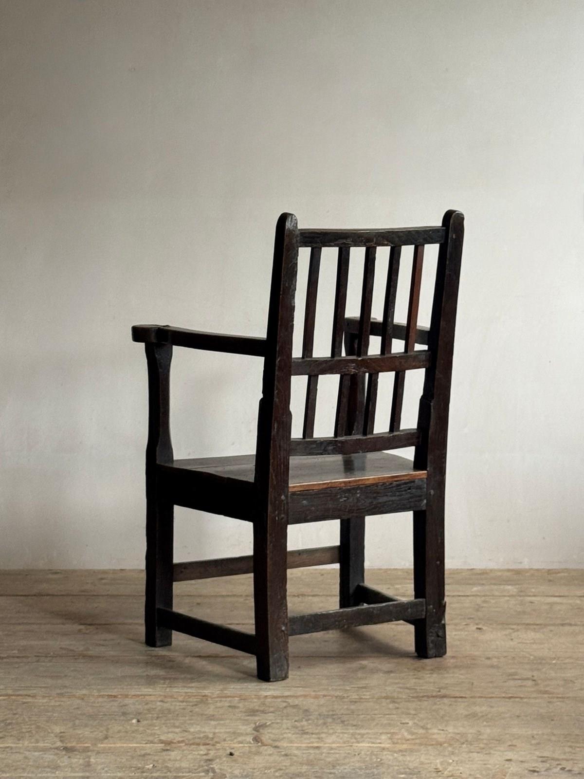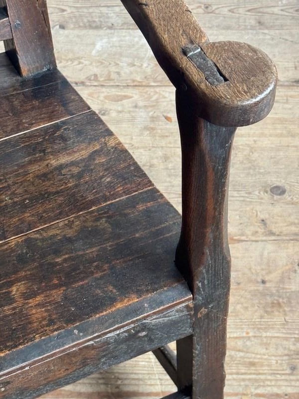 A primitive 18thC Welsh oak armchair. Good colour and sturdy, one repair to back leg.
