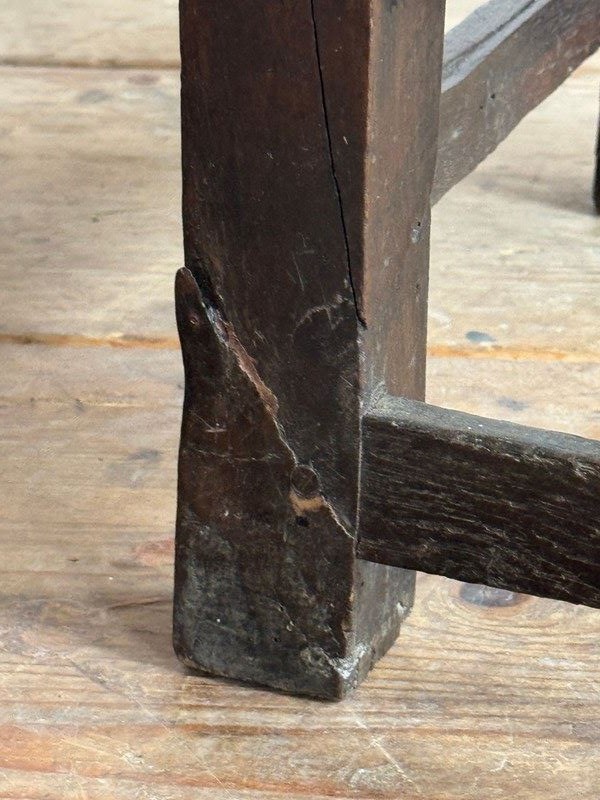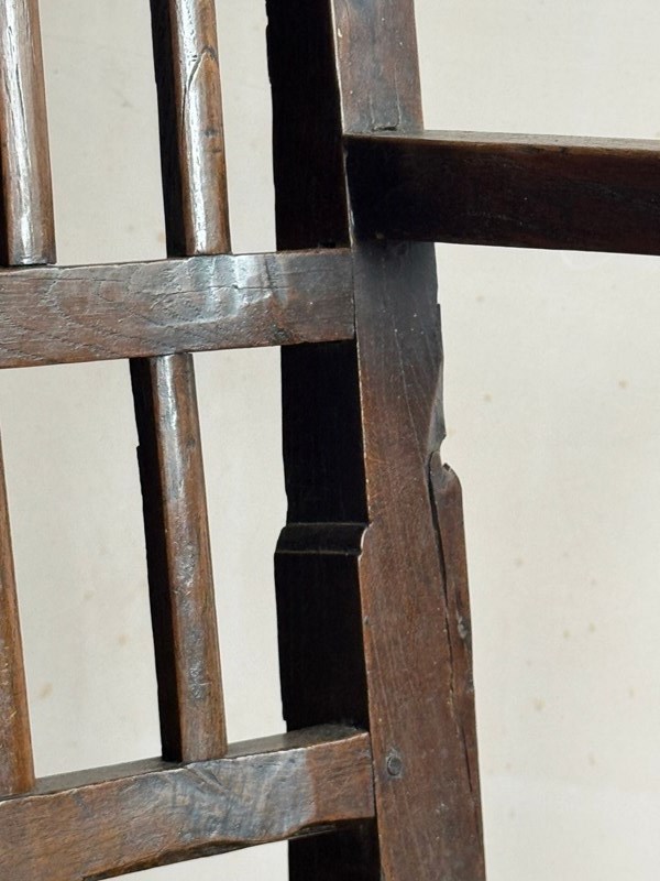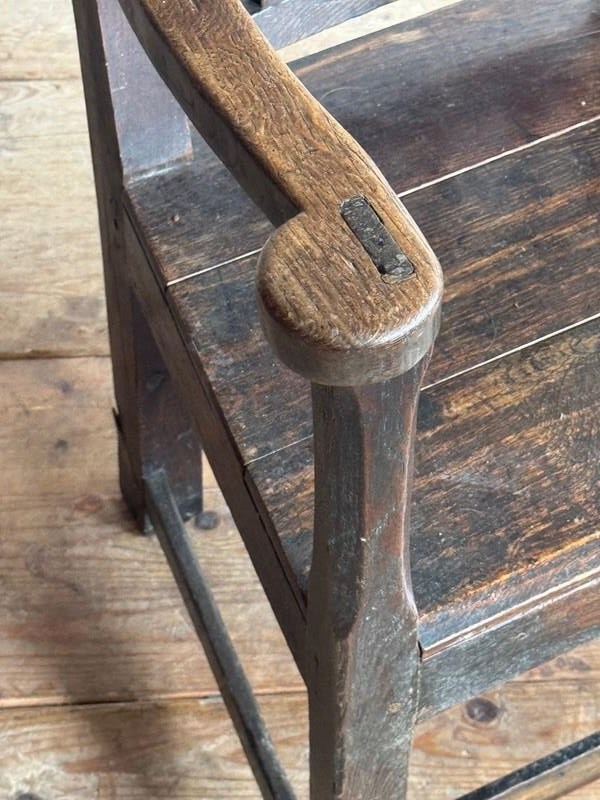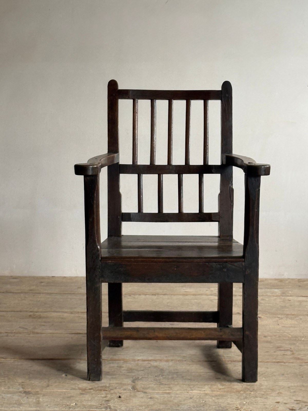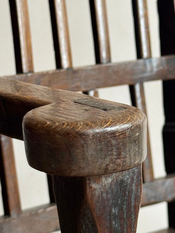 A primitive 18thC Welsh oak armchair. Good colour and sturdy, one repair to back leg.