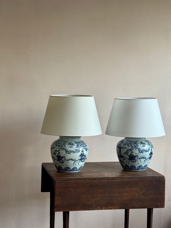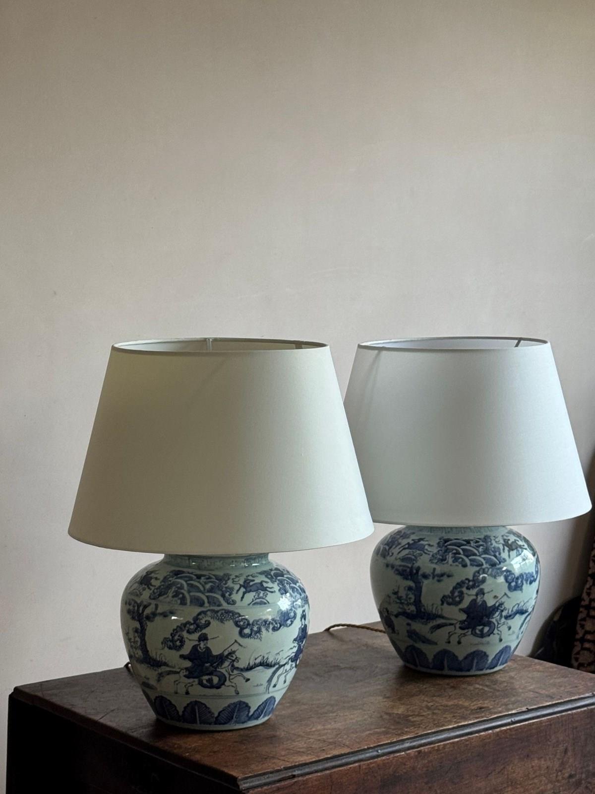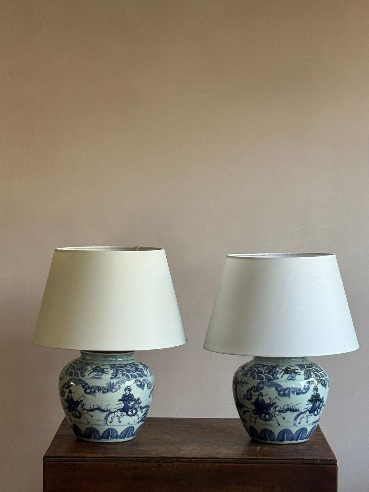 A pair of 20thC Chinese blue and white porcelain vases wired up as table lamps. Dimensions; H exc shade 30cm