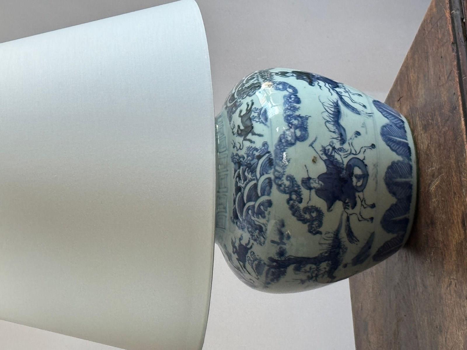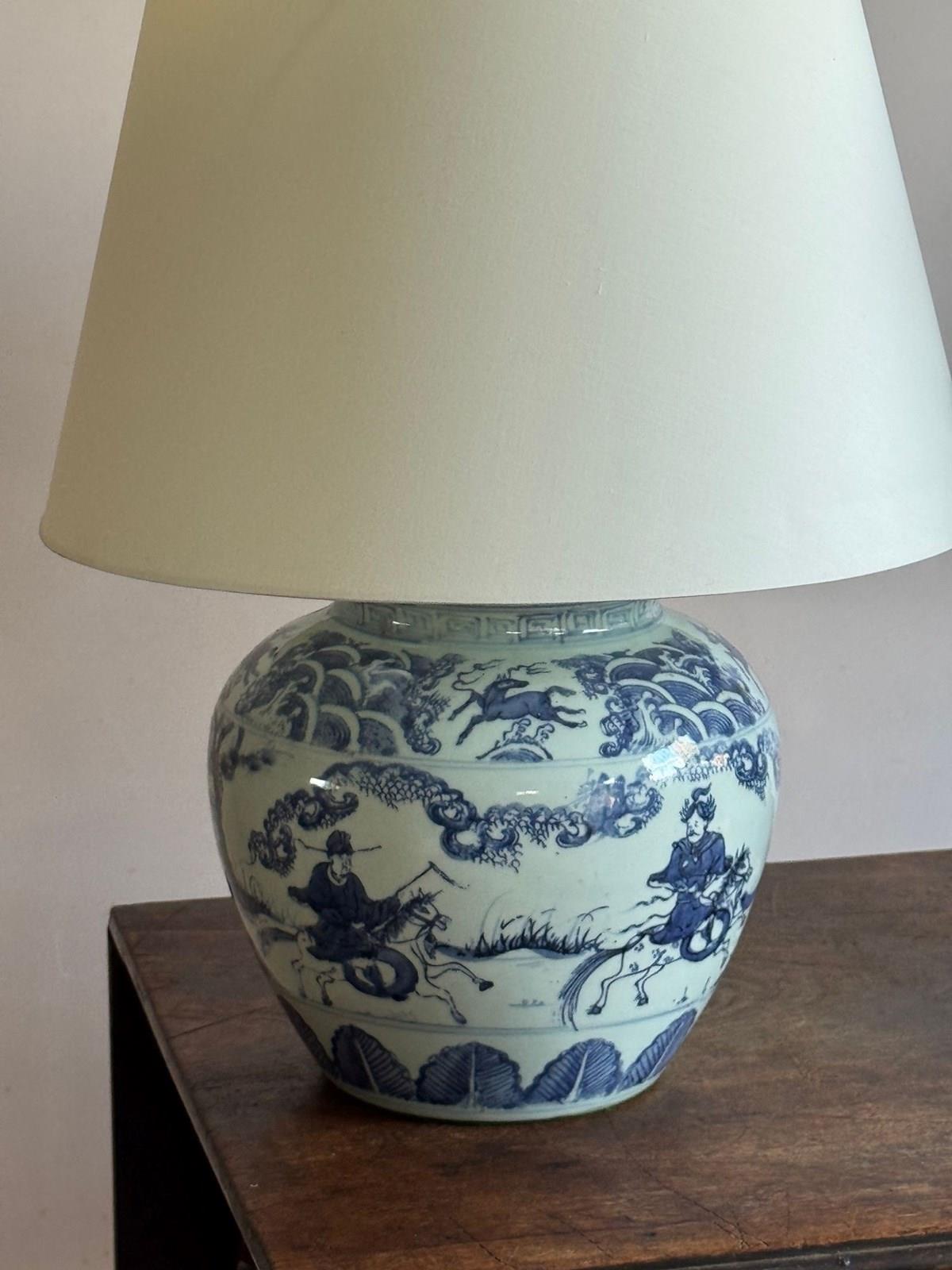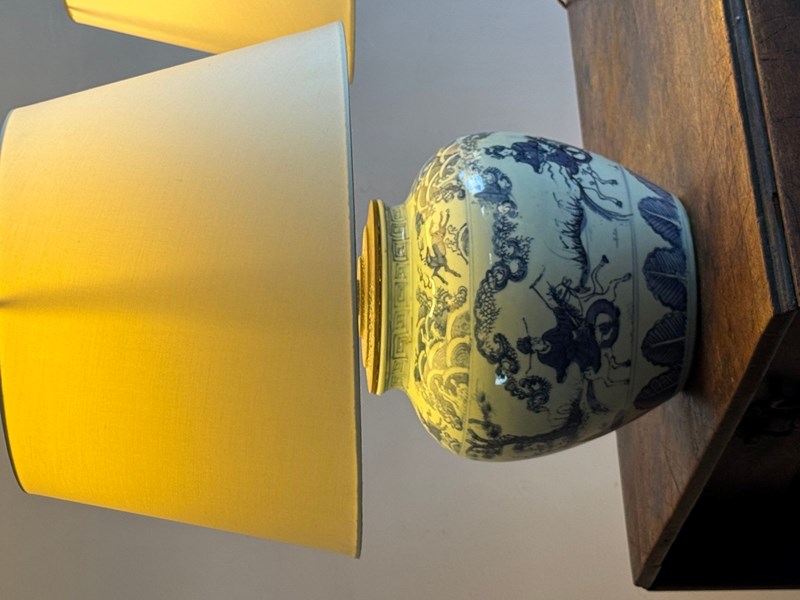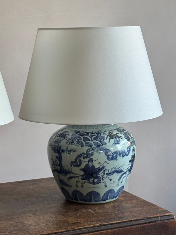A pair of 20thC Chinese blue and white porcelain vases wired up as table lamps. Dimensions; H exc shade 30cm
