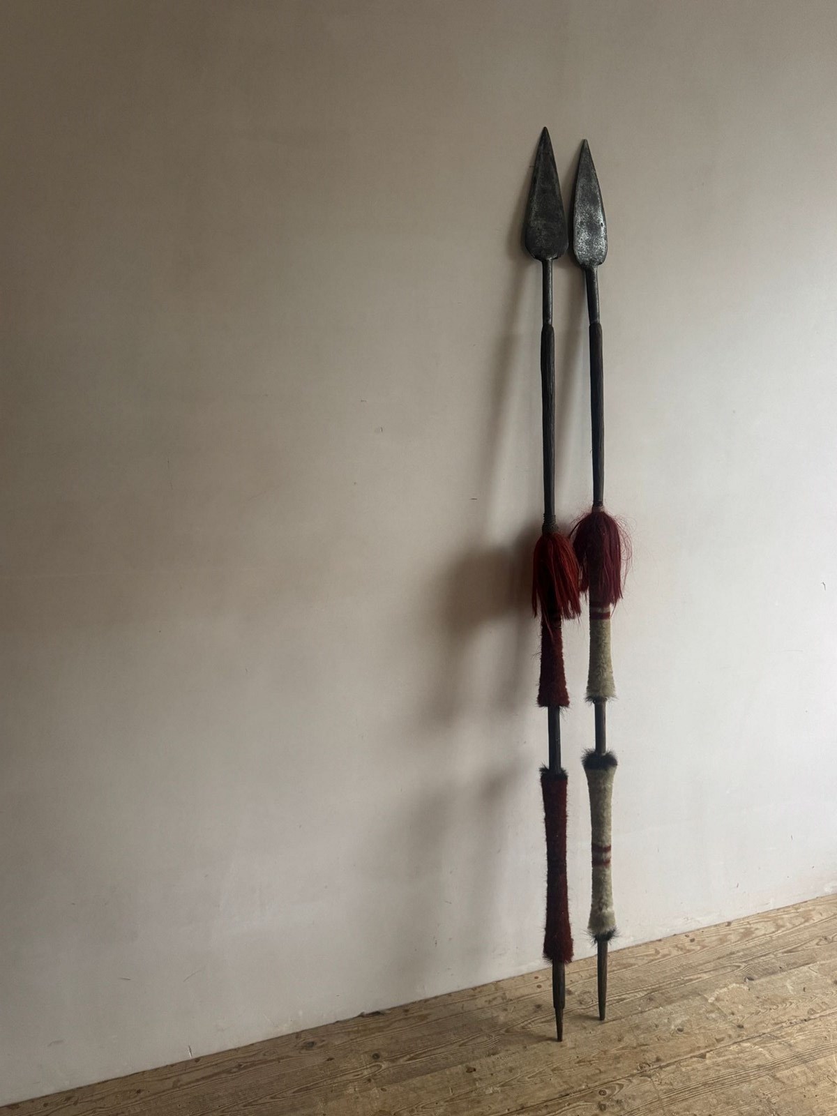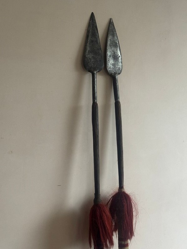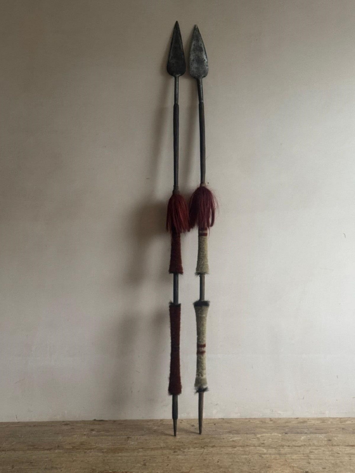Two Naga spears with dyed tufted hair decoration to the shaft and leaf shaped blades. Early 20thC Myanmar Dimensions, 174cm Long