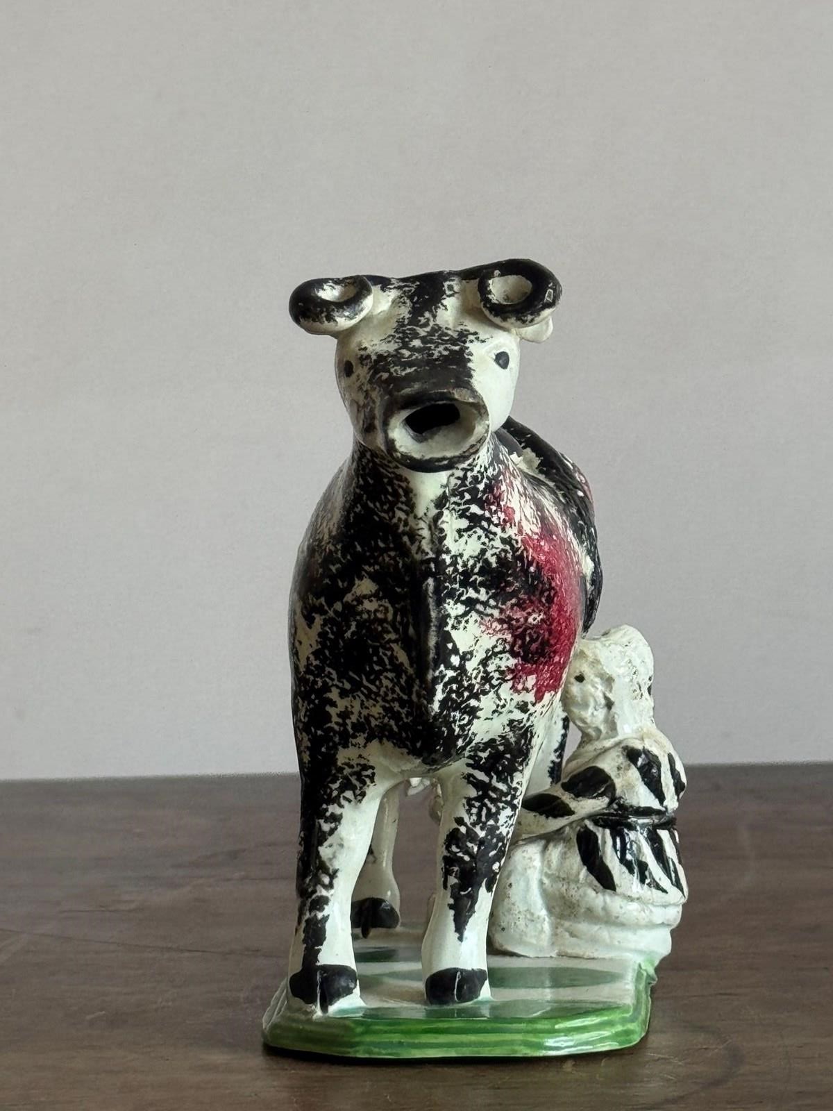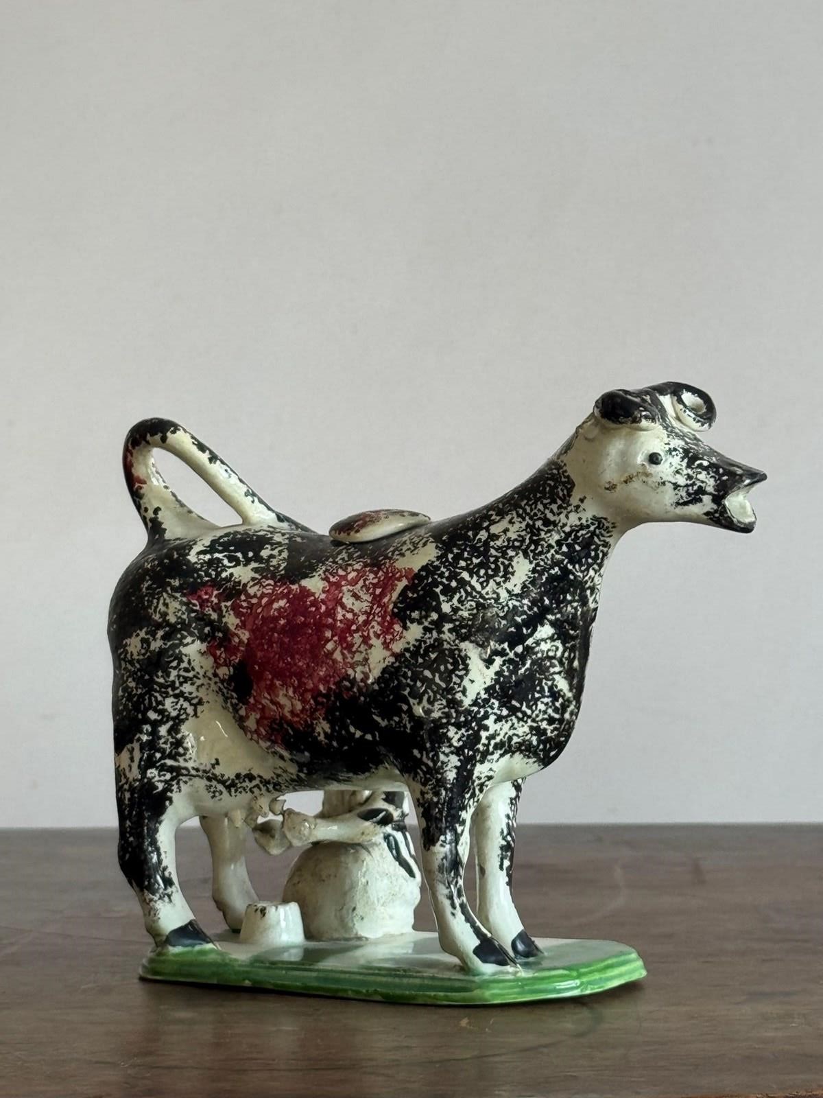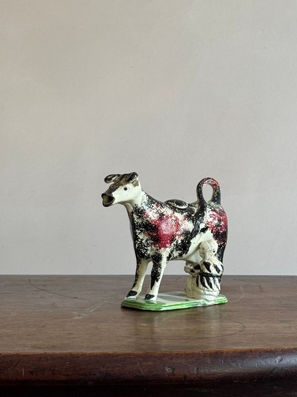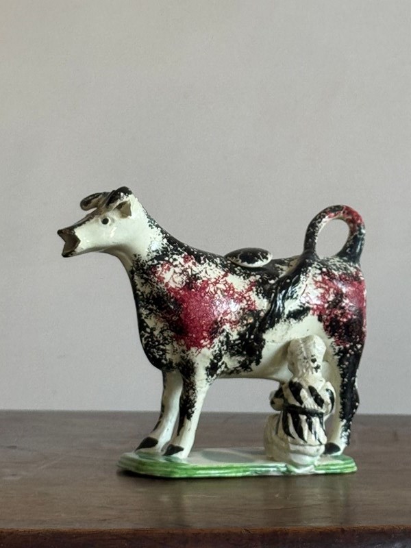 An English (probably Staffordshire) pottery prattware cow creamer with milk maid, sponge decorated in black and red. Dimensions: H 11cm W 18cm D 6cm