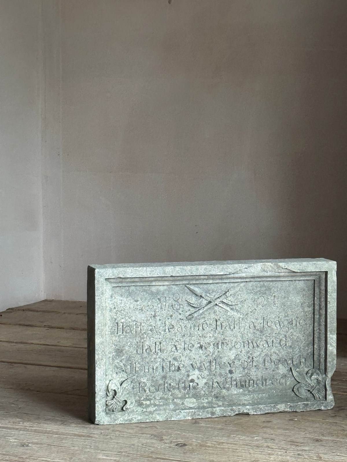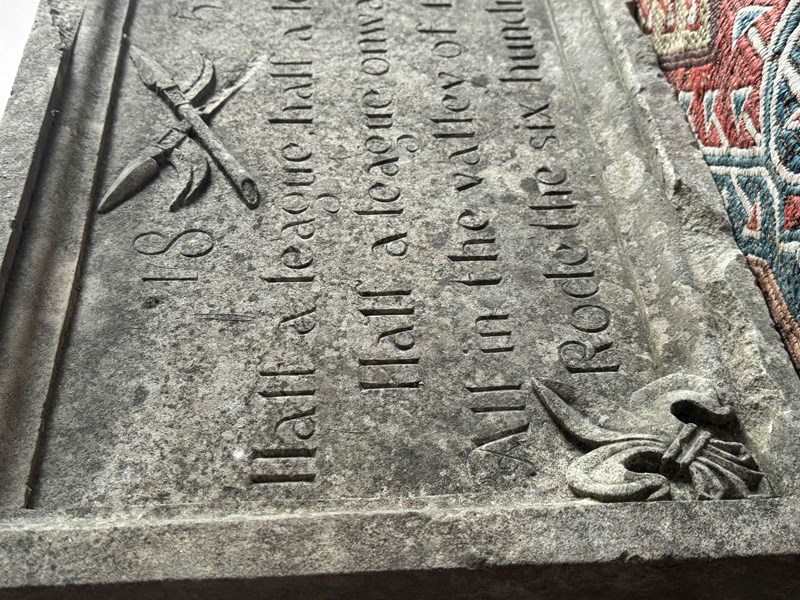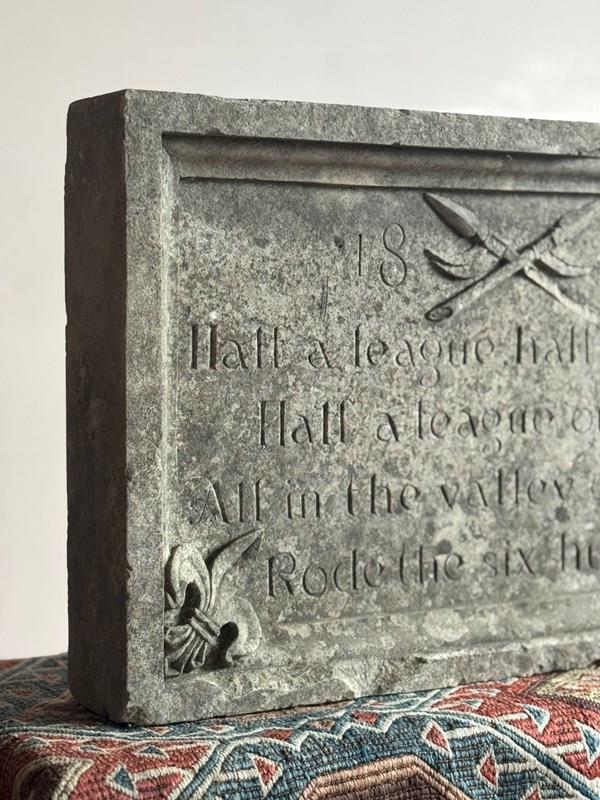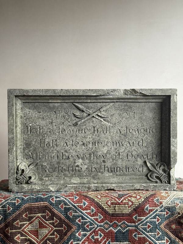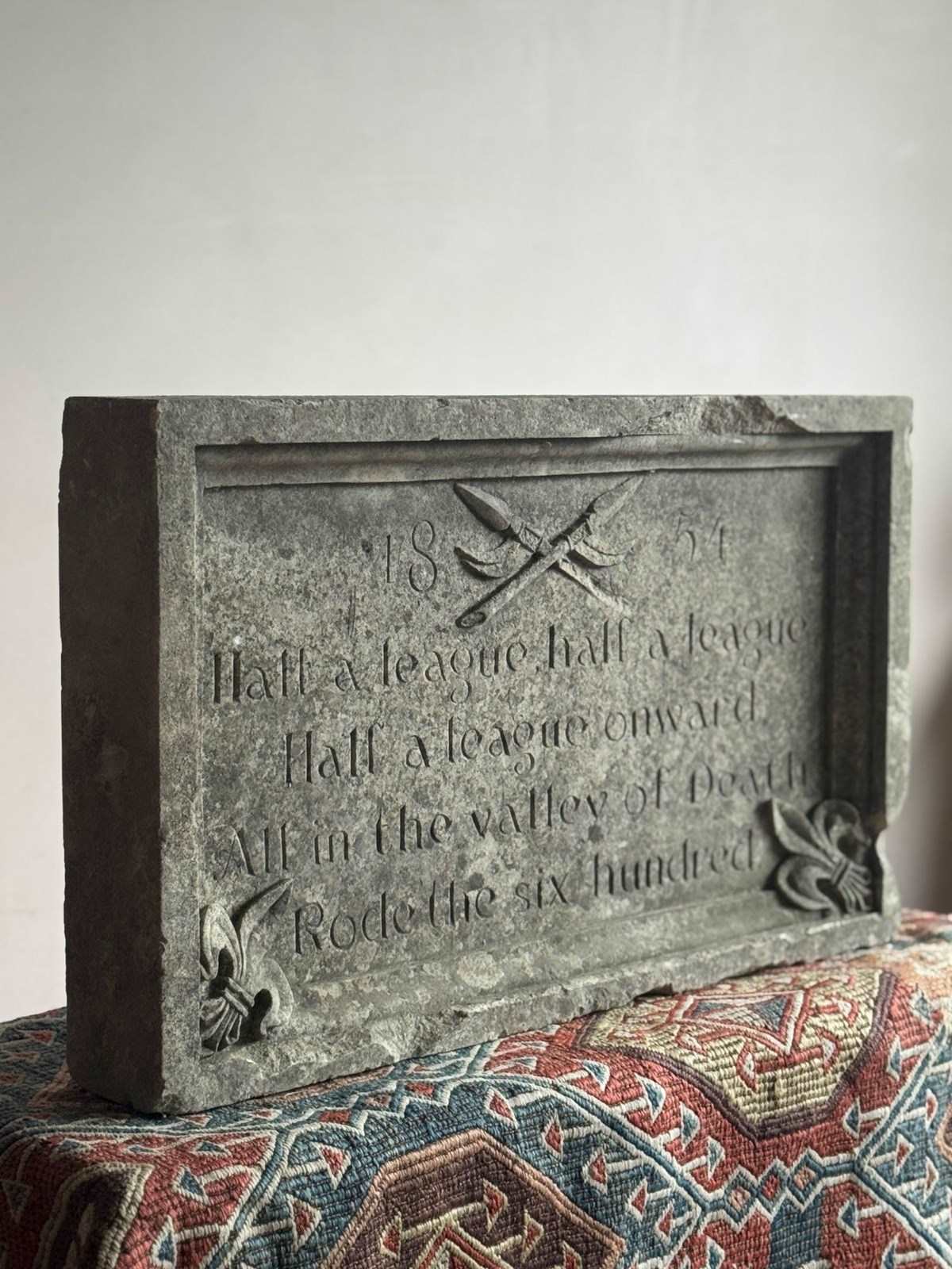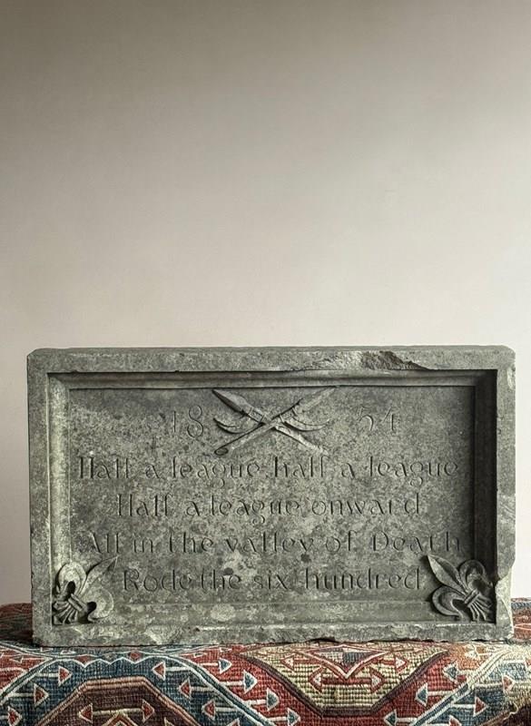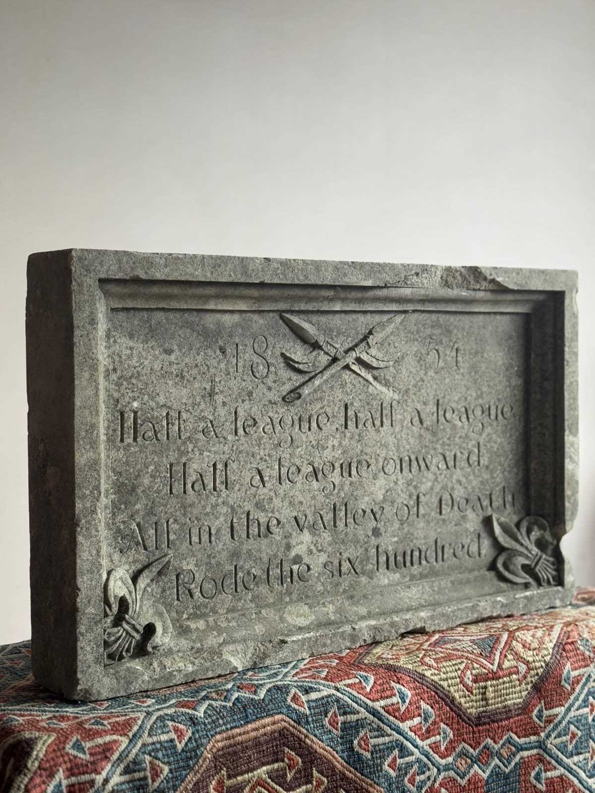 A carved Portland stone plaque with an inscription of the first verse of the poem The Charge of the Light Brigade