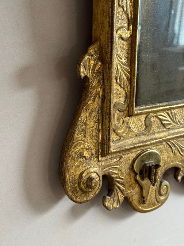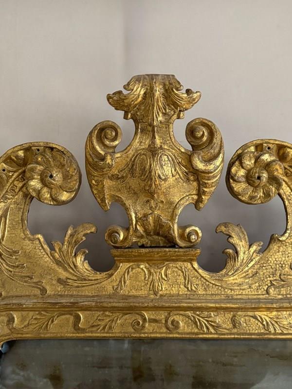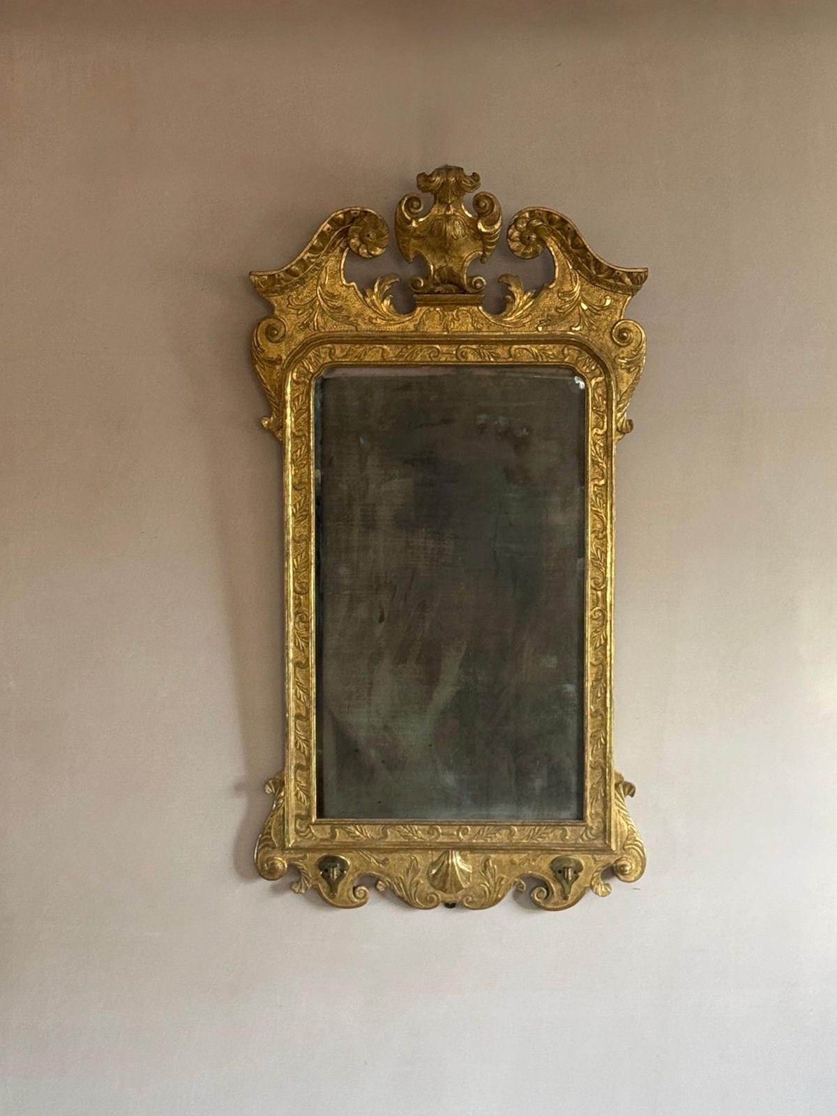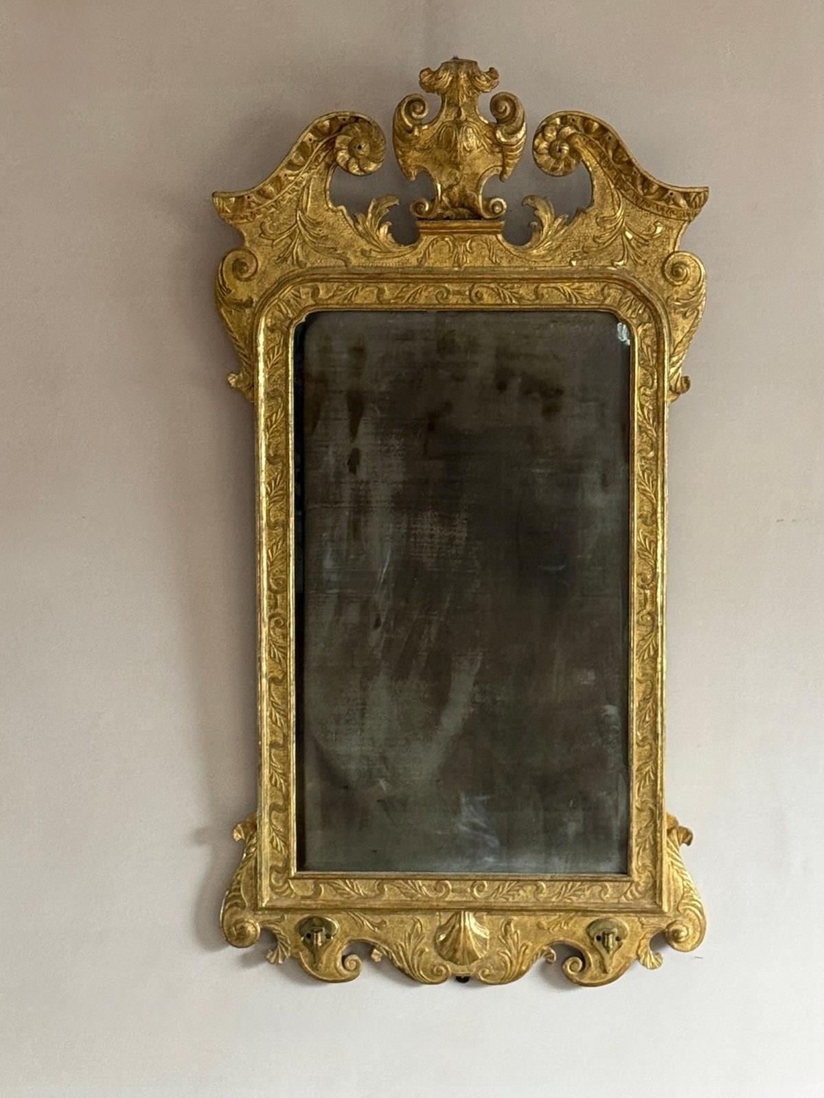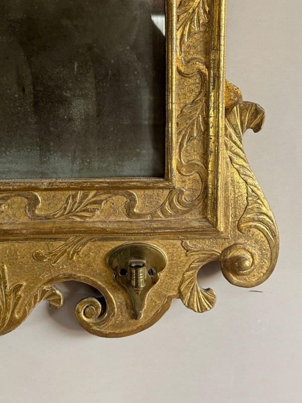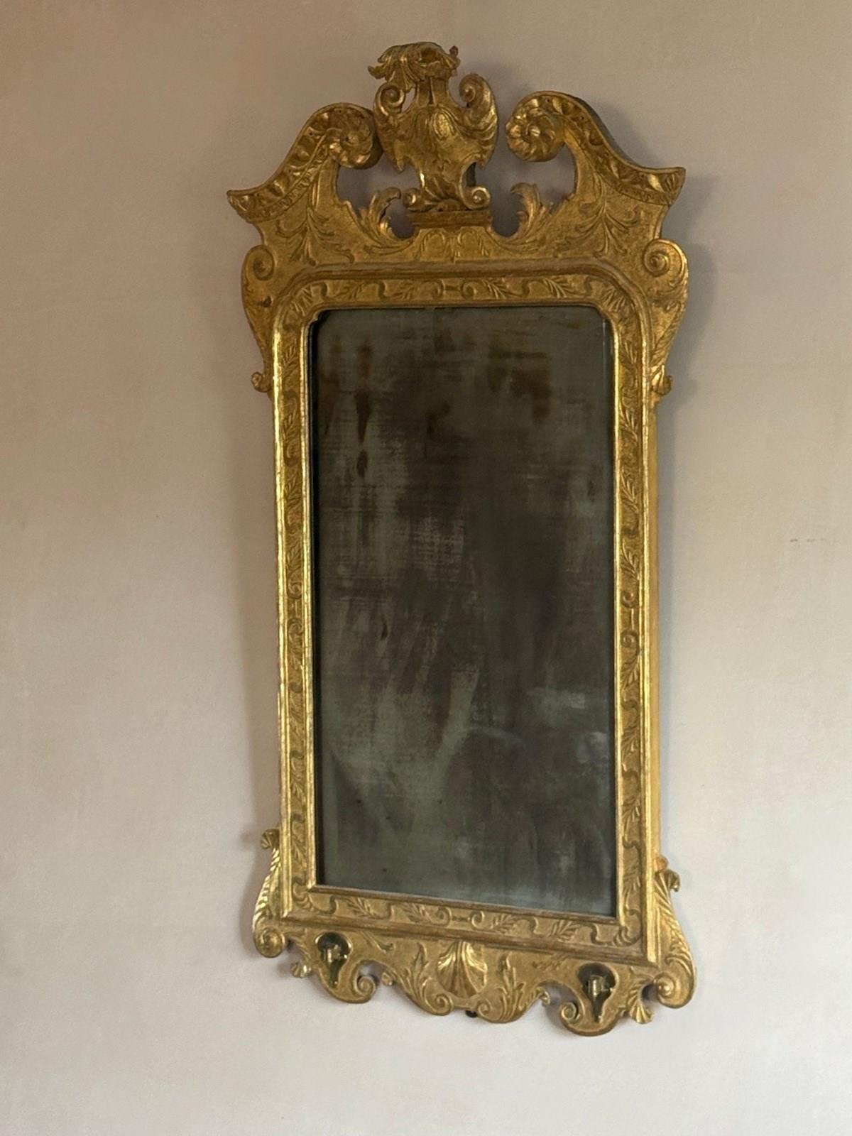A George II gilt wood mirror with broken swan pediment, large cartouche, and a rectangular bevelled plate; below is a carved scallop shell with brass candle sconces to either side.