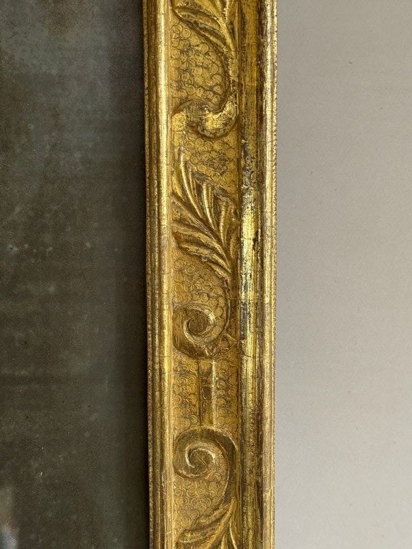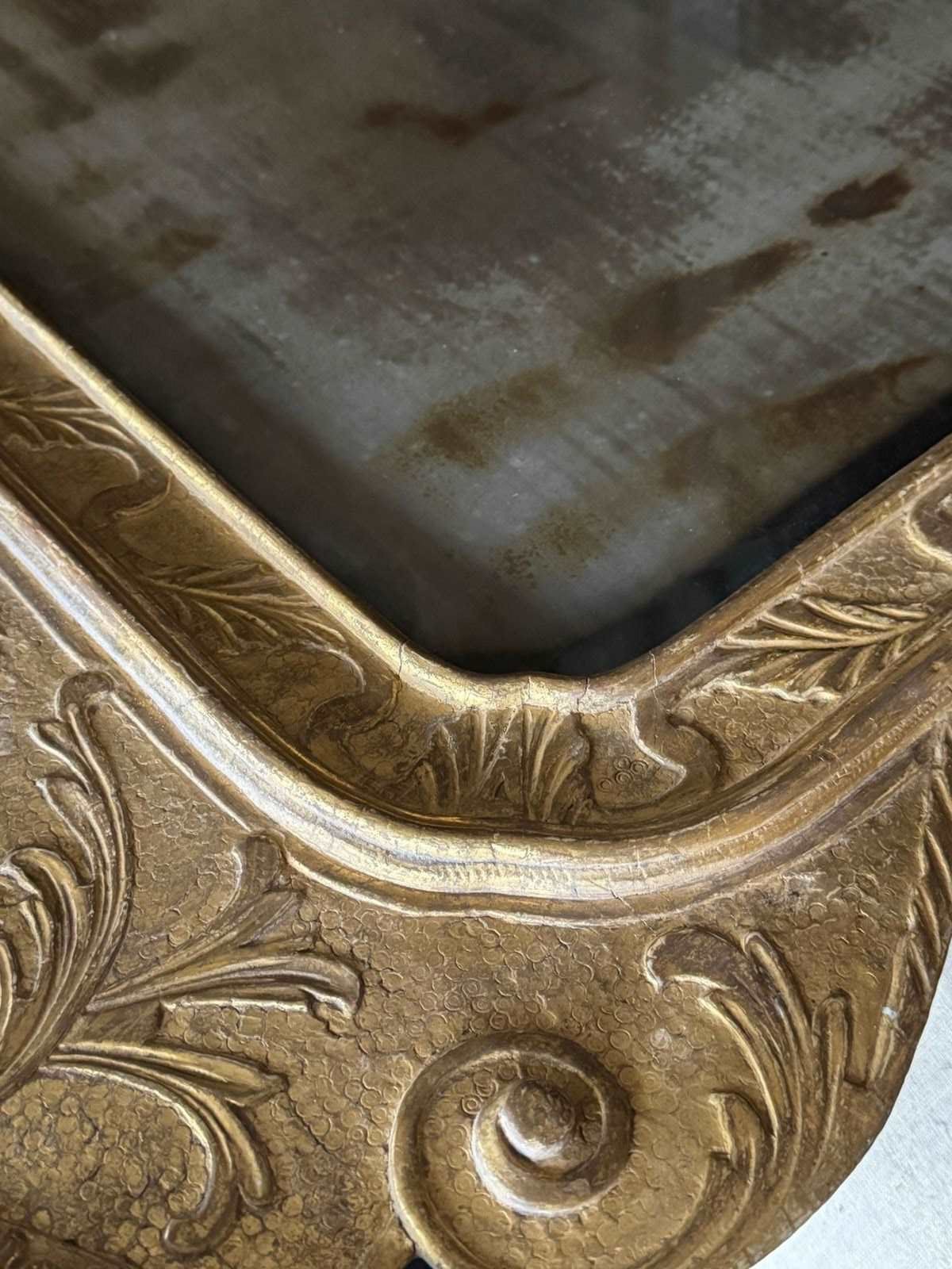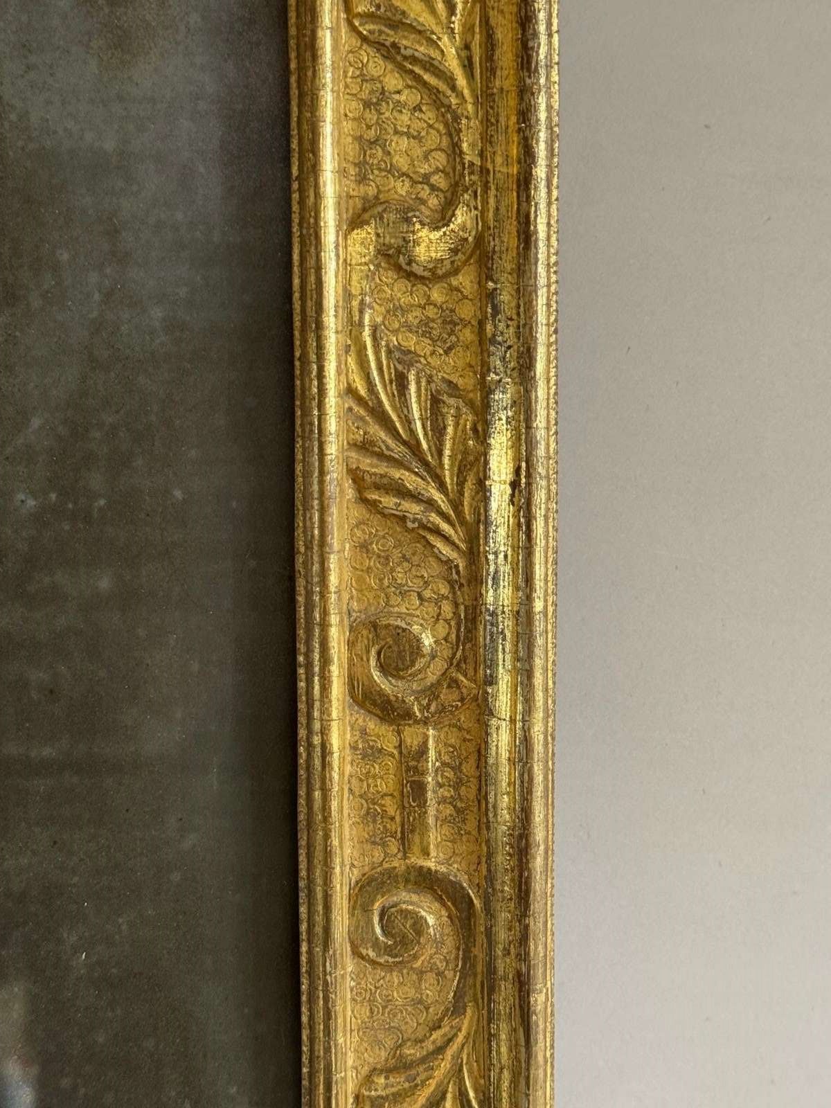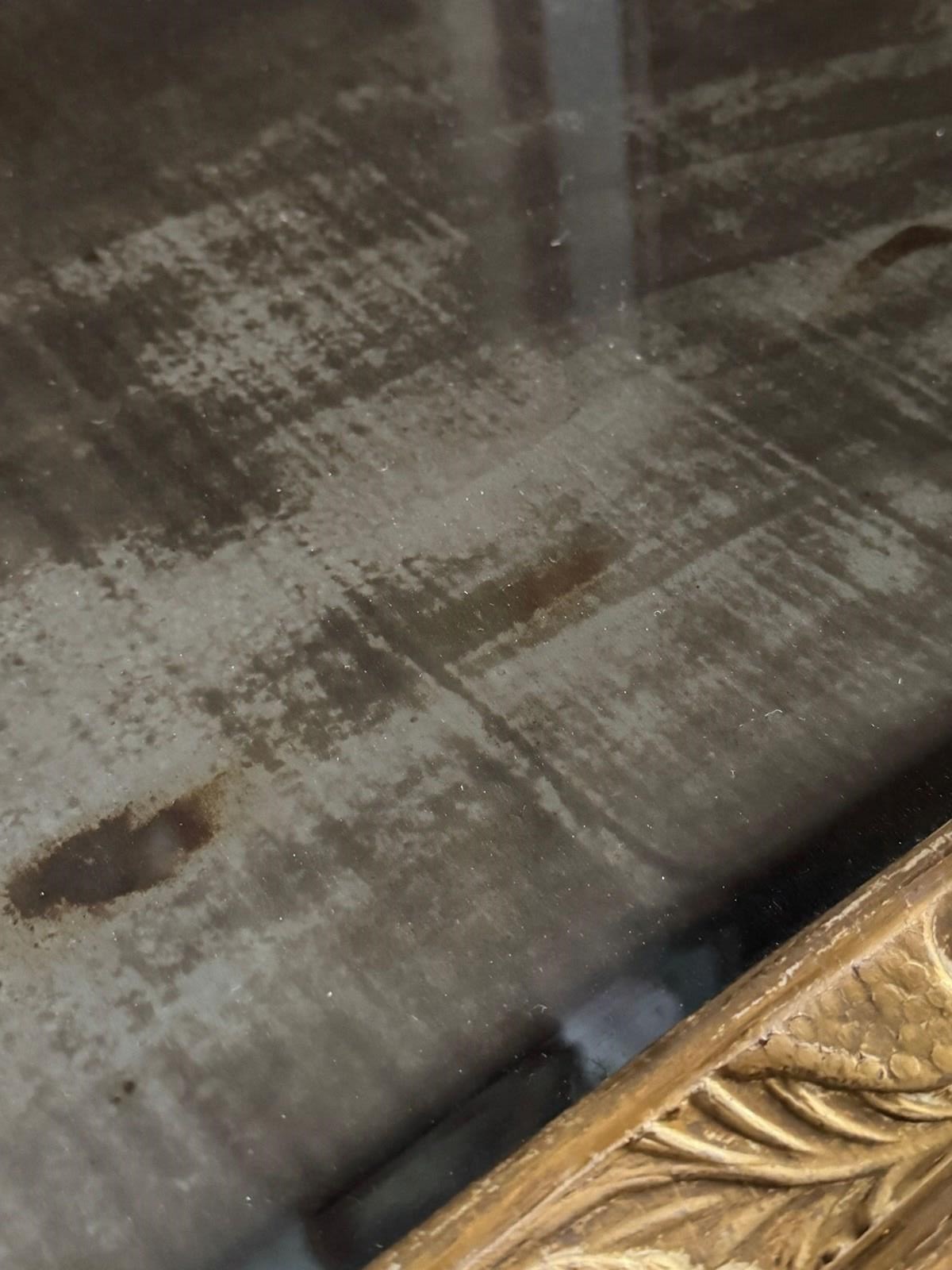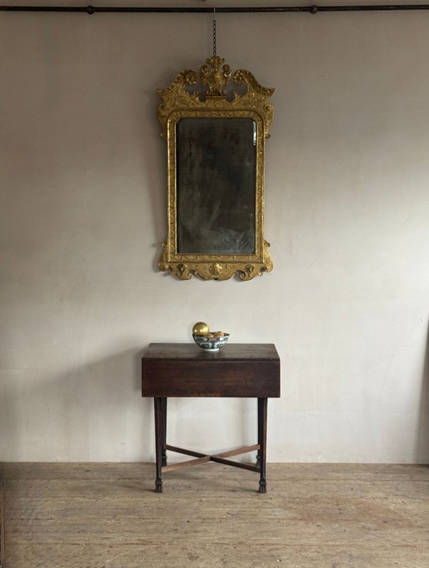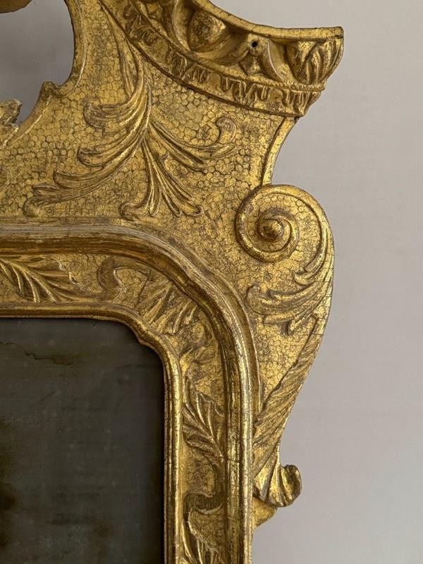 A George II gilt wood mirror with broken swan pediment, large cartouche, and a rectangular bevelled plate; below is a carved scallop shell with brass candle sconces to either side.