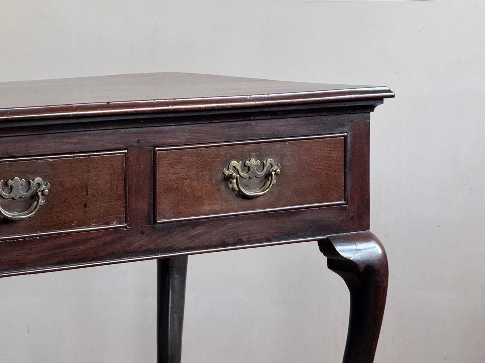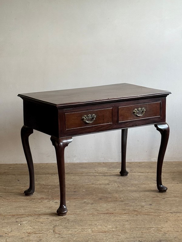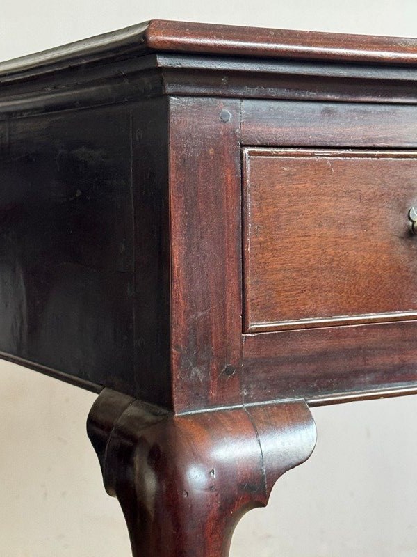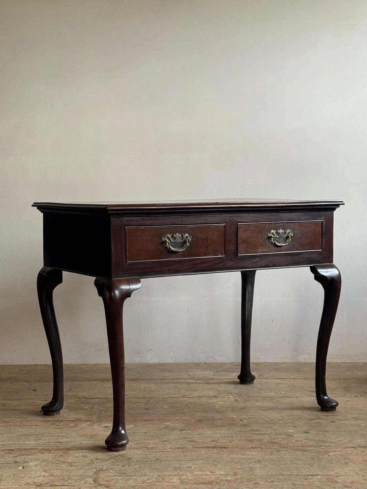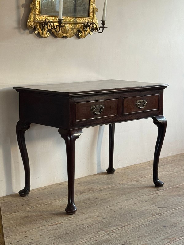 A good quality 18thC red walnut two drawer side table, raised on four cabriole legs with pad feet. A strong masculine looking piece of English furniture. C.1740-50
