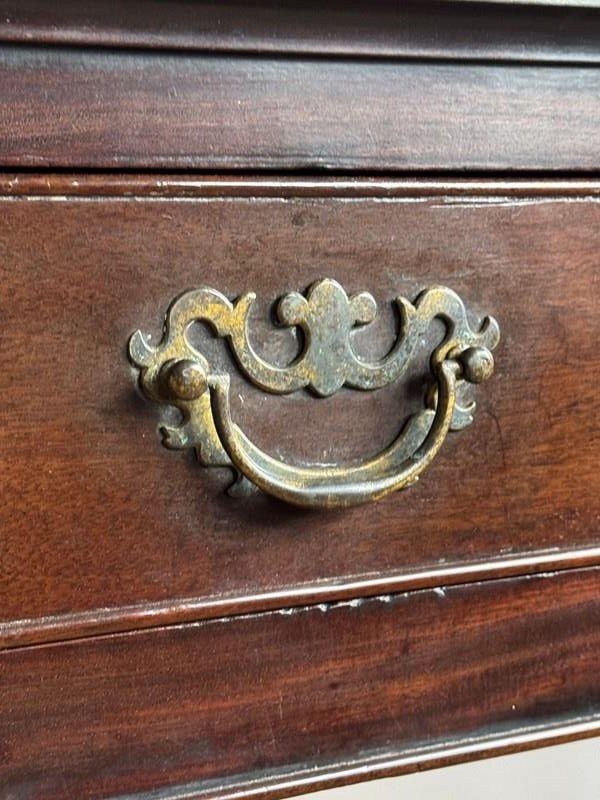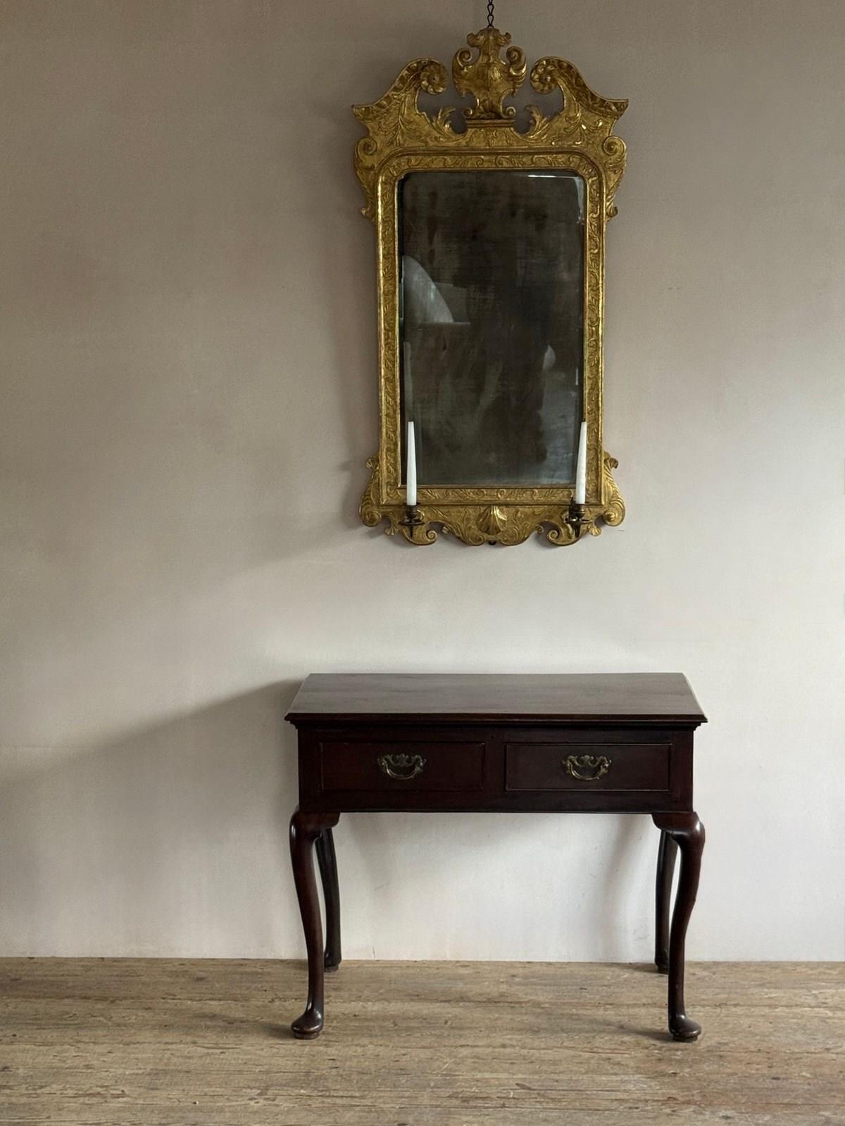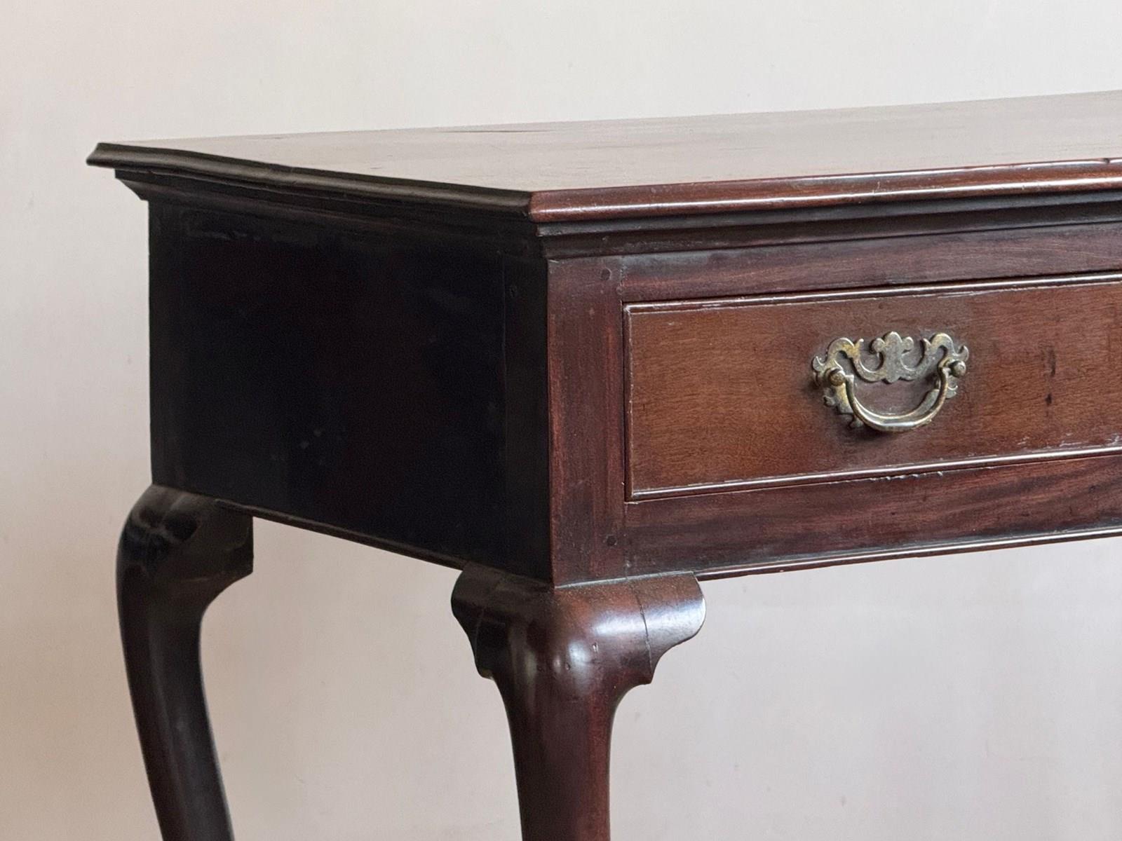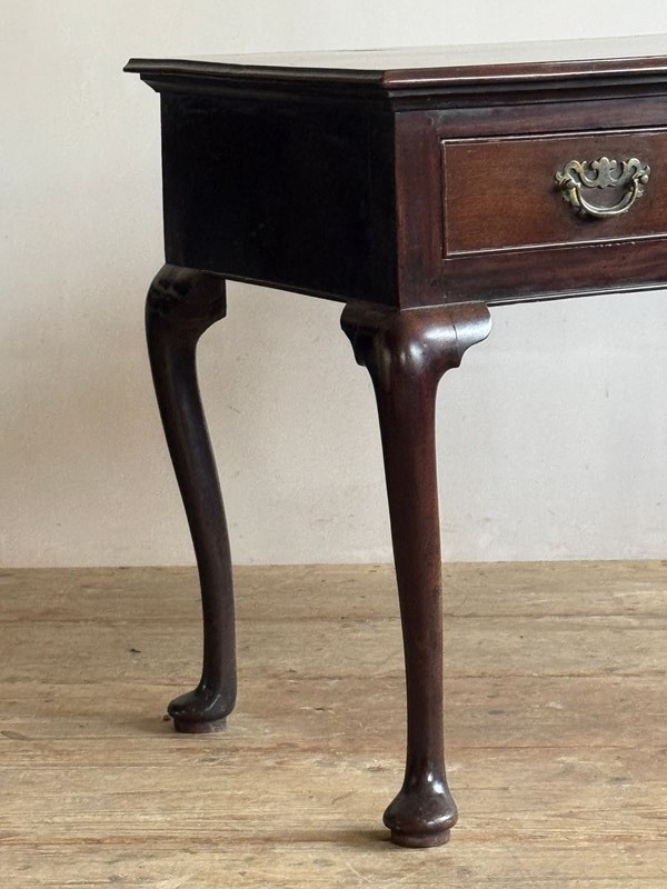 A good quality 18thC red walnut two drawer side table, raised on four cabriole legs with pad feet. A strong masculine looking piece of English furniture. C.1740-50