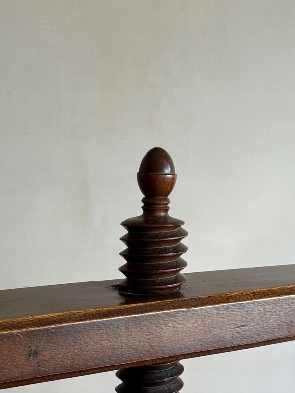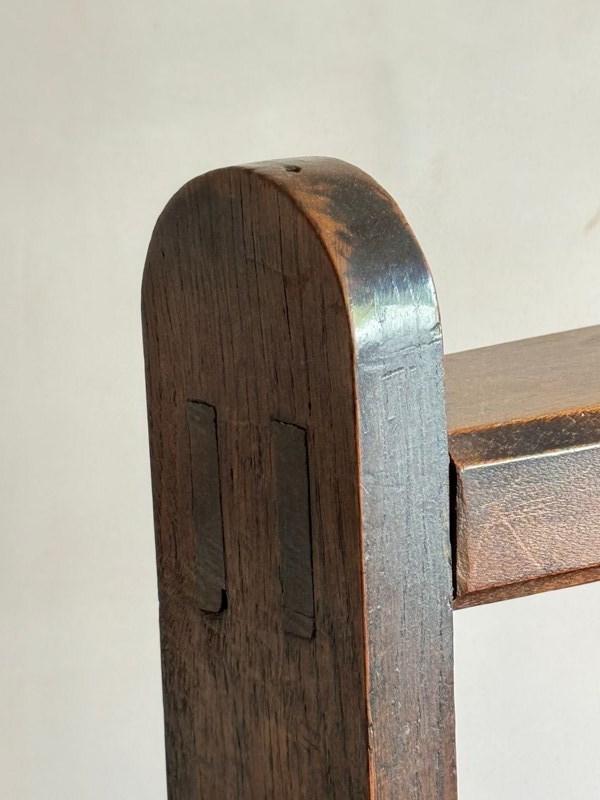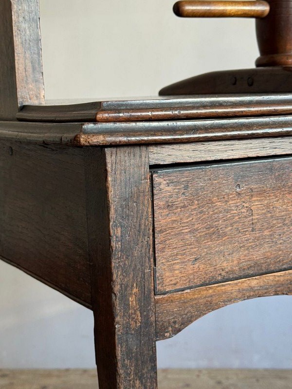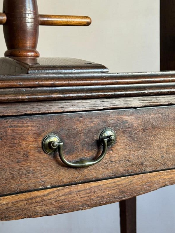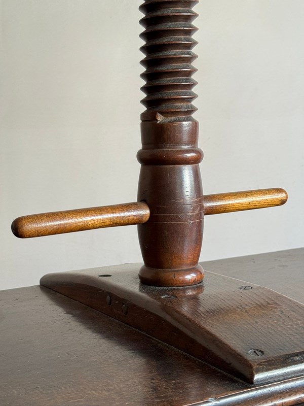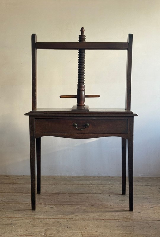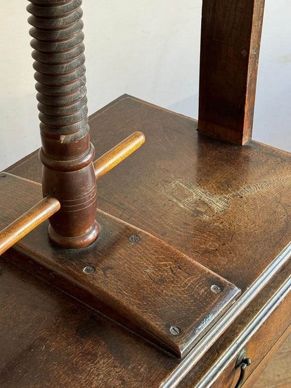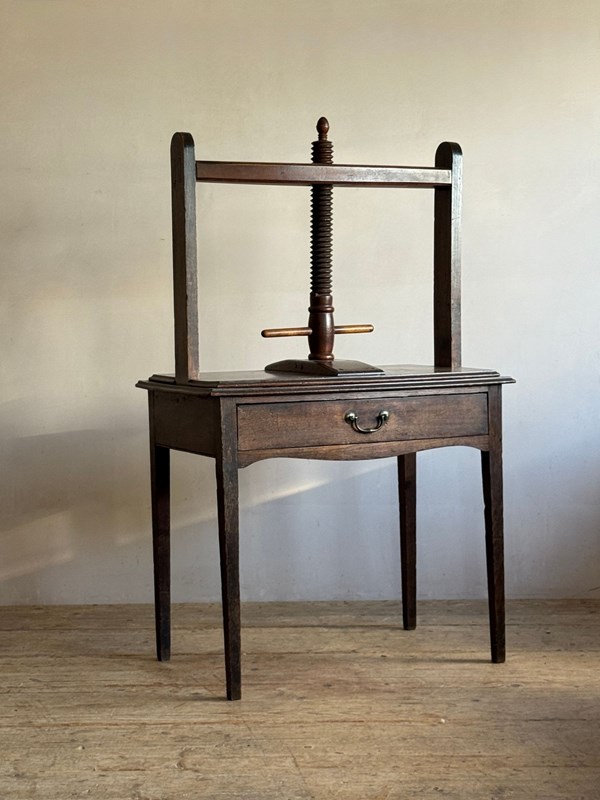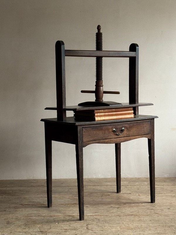 A useful, well drawn side table with single drawer and press top, originally used for books or maps etc. The screw and press frame is made from fine grained walnut. Some minor losses to the ebony stringing around the drawer.