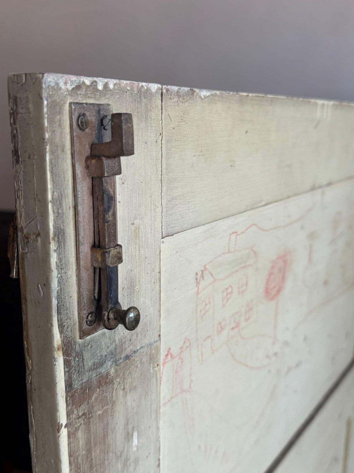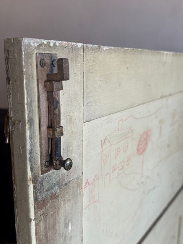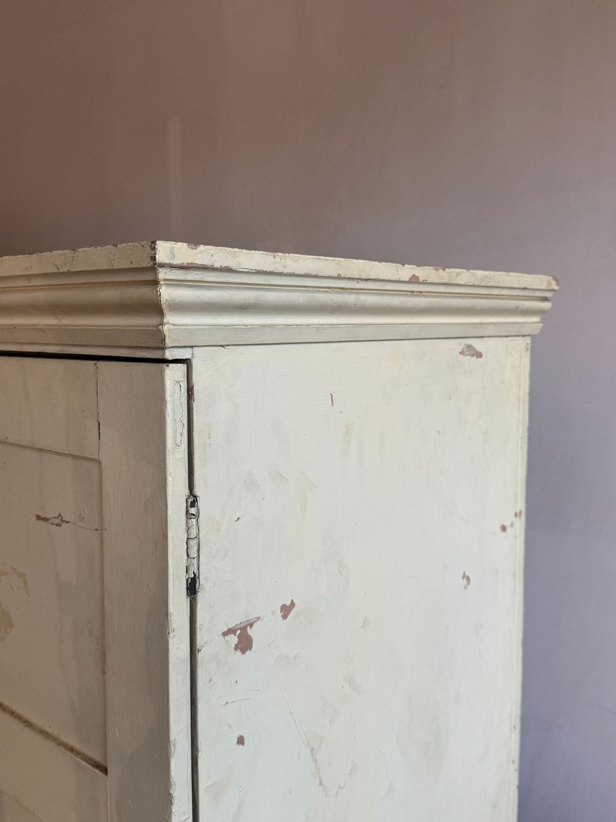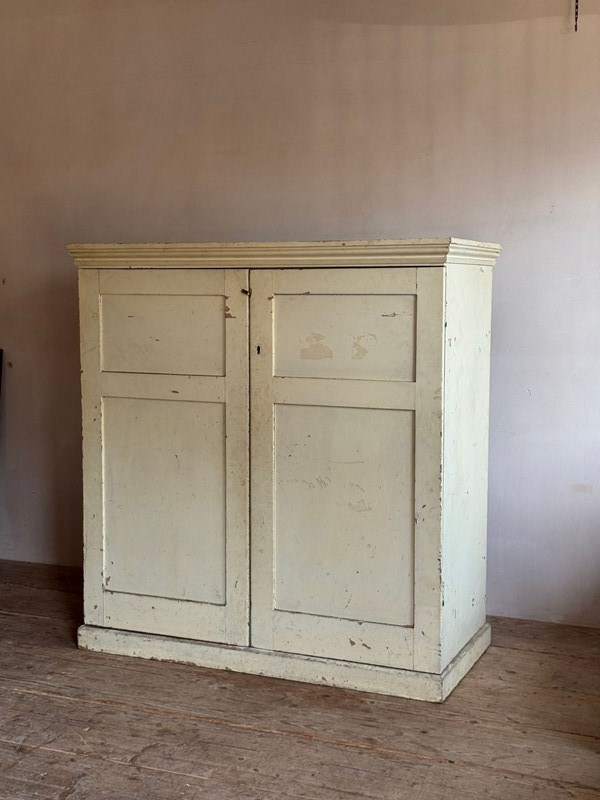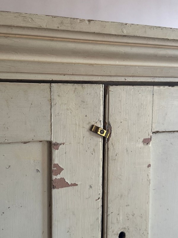 A useful 18thC painted pine cupboard. There is an original pink paint underneath the white. The interior has three fixed shelves and good original bolts. Dimensions: H 134cm