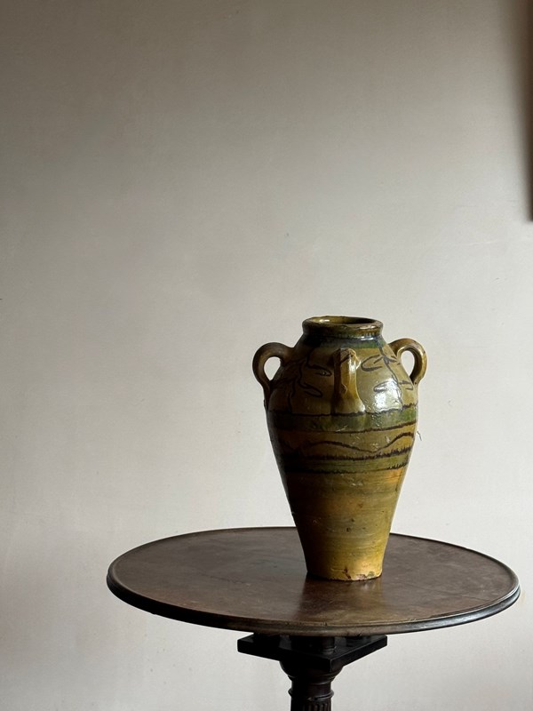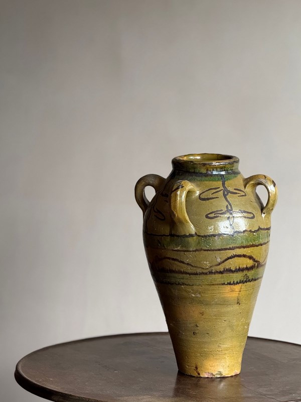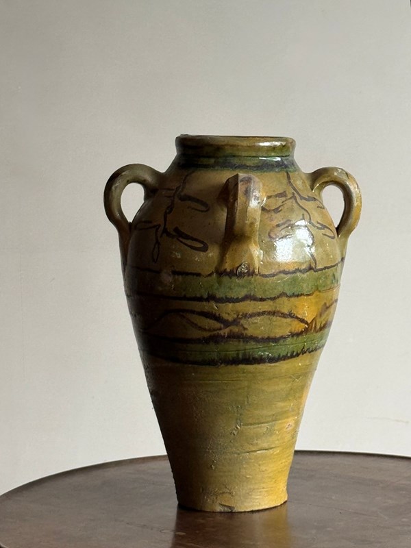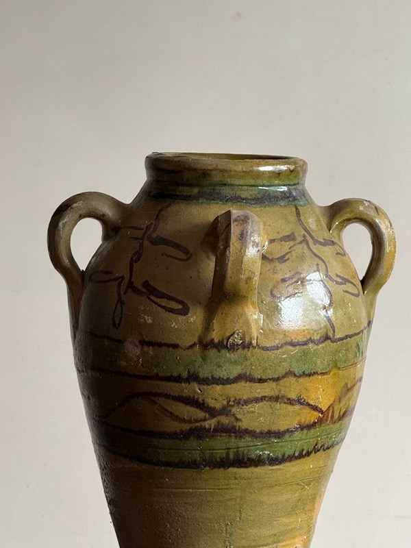 An olive green glazed and decorated vessel with four handles. C.1900 Southern European.