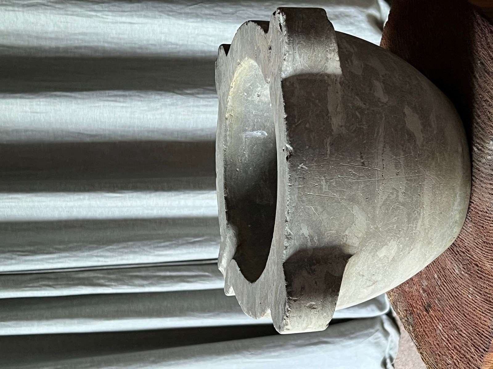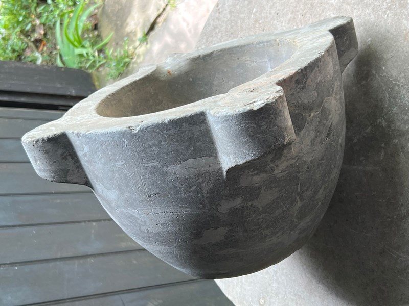 An antique light grey marble mortar, with four thick lugs and a pouring channel.