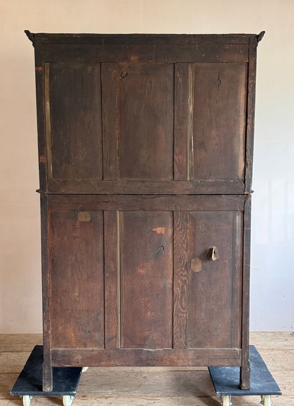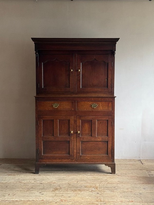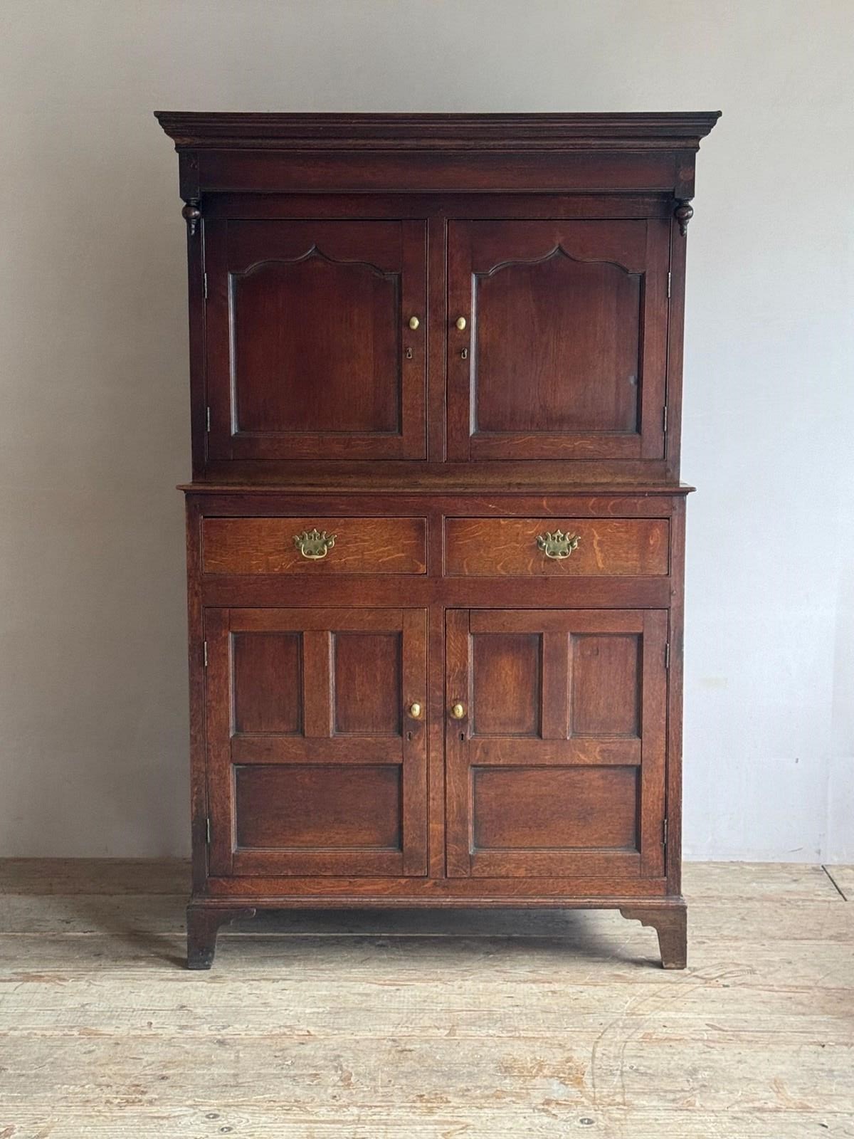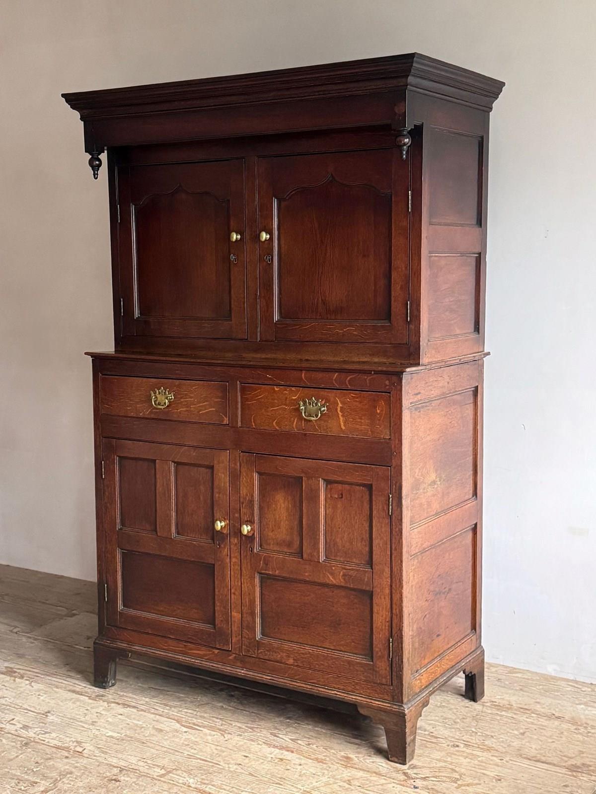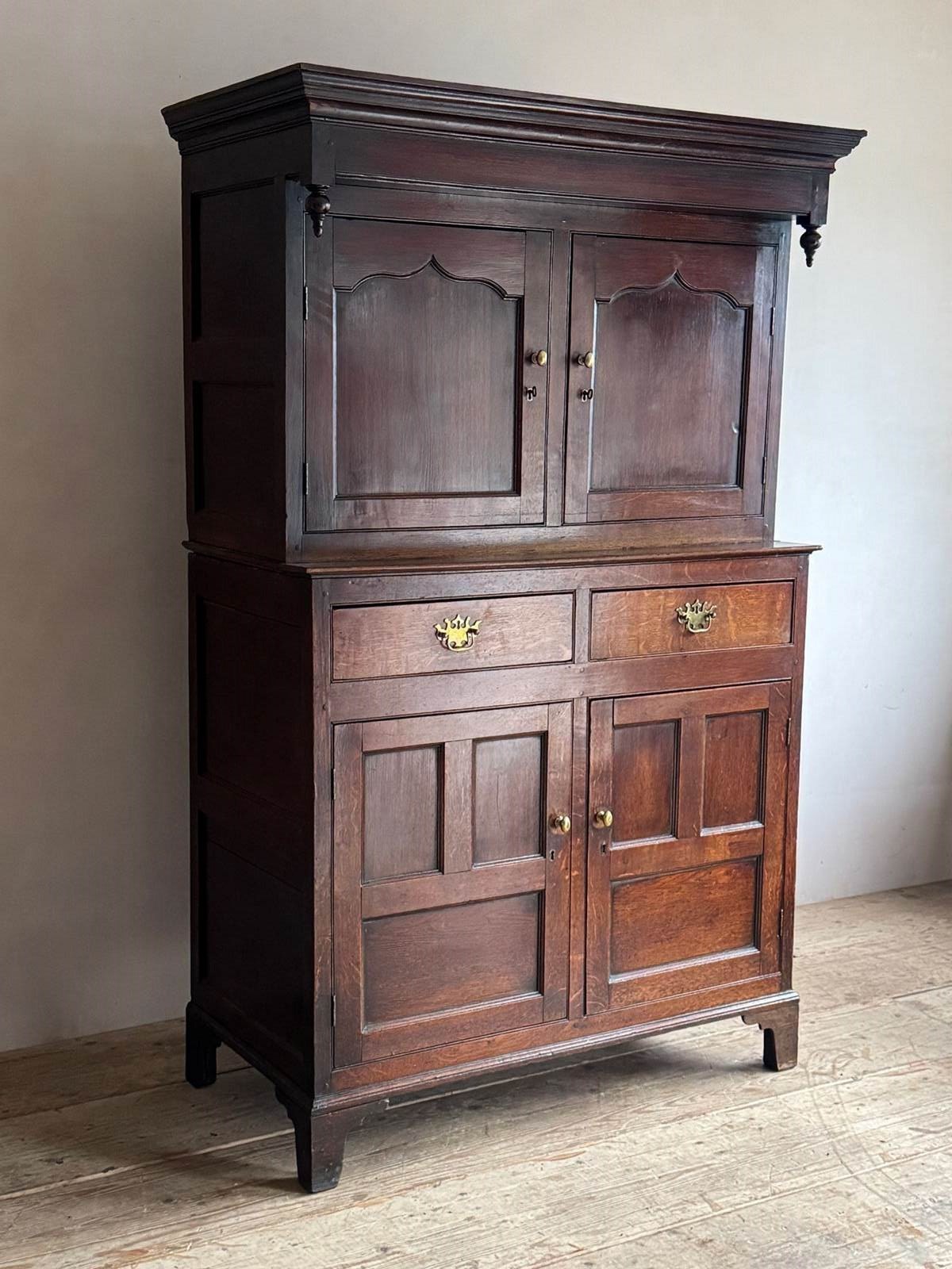 An 18thC Welsh Oak Deuddarn Cwpwrdd or two part cupboard. A plain moulded cornice with fine pendant finials above the top section with ogee panelled doors sits above two drawers (the brass handles are later replacements) over the lower cupboard with plain panelled doors raised on bracket feet. In neat clean condition and a good colour. Wales C.1780-1800