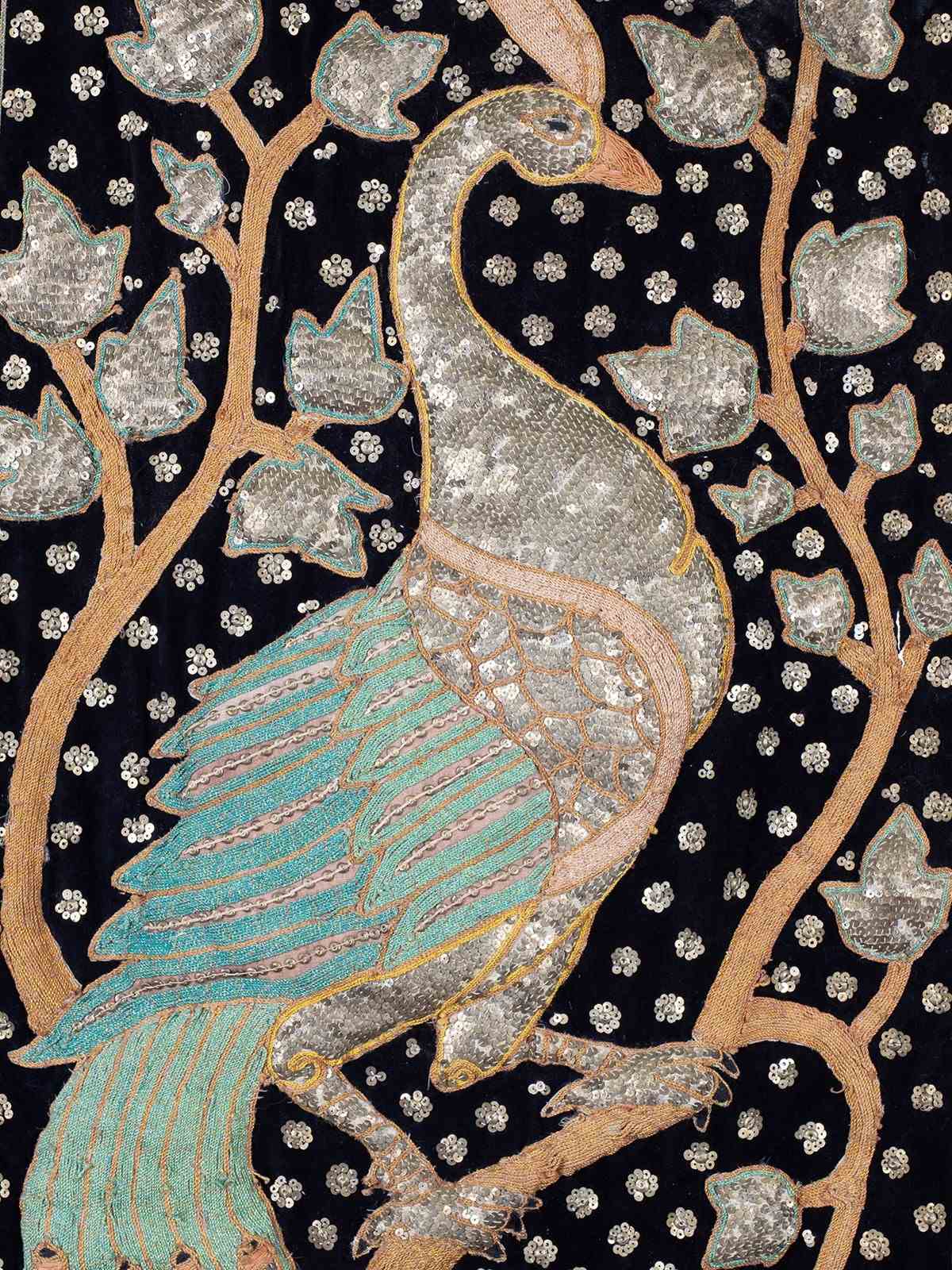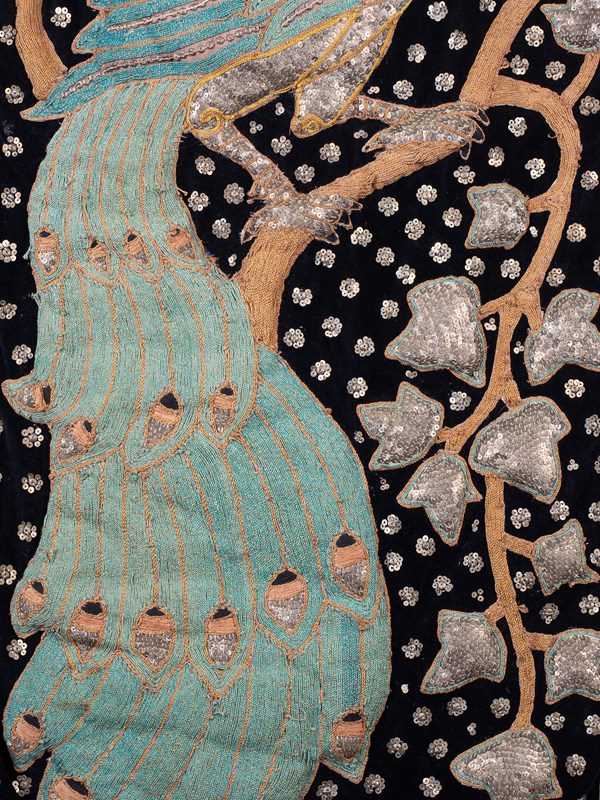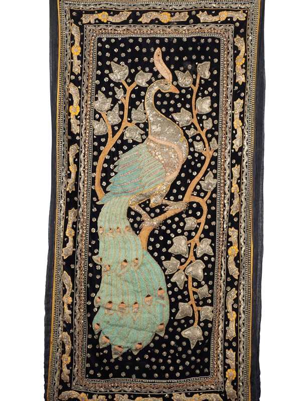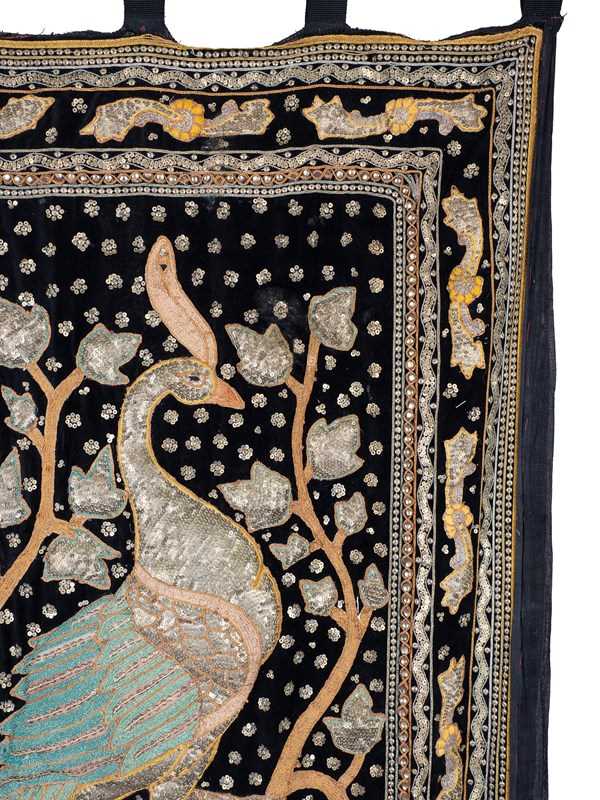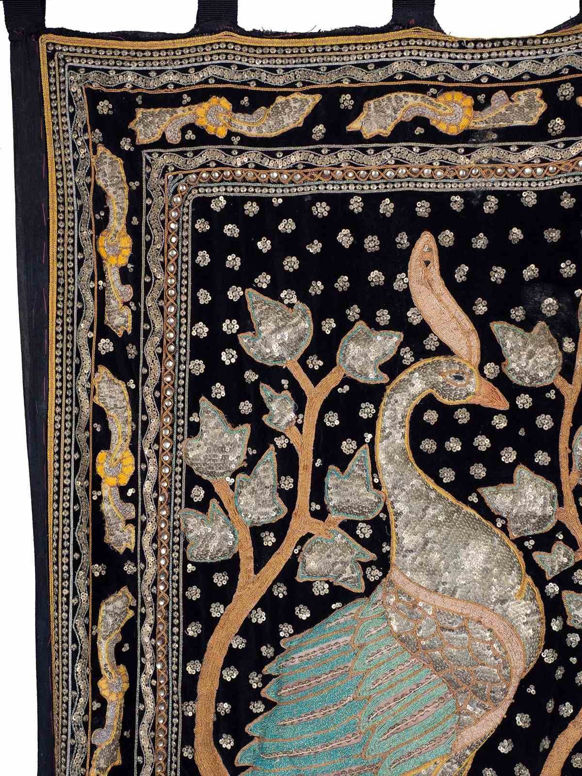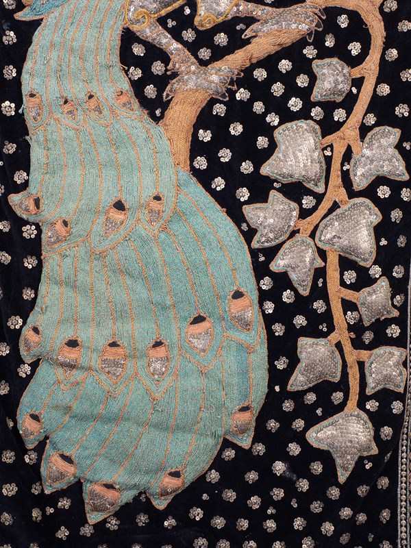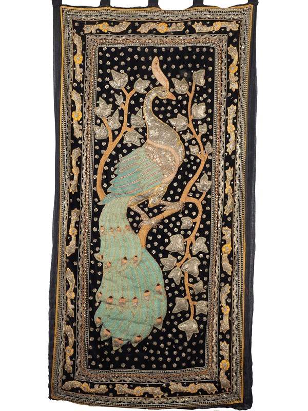 The heavily padded peacock stands proud of the black velvet ground and is rendered in gold and silver wrapped turquoise silk threads. Enclosed by multiple decorative borders and adorned with thousands of sequins hand stitched to the ground in flower-like patterns. Backed in lightweight black cotton with later heavy gauge hanging loops. 76cm x 151cm (29.9 x 59.4 inches) India circa 1890.