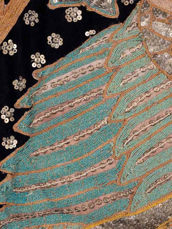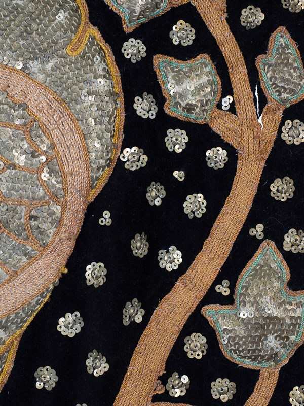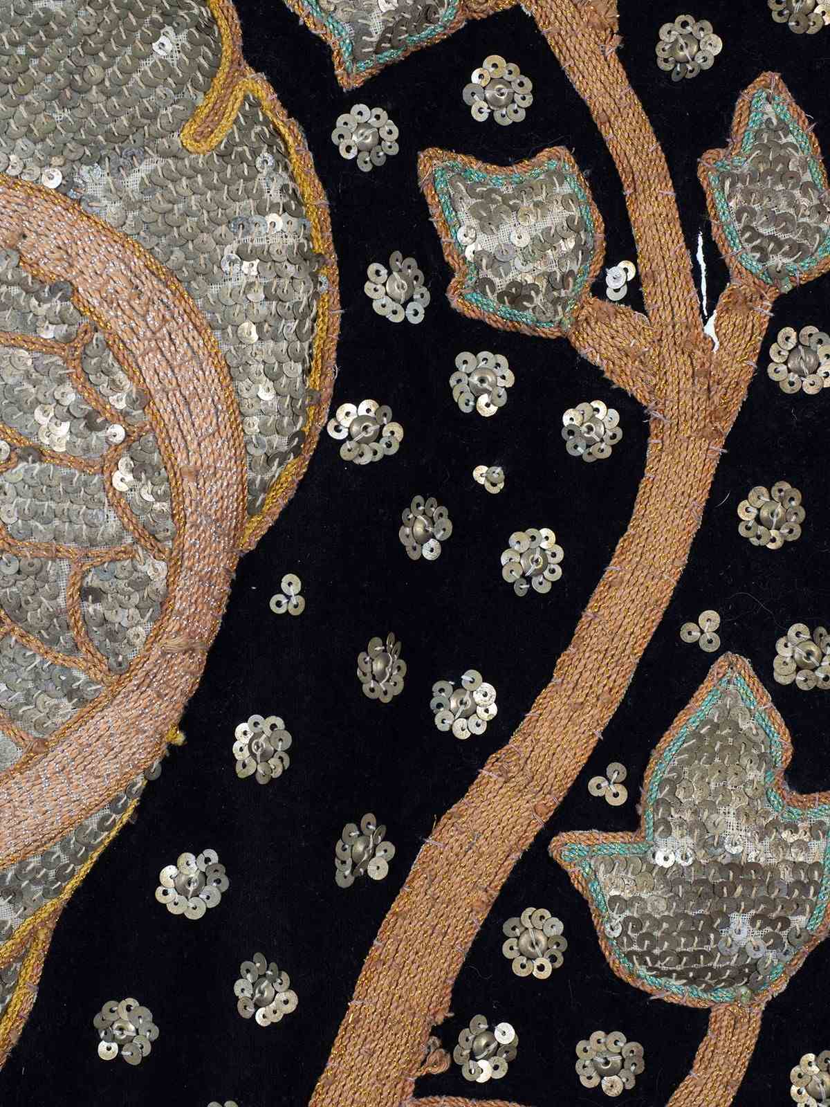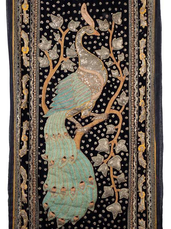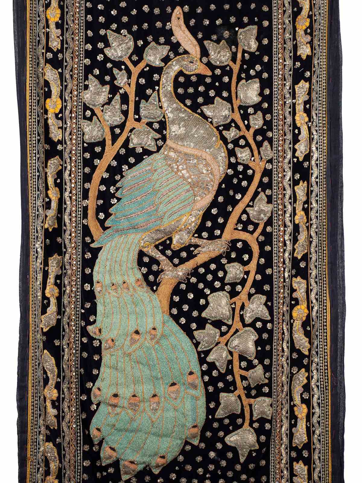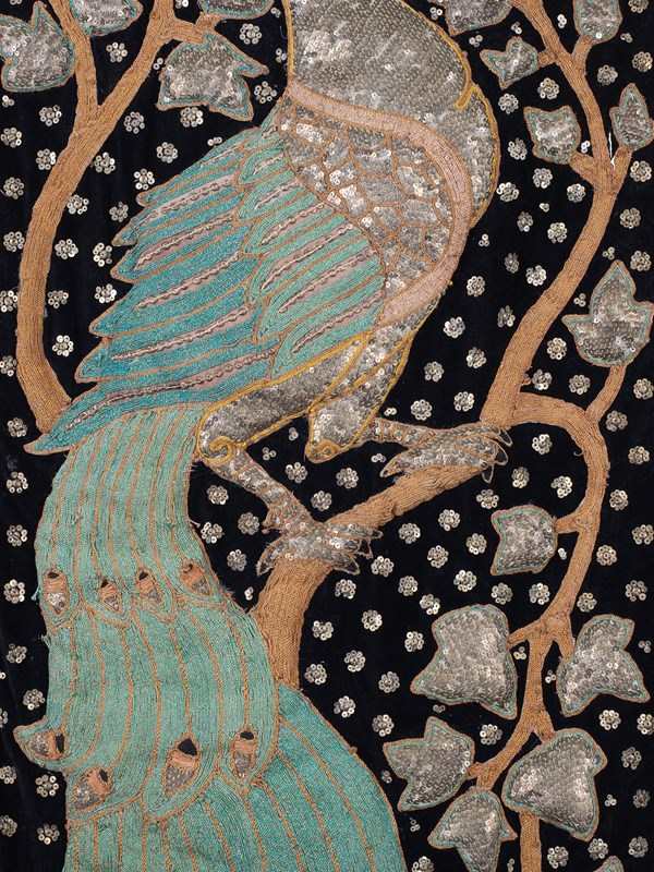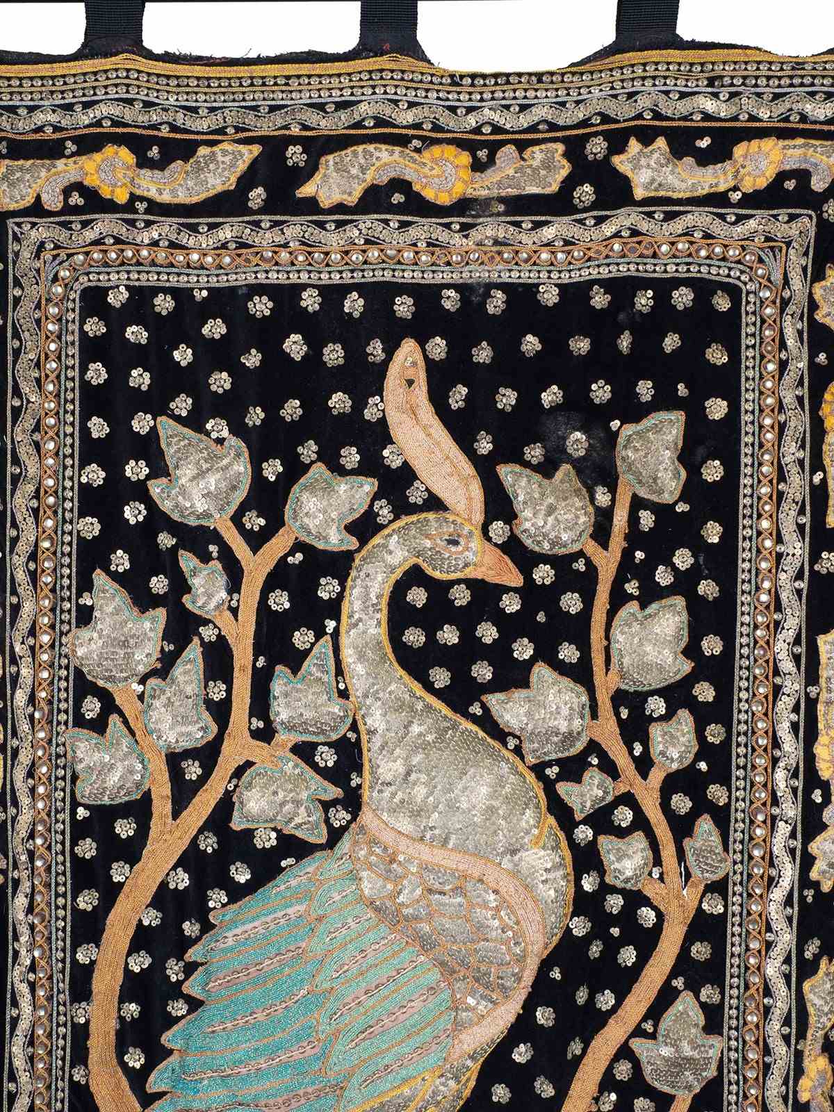 The heavily padded peacock stands proud of the black velvet ground and is rendered in gold and silver wrapped turquoise silk threads. Enclosed by multiple decorative borders and adorned with thousands of sequins hand stitched to the ground in flower-like patterns. Backed in lightweight black cotton with later heavy gauge hanging loops. 76cm x 151cm (29.9 x 59.4 inches) India circa 1890.