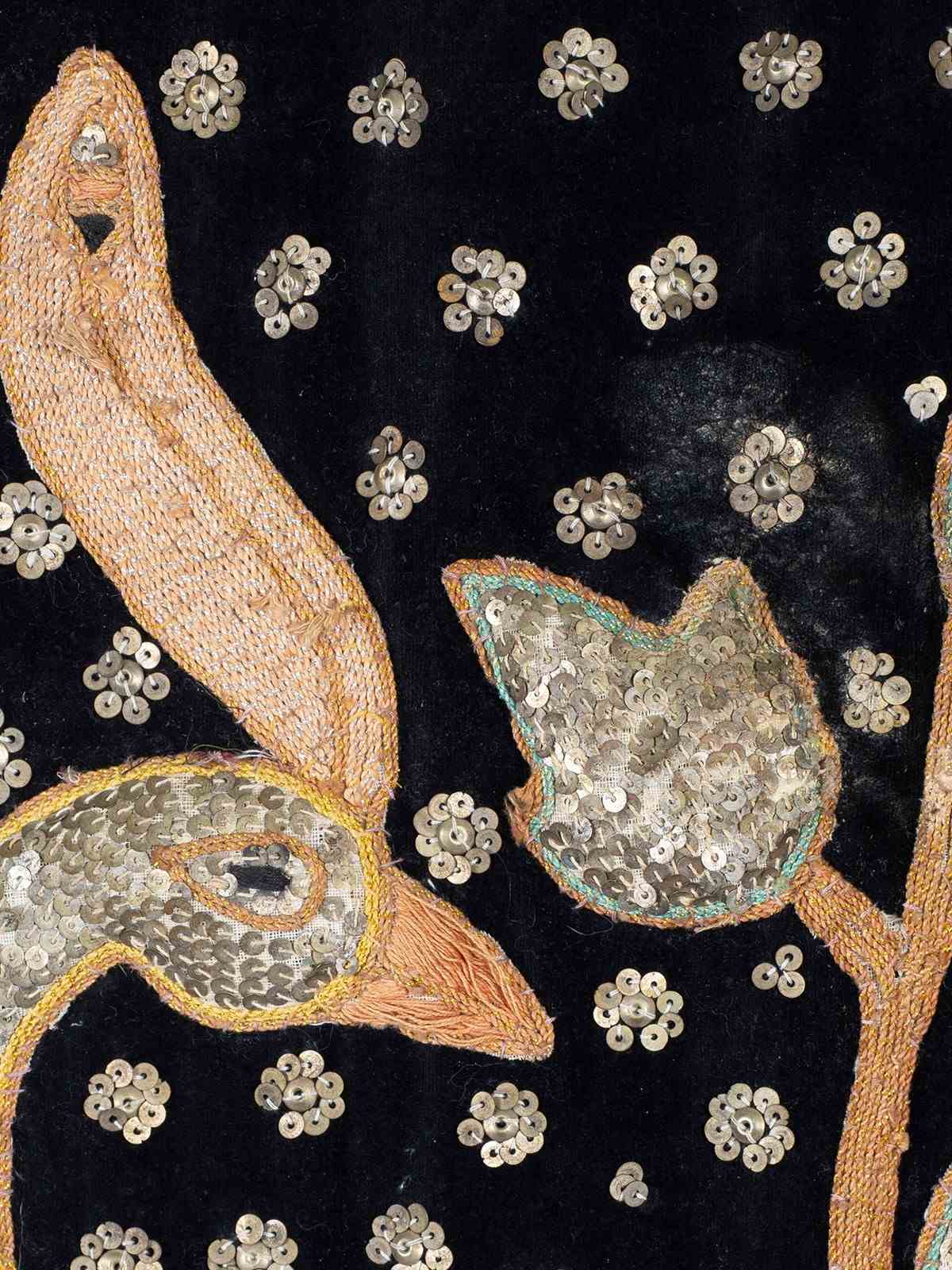 Condition:Overall presents superbly, no losses (of the sequins or embroidery) and only a couple of loose threads. Three glass beads missing from one of the inner borders. A couple of stains to the velvet ground, most notably to the right of the peacocks head, see images. Paint stain to the reverse. Please see all images and video.