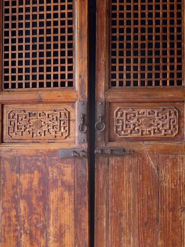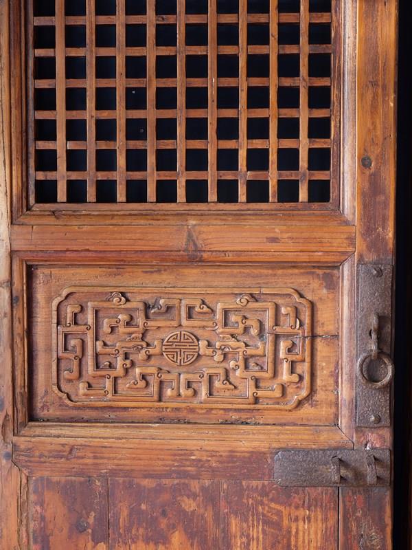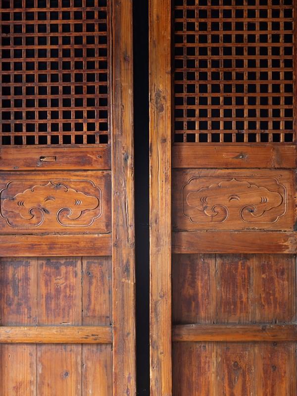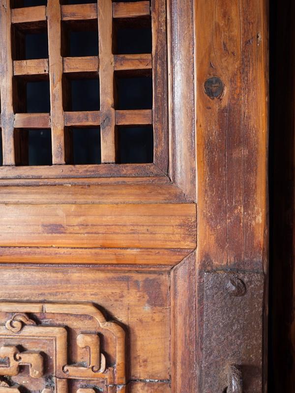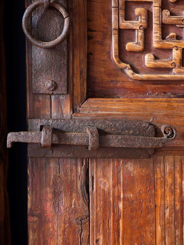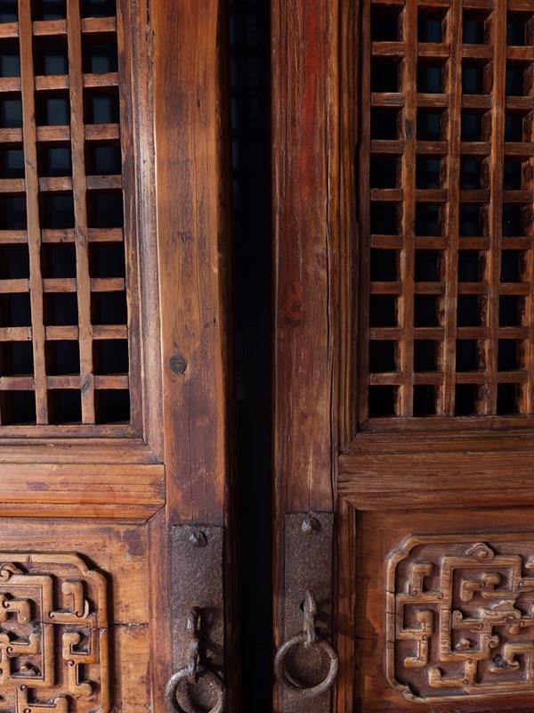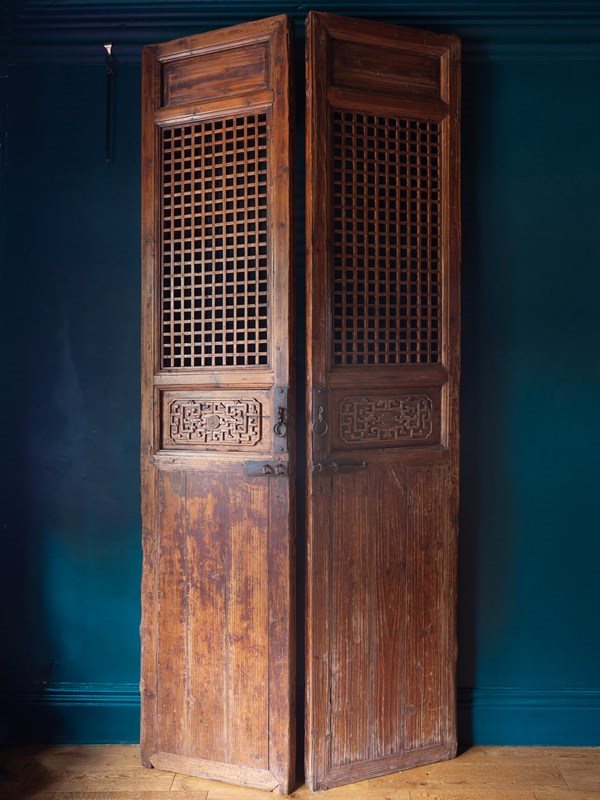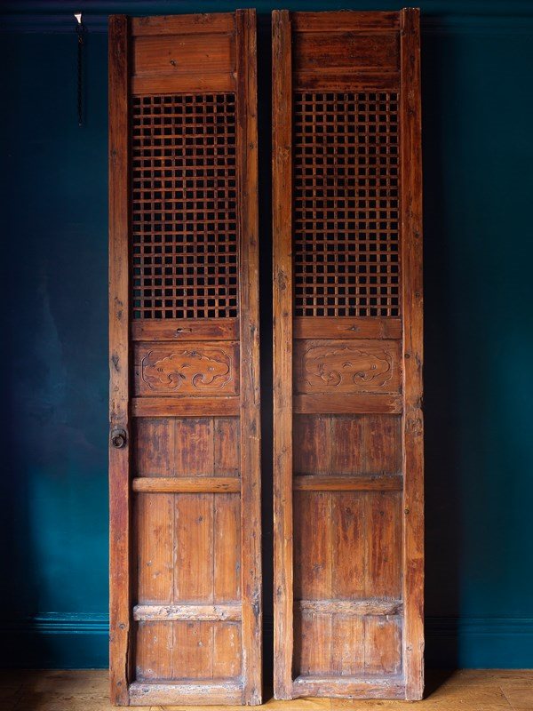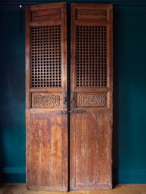 A very tall pair of Antique Chinese Temple Doors in Elm with carved decorative central panels. The upper sections latticed, the lower planked. Wrought Iron ring handles, bolt and keep. The reverse with a ring handle to one door only. 252cm x 110cm (combined width) x 6cm (99 x 43.5 x 2.5 inches) Circa 1890