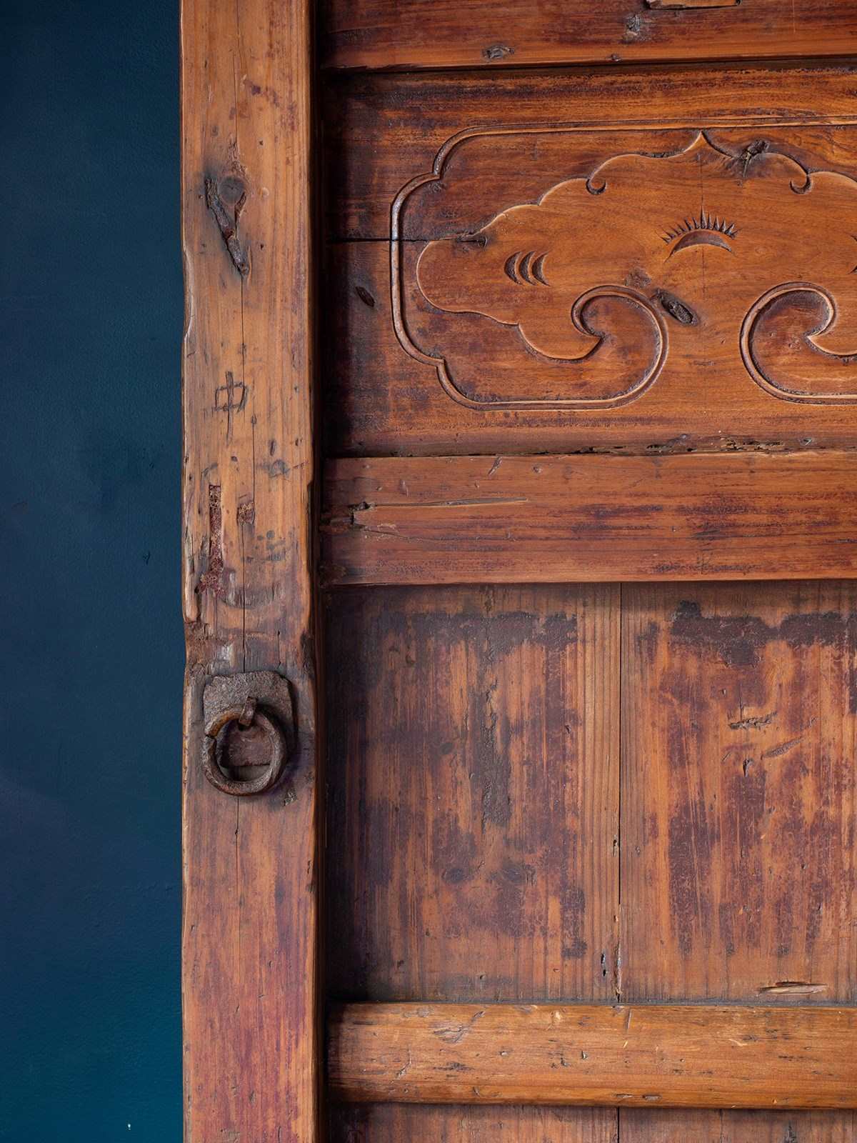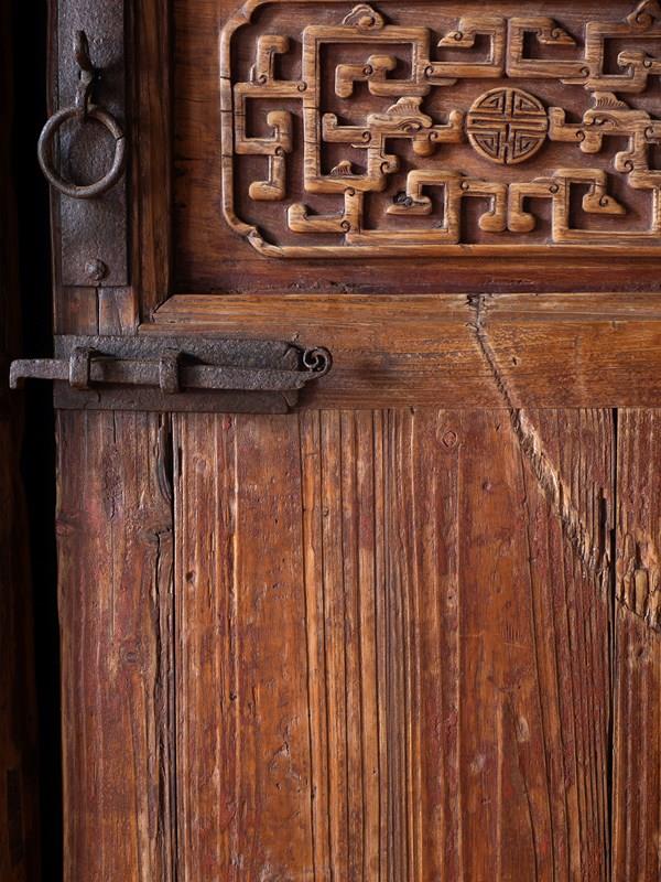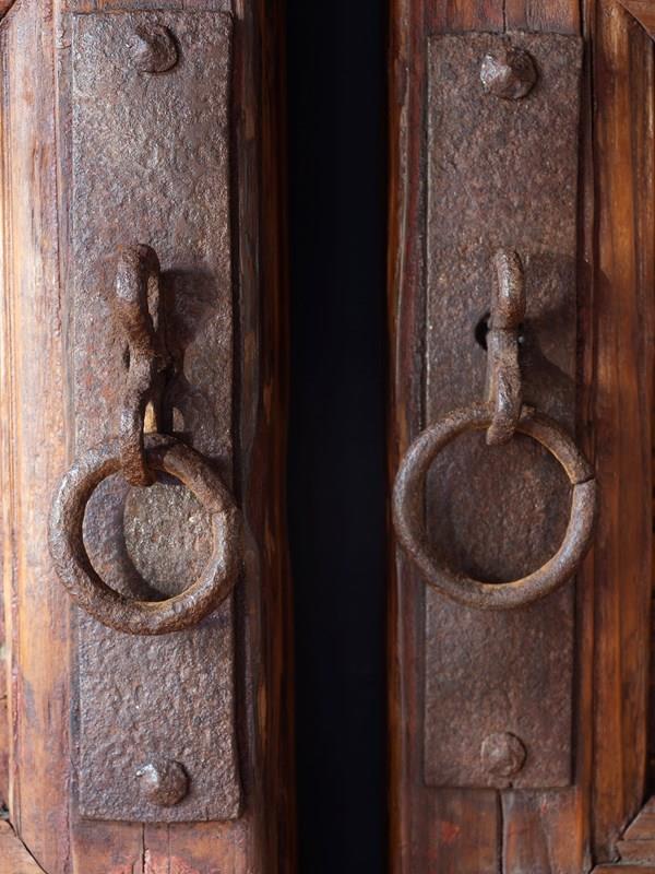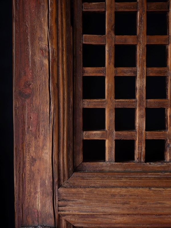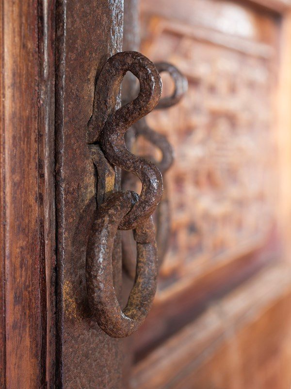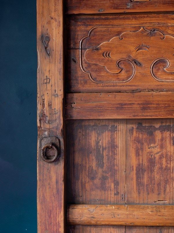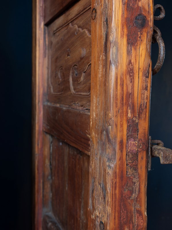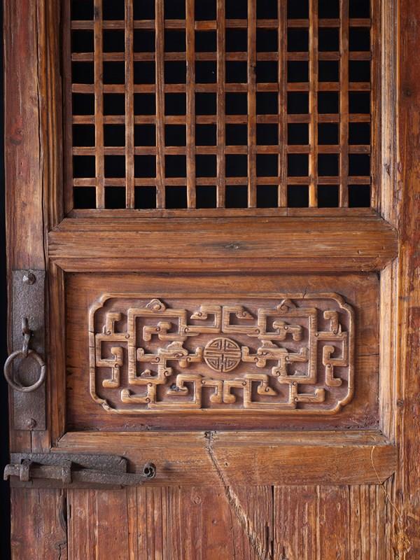 A very tall pair of Antique Chinese Temple Doors in Elm with carved decorative central panels. The upper sections latticed, the lower planked. Wrought Iron ring handles, bolt and keep. The reverse with a ring handle to one door only. 252cm x 110cm (combined width) x 6cm (99 x 43.5 x 2.5 inches) Circa 1890