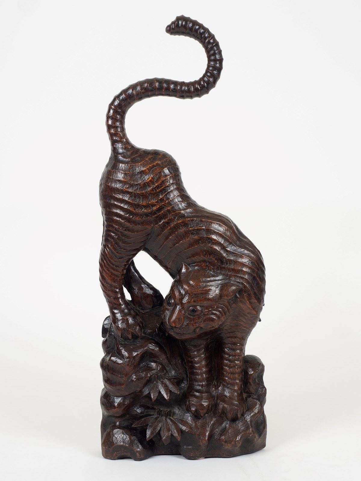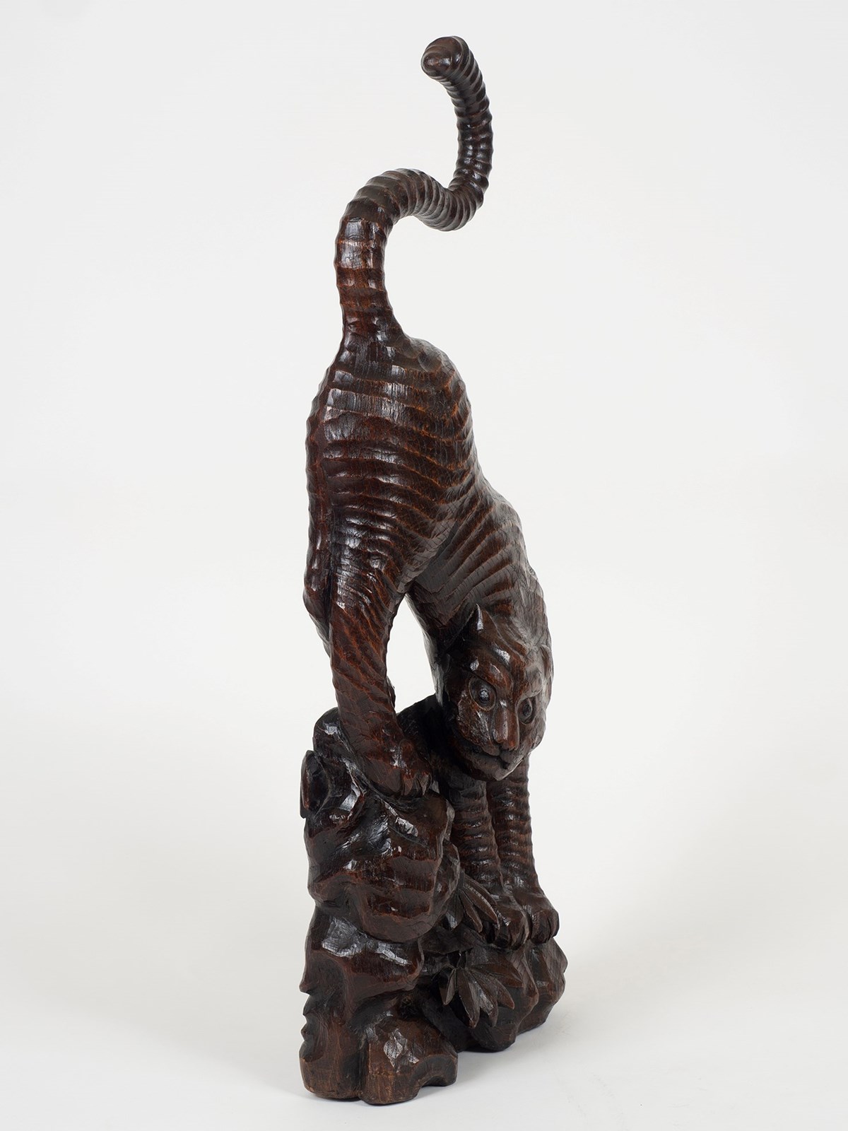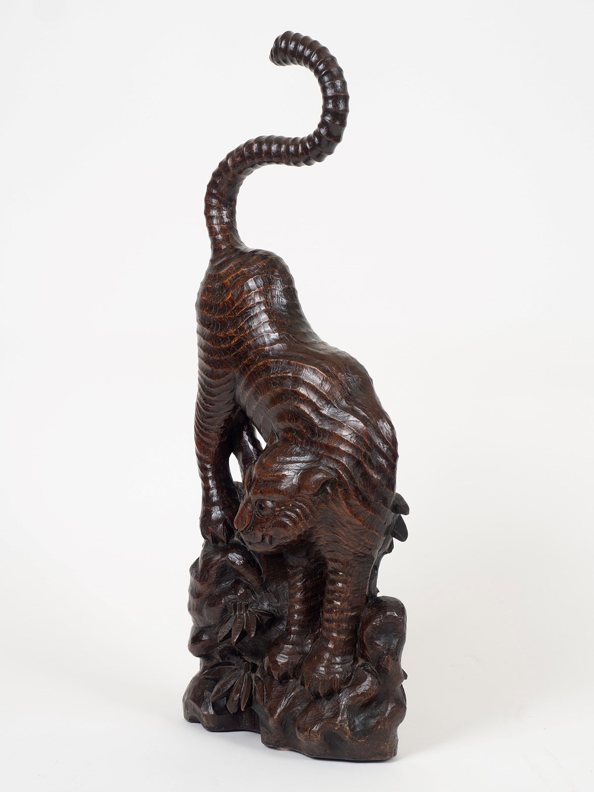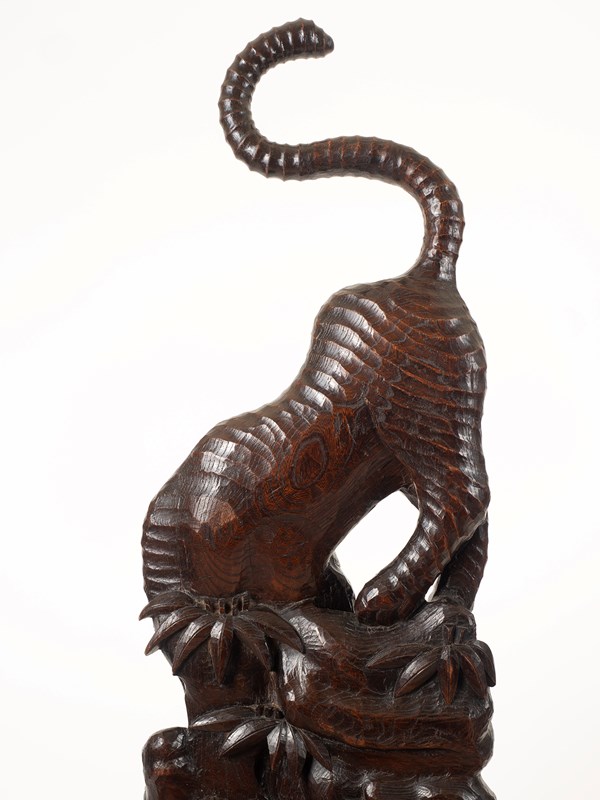 An unusually large tiger carving hewn from an exceptionally well figured slab of very dense hardwood, possibly Paulownia. Edo Period Japan, circa 1850. 83cm x 30cm x 12cm. (32.6 x 12 x 4.7 inches).