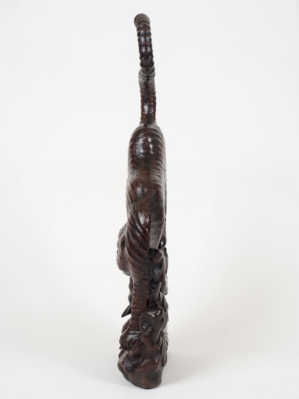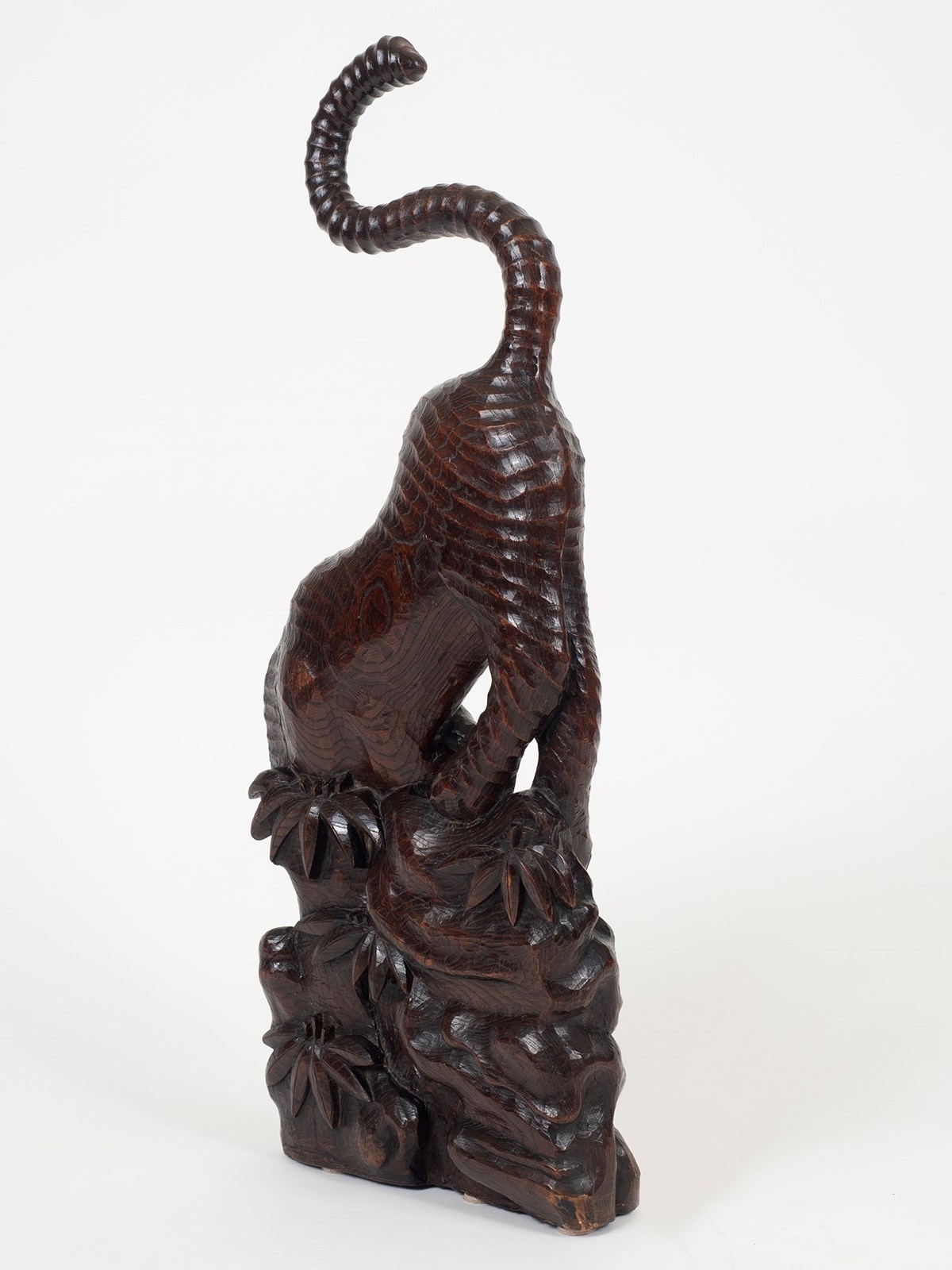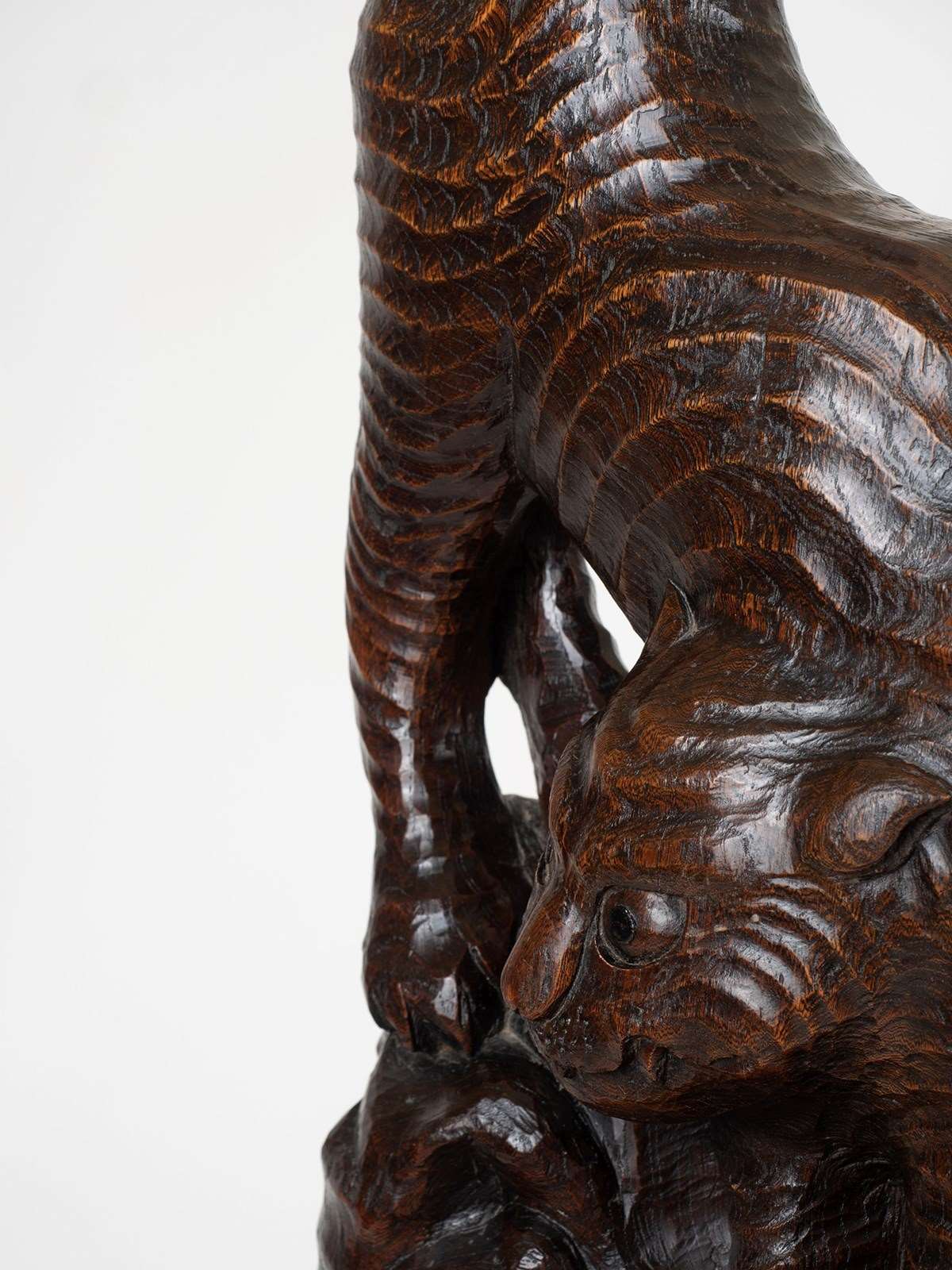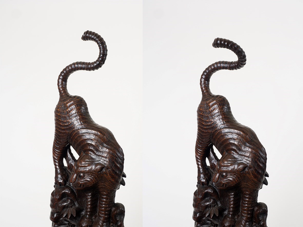 An unusually large tiger carving hewn from an exceptionally well figured slab of very dense hardwood, possibly Paulownia. Edo Period Japan, circa 1850. 83cm x 30cm x 12cm. (32.6 x 12 x 4.7 inches).