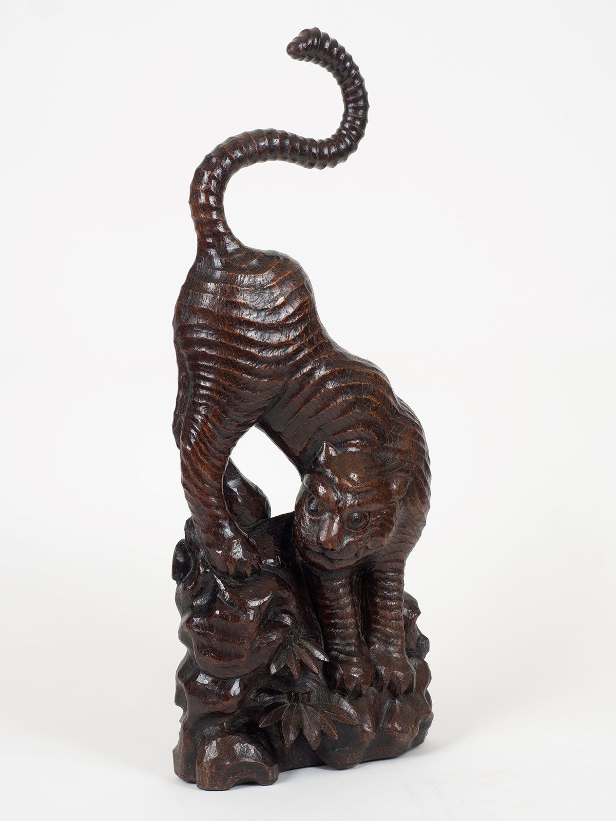 This wonderful cat-like Tiger is a typical and extremely charming example of the Edo artists' approach to the animal. With artists only having recourse to pelts for reference, the Edo tiger is an expressive, interpretive creature that disappeared with the arrival of western zoological manuals in the Meiji period. Carvings of tigers in this style are very rare, its appearance has more in common with the paintings of Maruyama Okyo and the ceramic tigers of Kakeimon than the realist okimono that became very prevalent in the late 19th century.