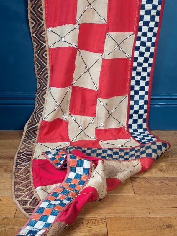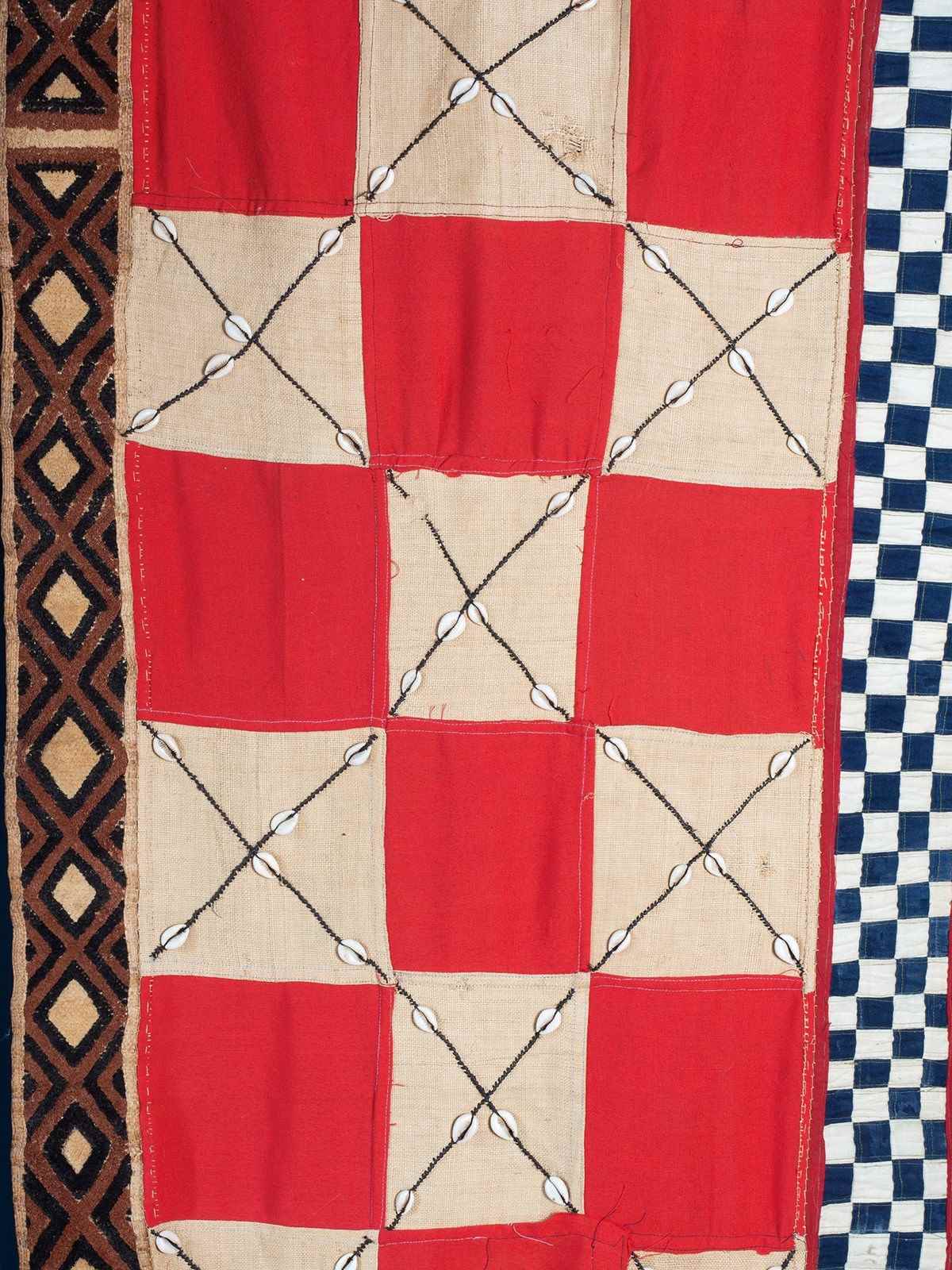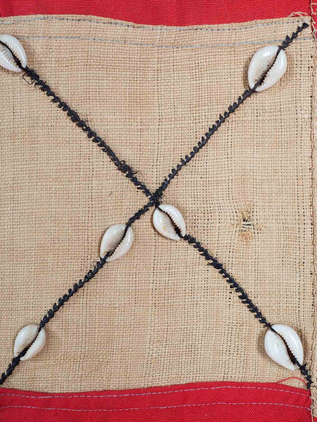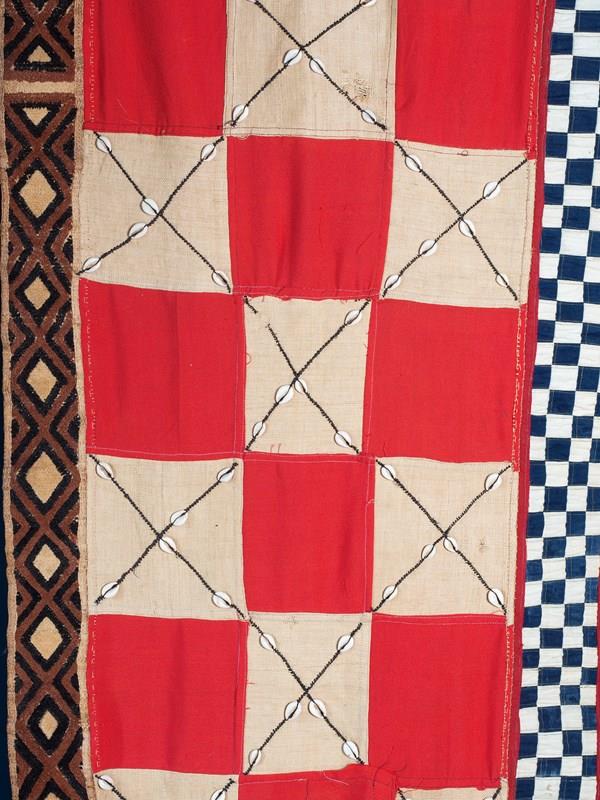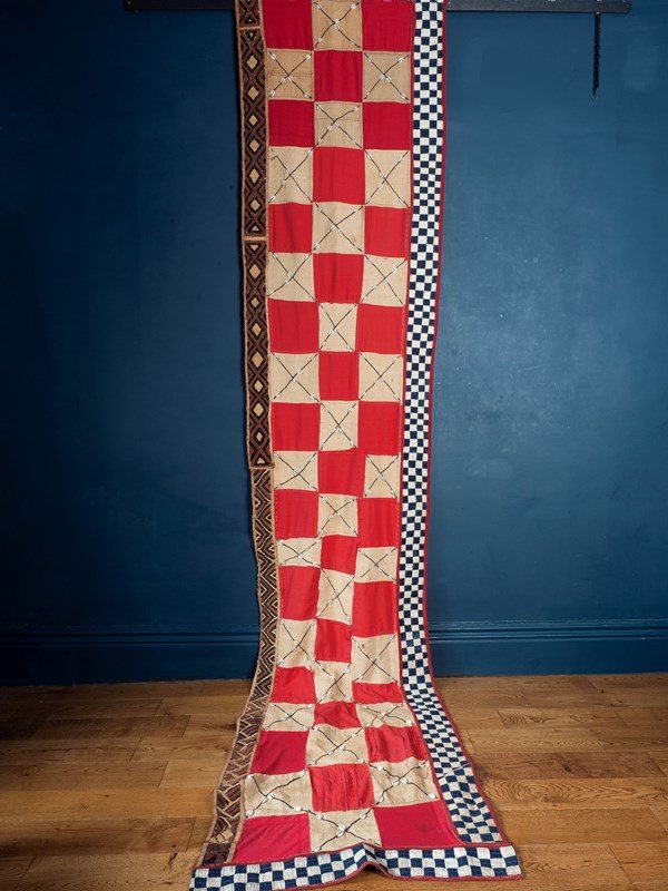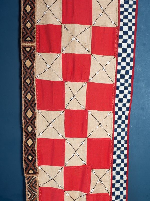 The central panel comprises alternate squares of coarse plain raffia and finely woven red dyed raffia, the plain panels embellished with cowrie shells. Bordered to one edge with the traditional cut pile embroidery ubiquitous to Kuba textiles, and to the other edge with a blue and white check of reverse applique. 335cm x 70cm (132 x 27.5 inches) Early to mid 20th century, circa 1940’s/50’s.