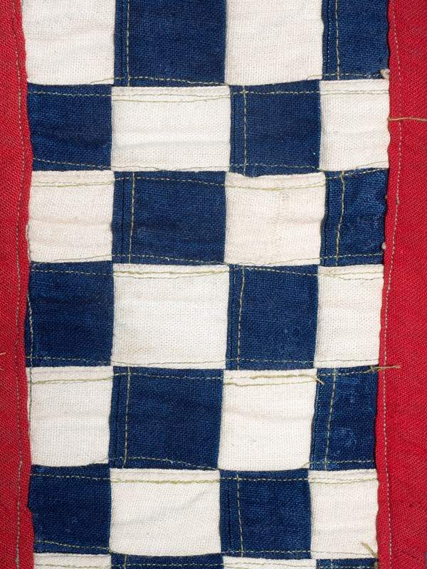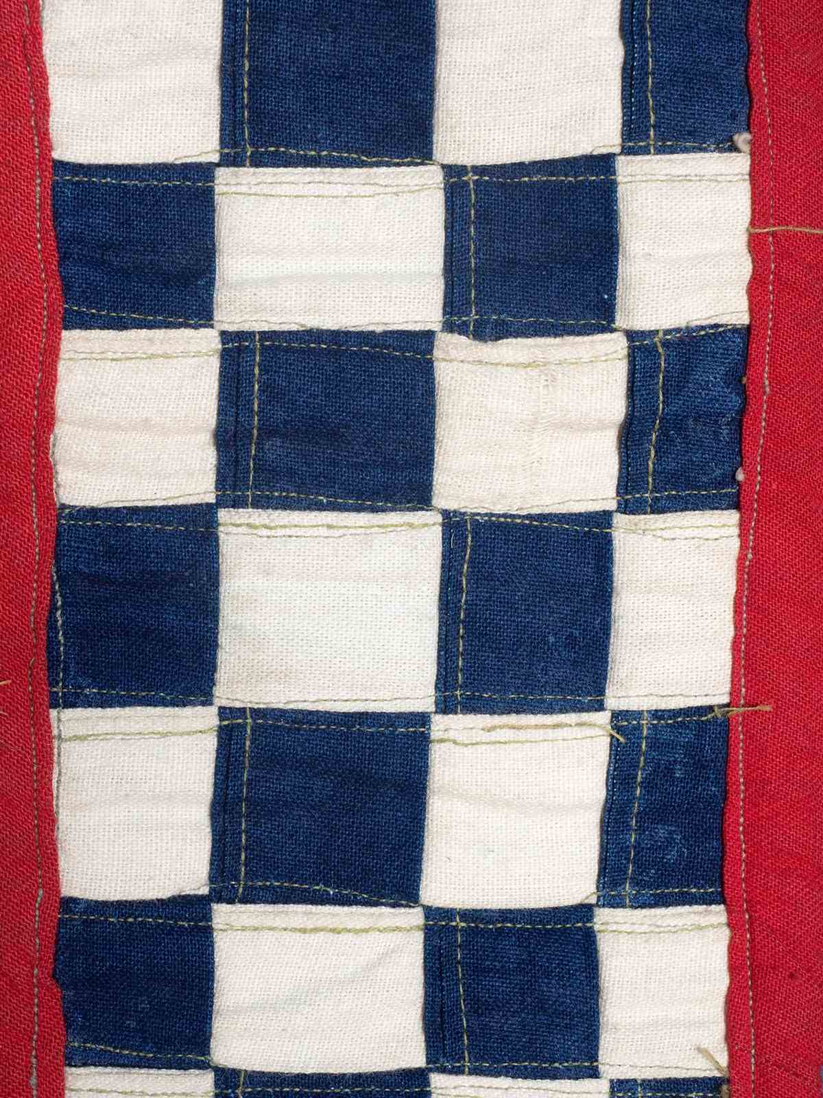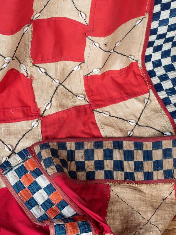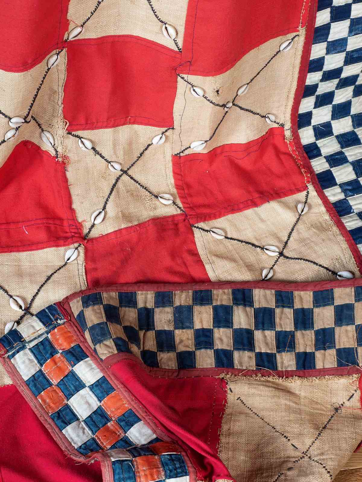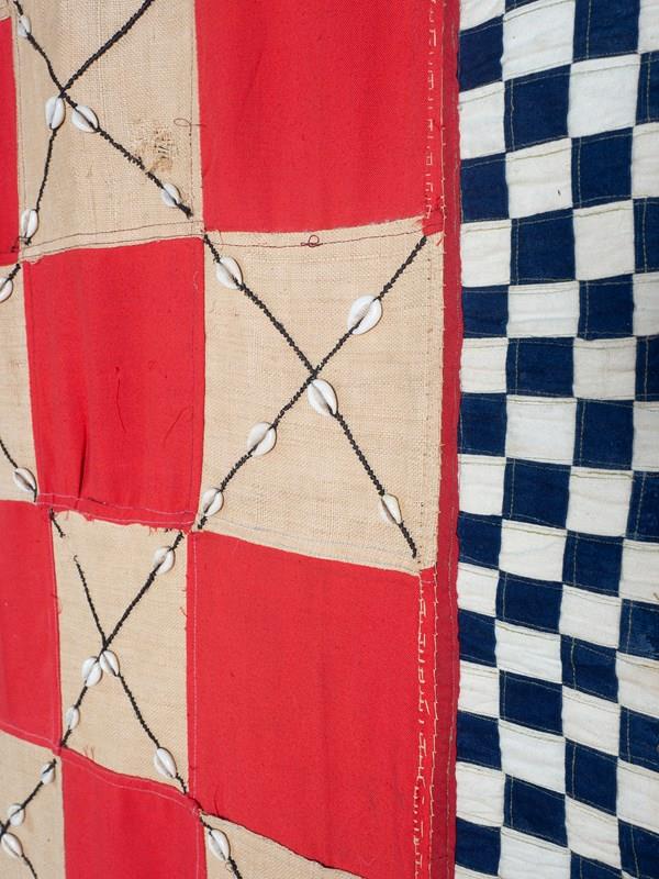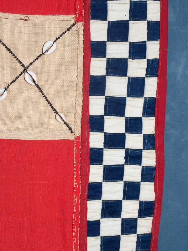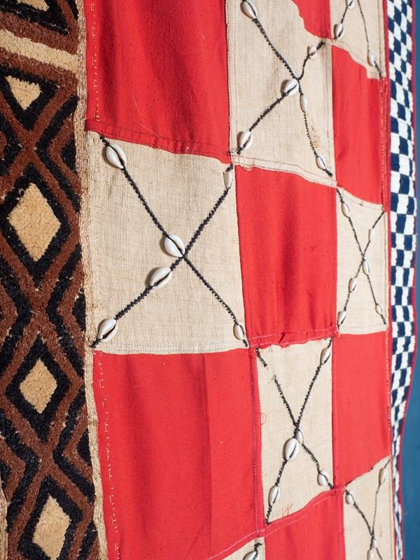 The central panel comprises alternate squares of coarse plain raffia and finely woven red dyed raffia, the plain panels embellished with cowrie shells. Bordered to one edge with the traditional cut pile embroidery ubiquitous to Kuba textiles, and to the other edge with a blue and white check of reverse applique. 335cm x 70cm (132 x 27.5 inches) Early to mid 20th century, circa 1940’s/50’s.