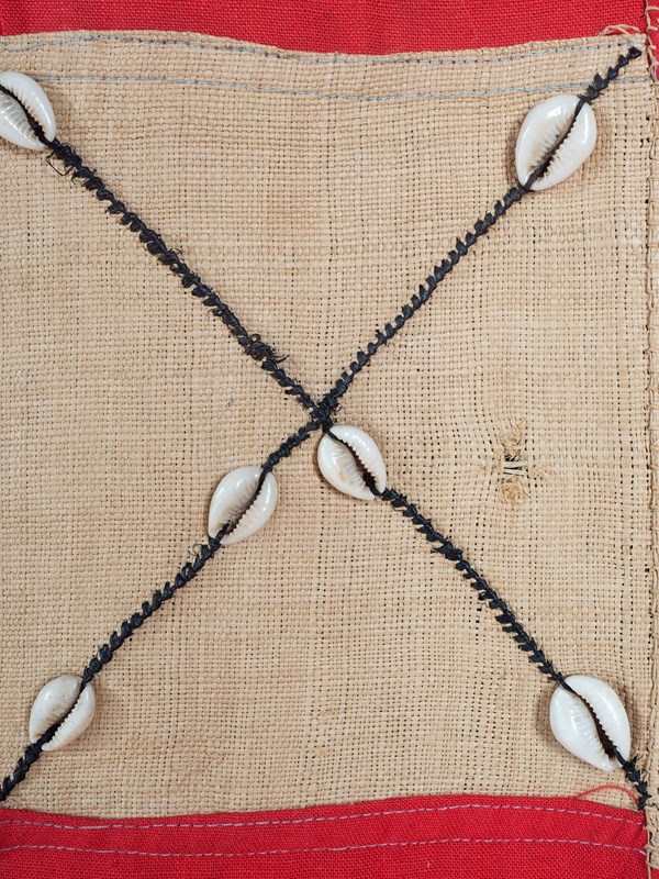 Excellent, original unrestored condition with only minimal signs of age and wear. One missing cowrie shell, some minor staining to the front, and a couple of very small holes to one or two of the raffia panels. Possibly cut down from a longer piece, the top (as hung in our images) is unfinished/unhemmed which has caused approx 1cm of stitching to come loose where the border panels are joined to the central panels. The cut pile embroidery is slightly worn at the bottom end, with a thinner pile than the top. Please see images and video for detailed condition.
