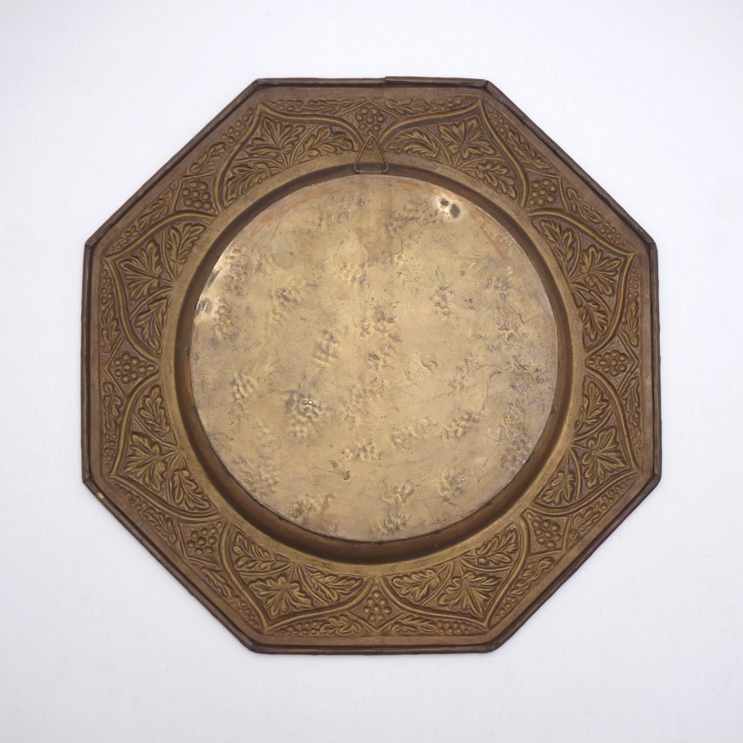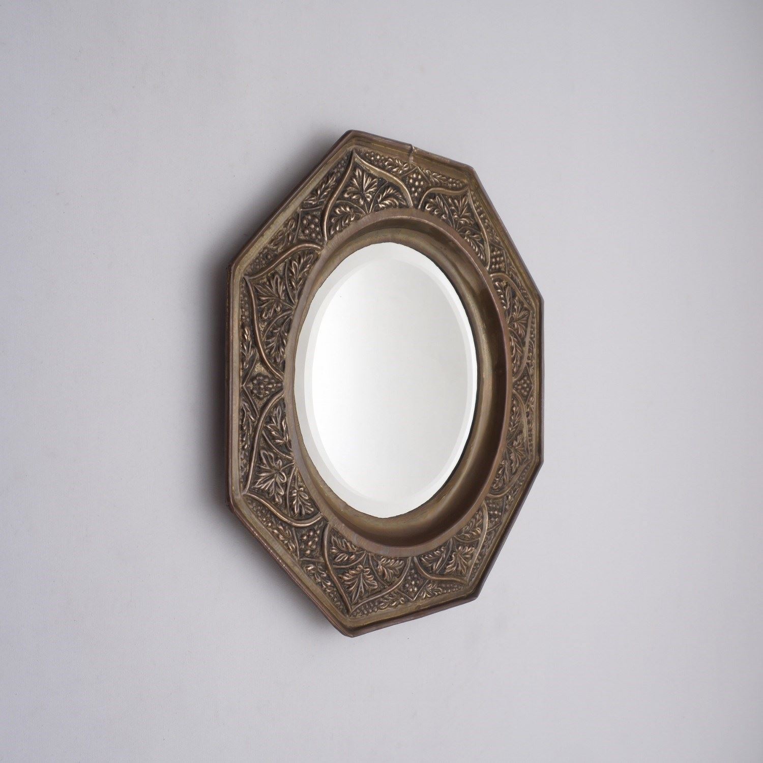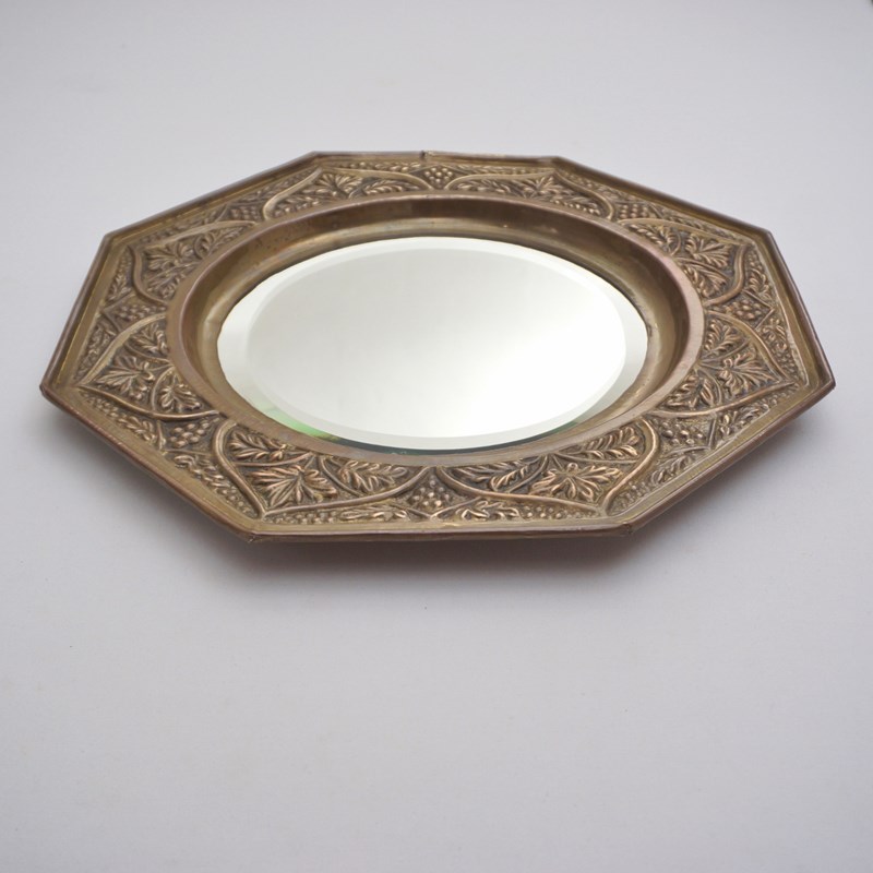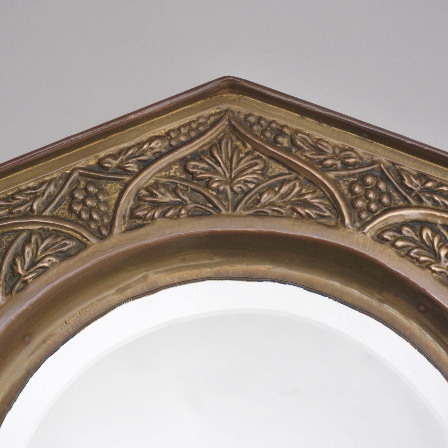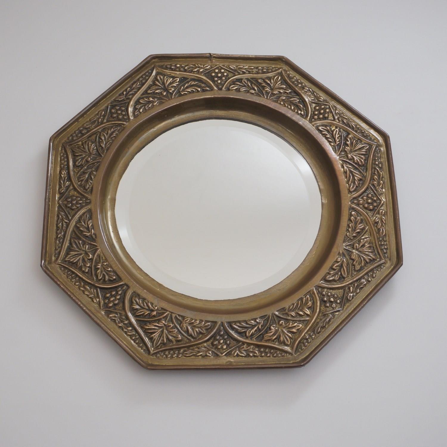 Antique Arts & Crafts octagonal wall mirror with embossed brass grapevine, bevelled, in the style of Keswick School of Industrial Arts, 1900`s ca, English.