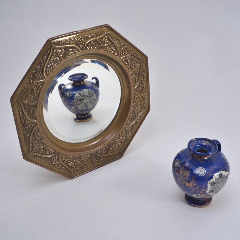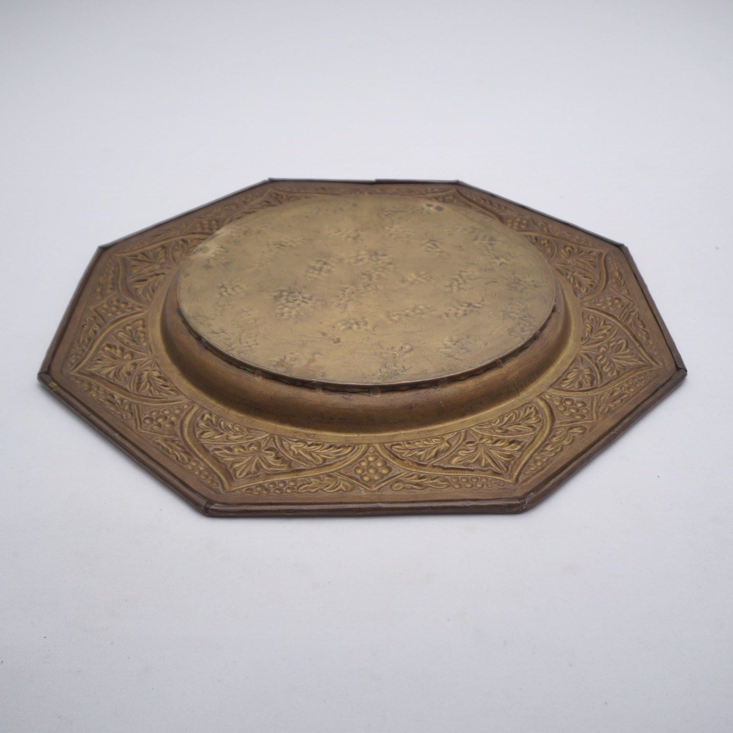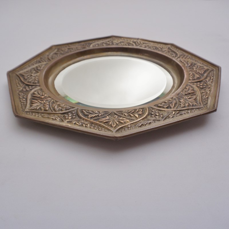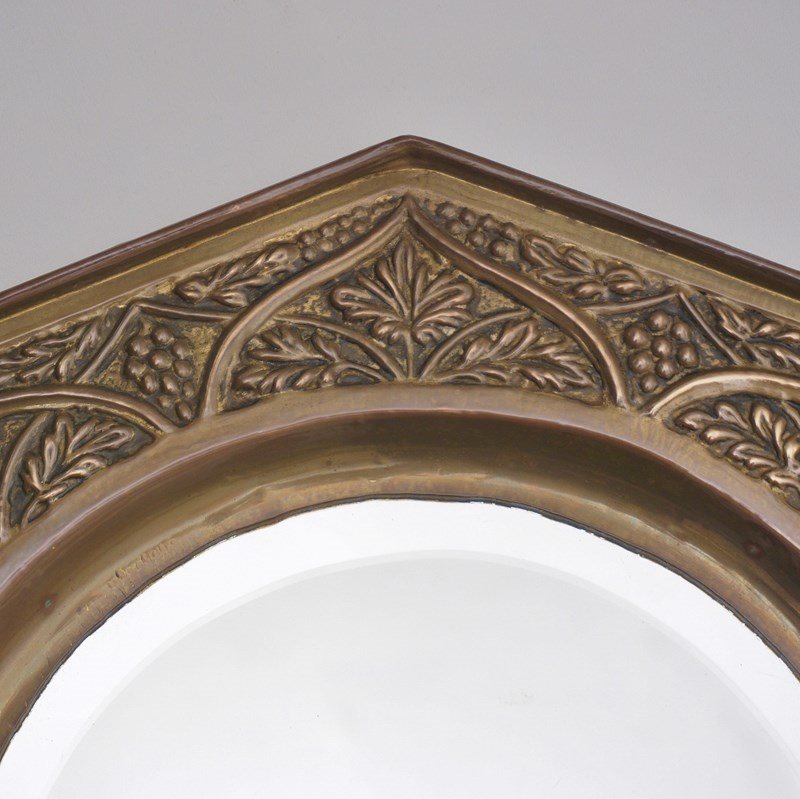 While this mirror is unmarked, it could be the work of the Keswick School of Industrial Arts because of the style and a combination of handmade & early machine made features. It exemplifies the ideals & techniques of the Arts & Crafts Movement: the frame covered with embossed & hammered brass; the use of heavy-gauge brass and the repoussé (hand-hammered from behind) technique were central to KSIA`s curriculum, which aimed to restore the dignity of handcraft in an industrial age; the stylized, naturalistic decoration of trailing grapevines and leaves is a signature KSIA theme, often inspired by the Lake District landscapes surrounding the School; the combination of an octagonal frame, a circular bevelled mirror is a known configuration used by the School`s artisans around 1900–1910.