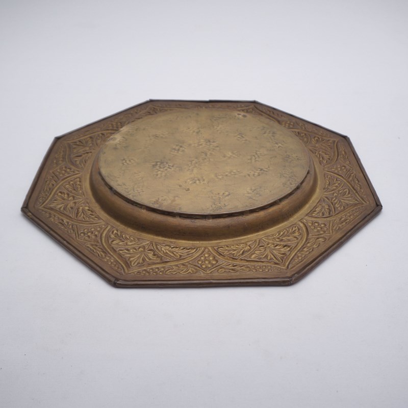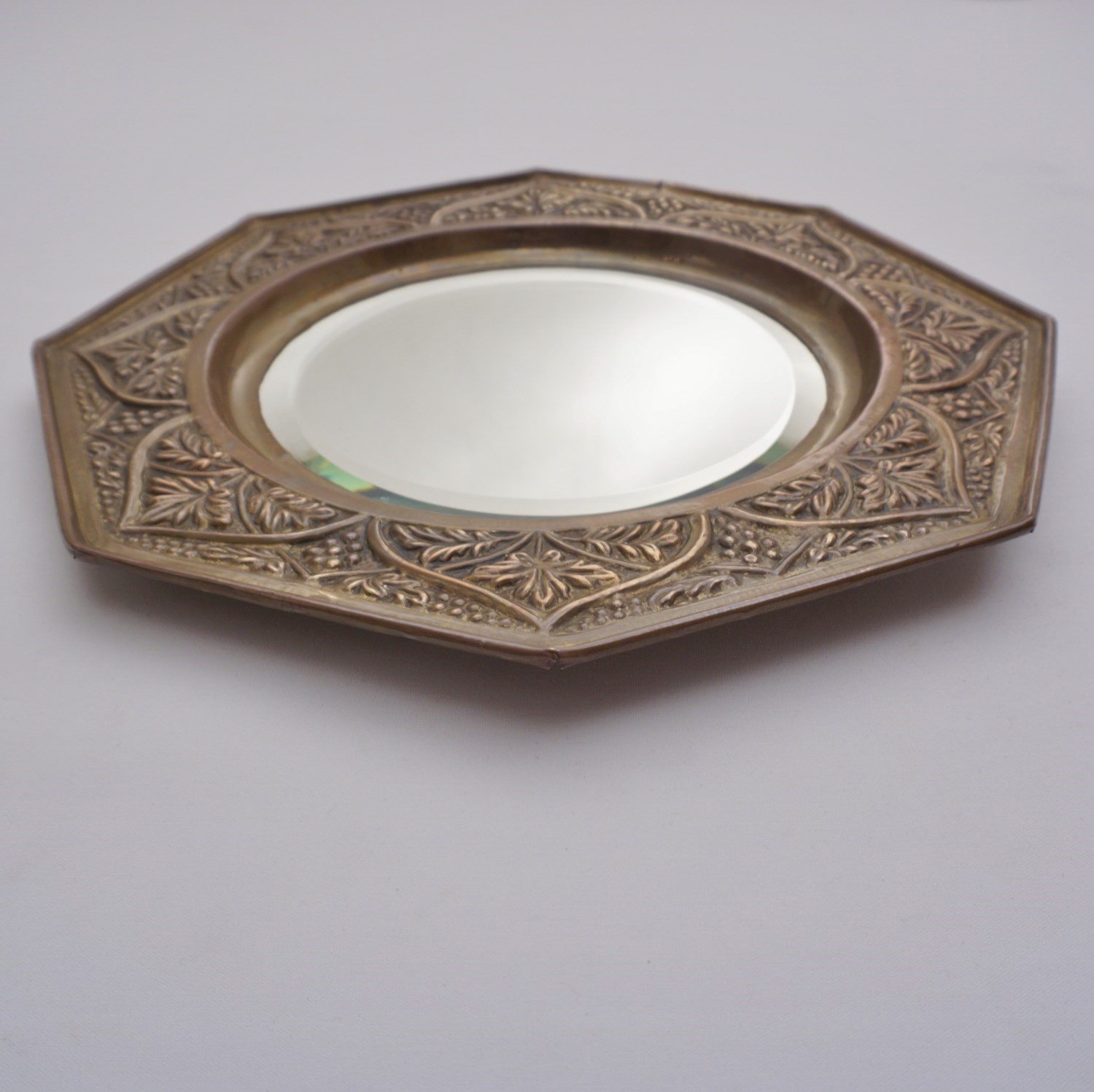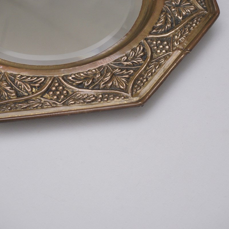 Antique Arts & Crafts Octagonal Wall Mirror, Embossed Brass Grapevine, Bevelled