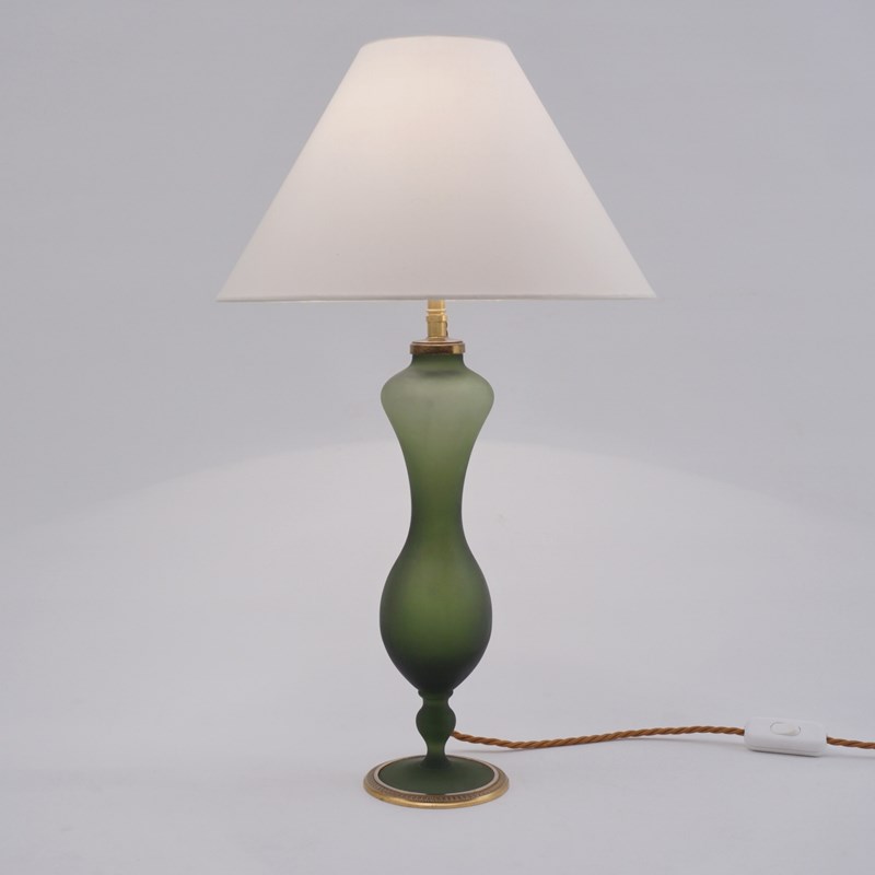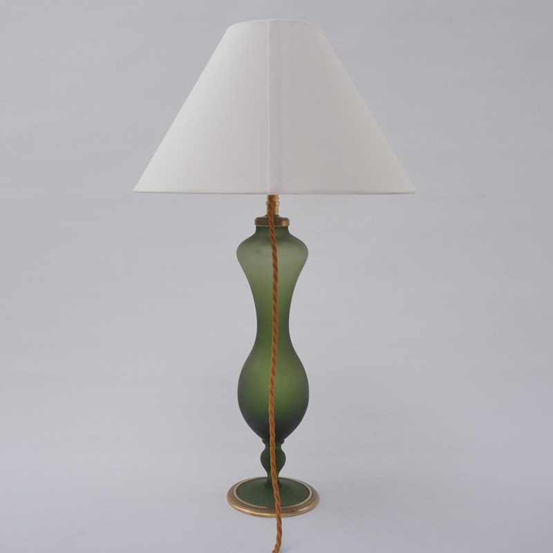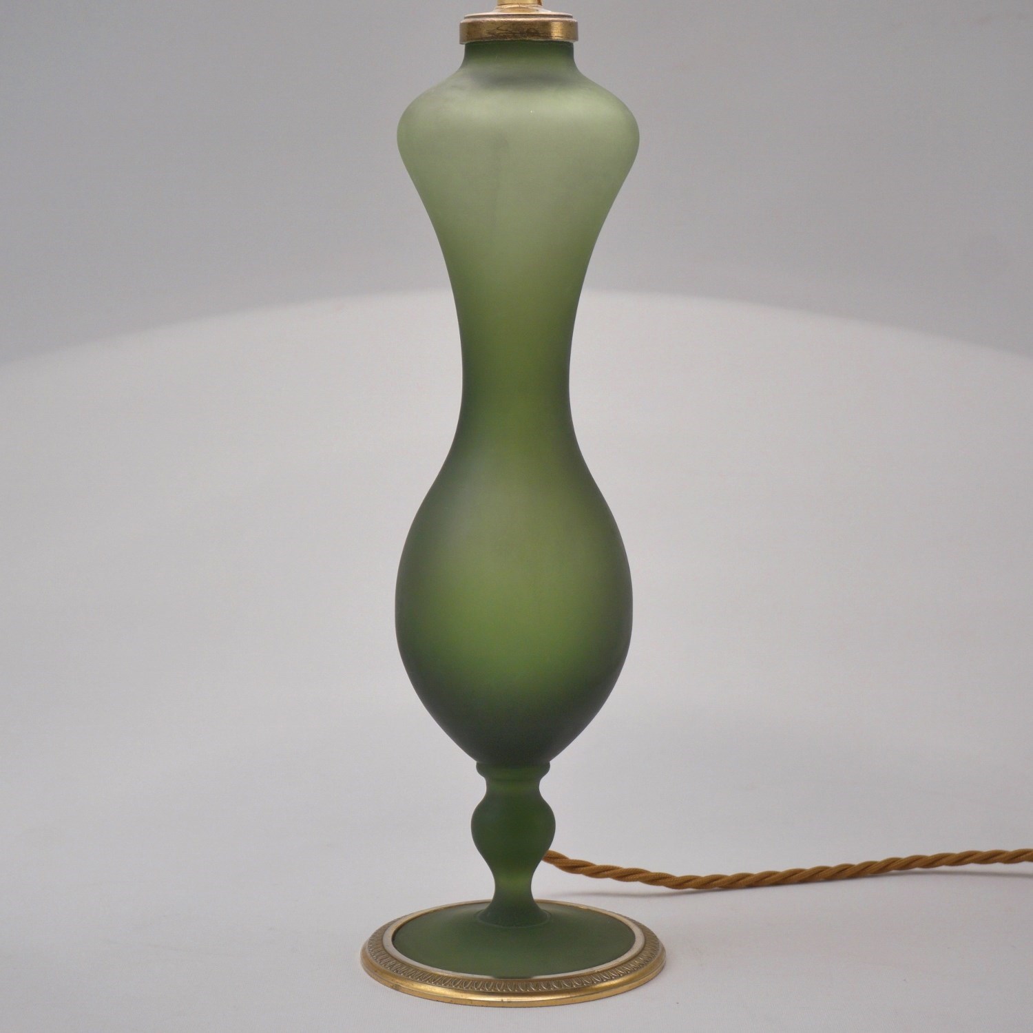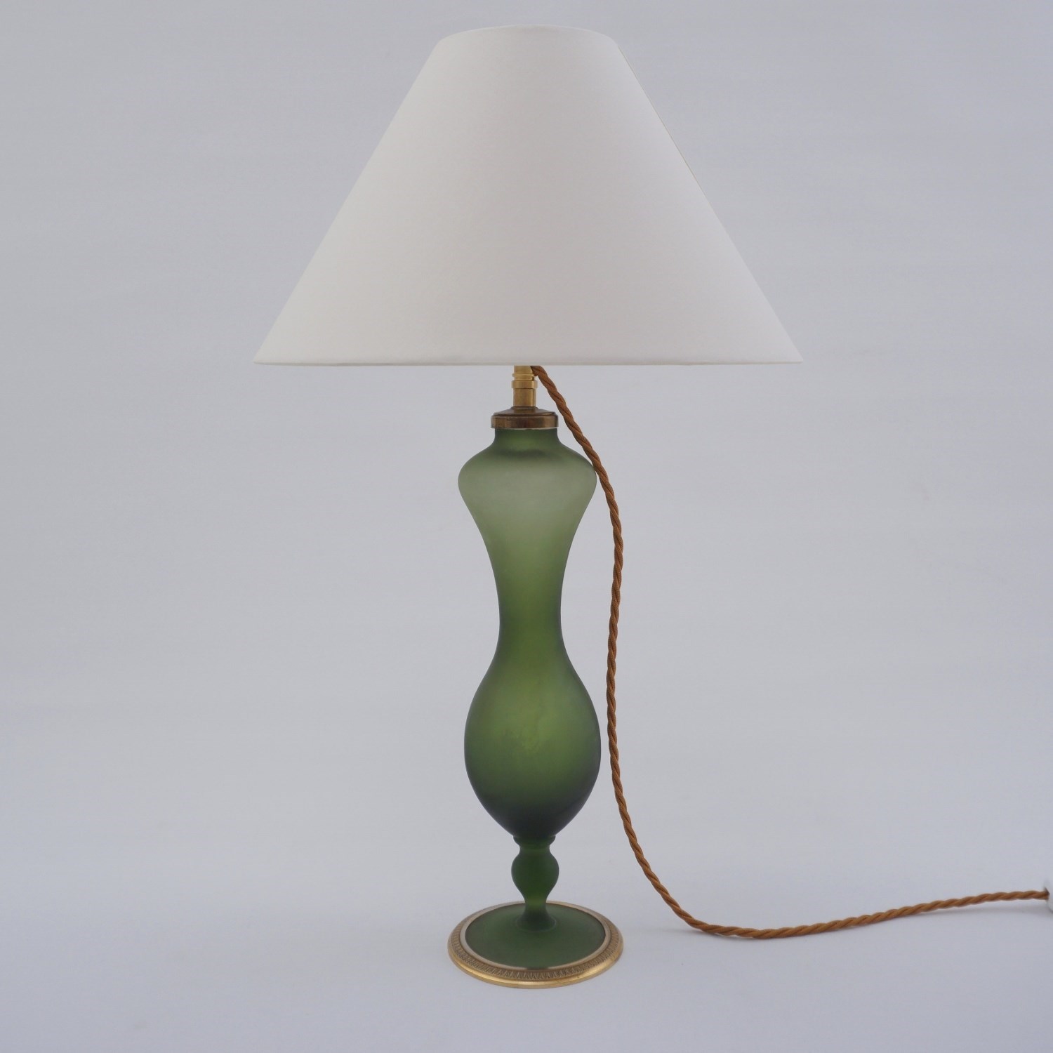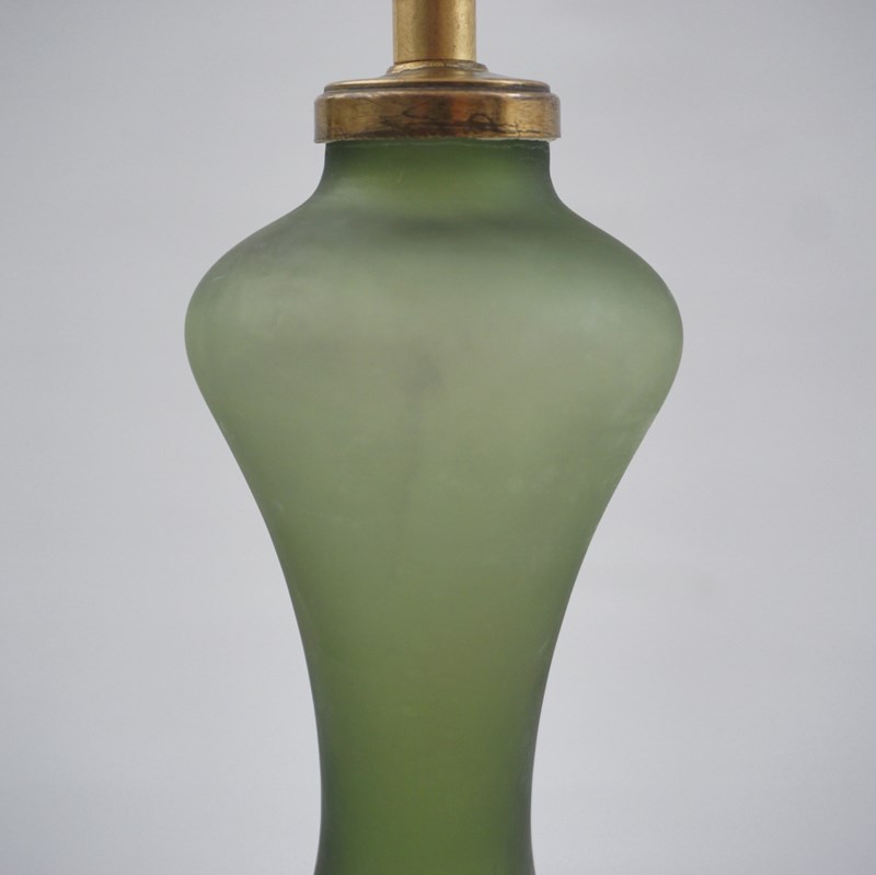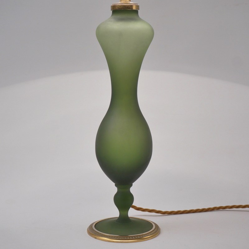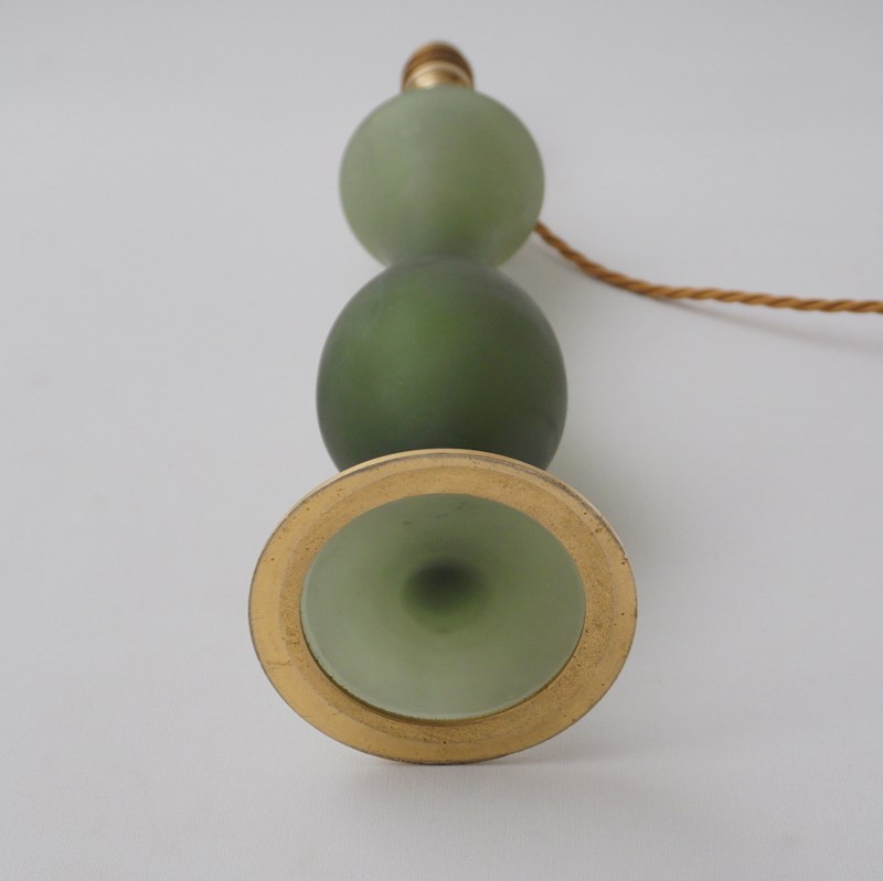The base presents a sinuous, hourglass silhouette crafted in rich green satin glass, softly diffusing light with a velvety, matte finish that reads both refined and tactile. The stem flows from a slender waisted profile into a gently rounded lower body. The generous orb of the main body tapers seamlessly to a petite baluster foot, which sits upon a finely cast ormolu base. The gilt-bronze mountings accentuate the lamp’s classicism and add a warm metallic contrast to the glass.