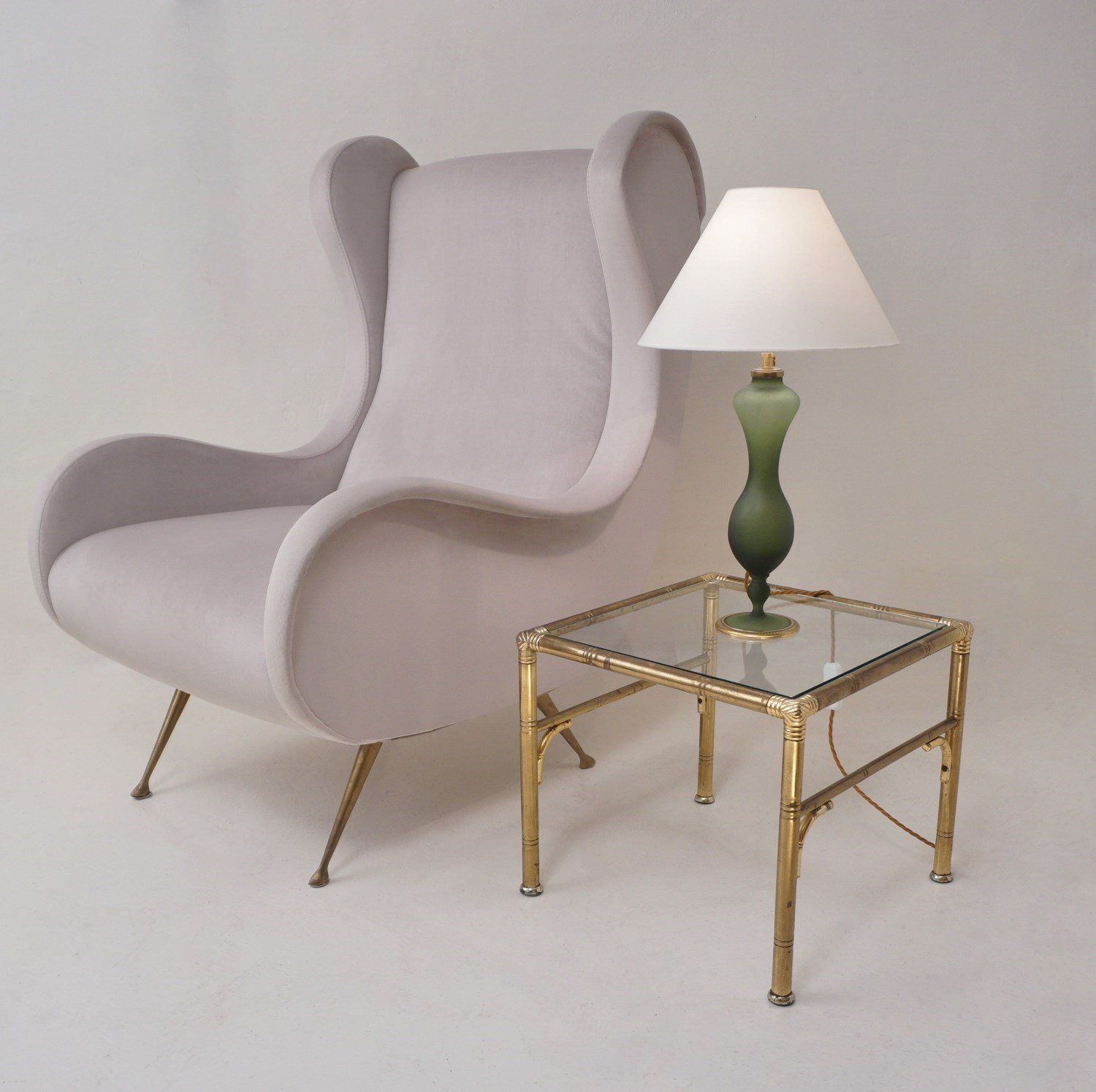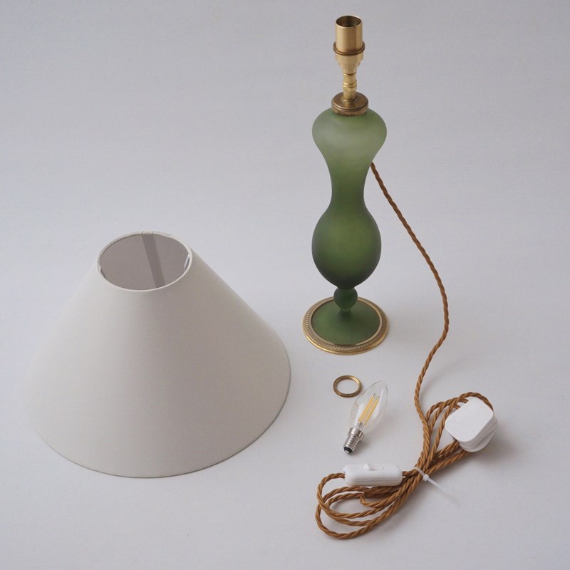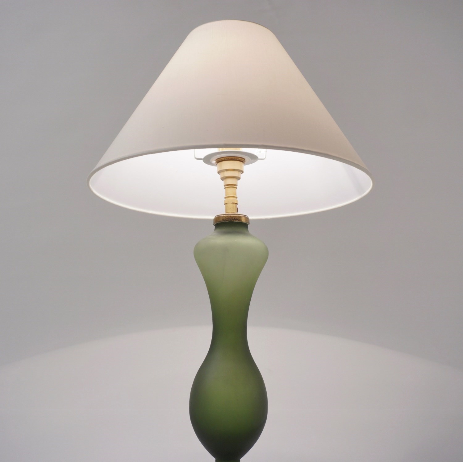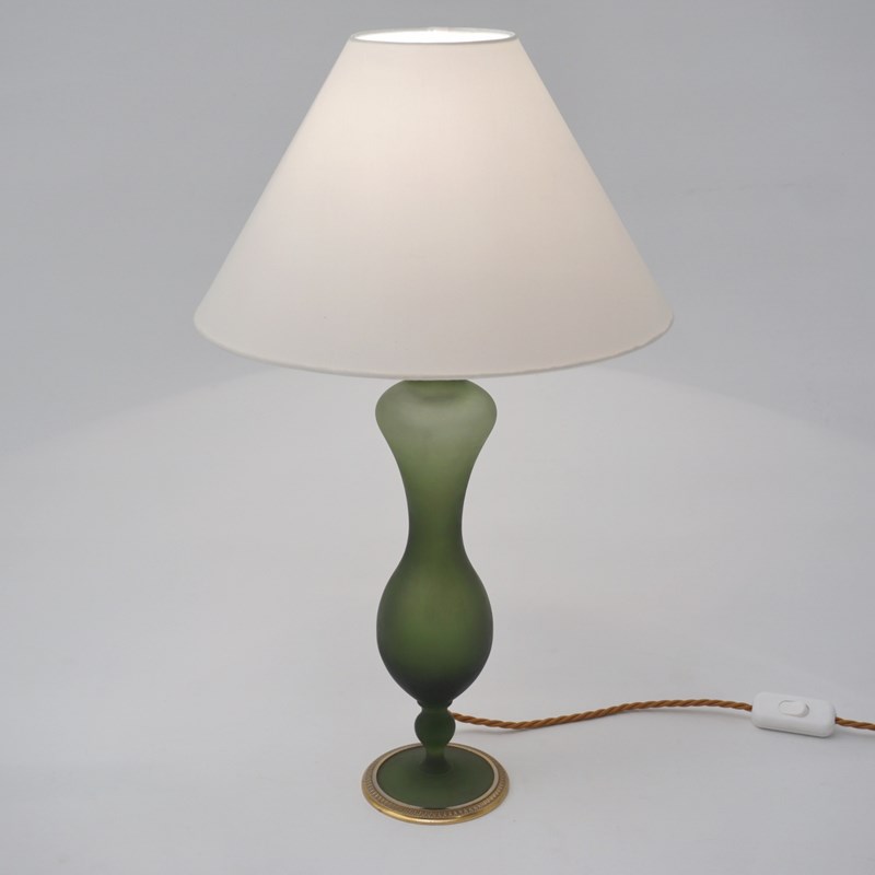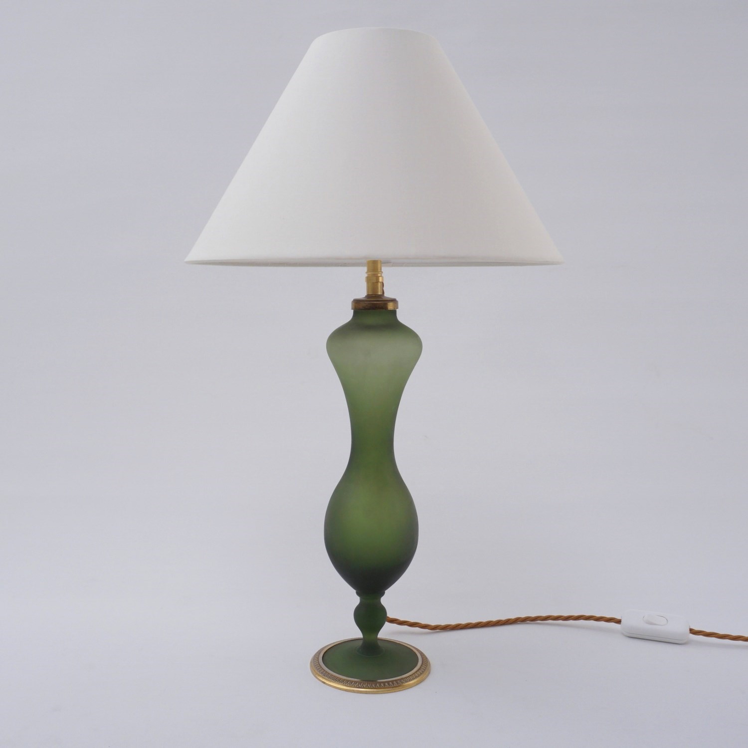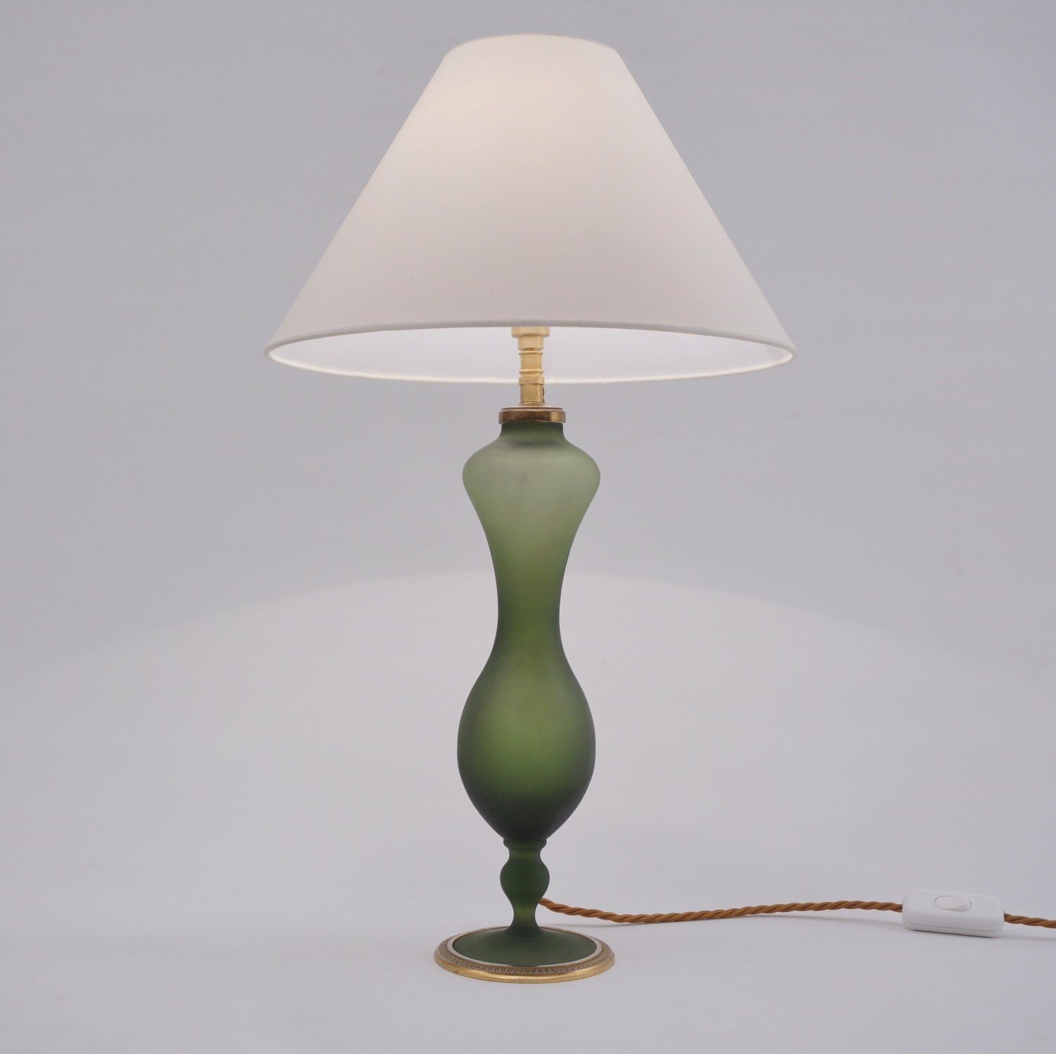 The base presents a sinuous, hourglass silhouette crafted in rich green satin glass, softly diffusing light with a velvety, matte finish that reads both refined and tactile. The stem flows from a slender waisted profile into a gently rounded lower body. The generous orb of the main body tapers seamlessly to a petite baluster foot, which sits upon a finely cast ormolu base. The gilt-bronze mountings accentuate the lamp’s classicism and add a warm metallic contrast to the glass.