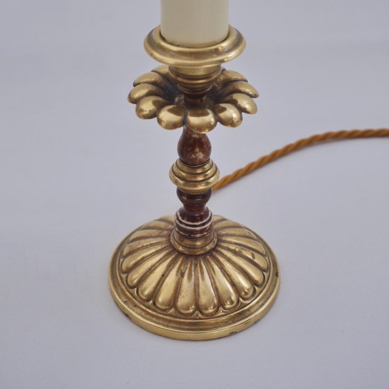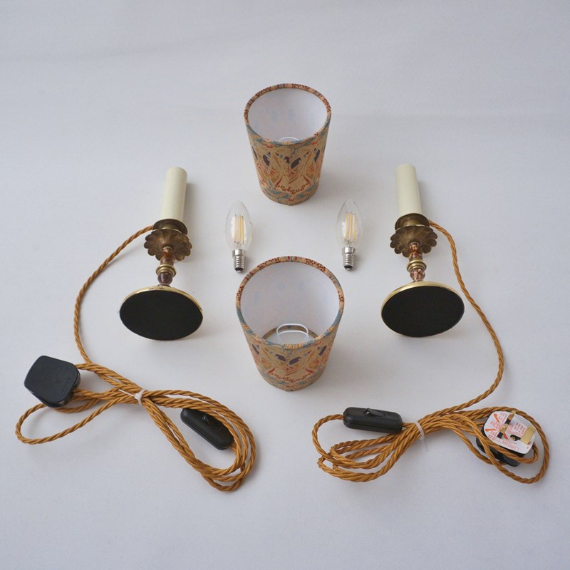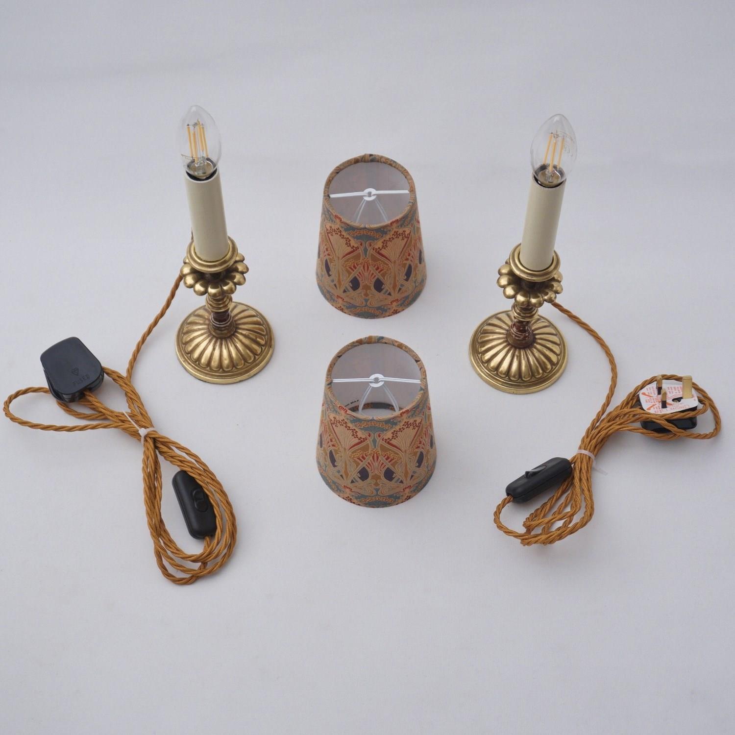 This pair of antique lamps have been gently cleaned while respecting the aged patina. They are newly rewired, earthed, PAT tested by an electrician and ready to use. Each has the following new components: lamp holder with a cream card cover, gold silk cable, black cord switch, black plug (UK Plug up to 250V) & clip on Liberty fabric lampshade. Lightbulbs included. These lamps can be used with a dimmer. It is possible to use these lights in other countries with a light bulb suitable to local electricity.