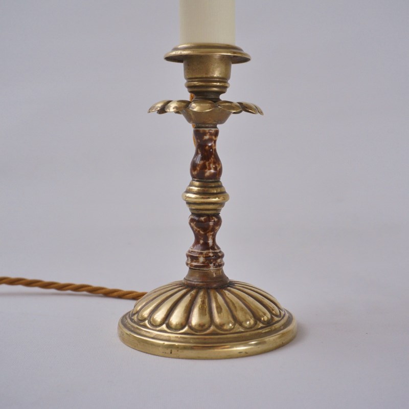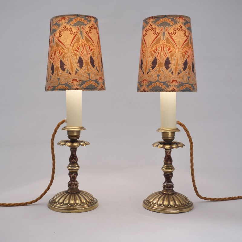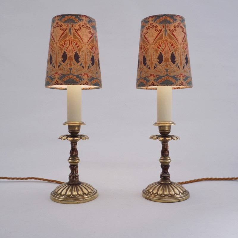 Arts & Crafts antique pair of candlestick table lamps, probably made by Townshend & Co, with Liberty fabric lampshades, in solid brass & porcelain, 1880`s ca, English.