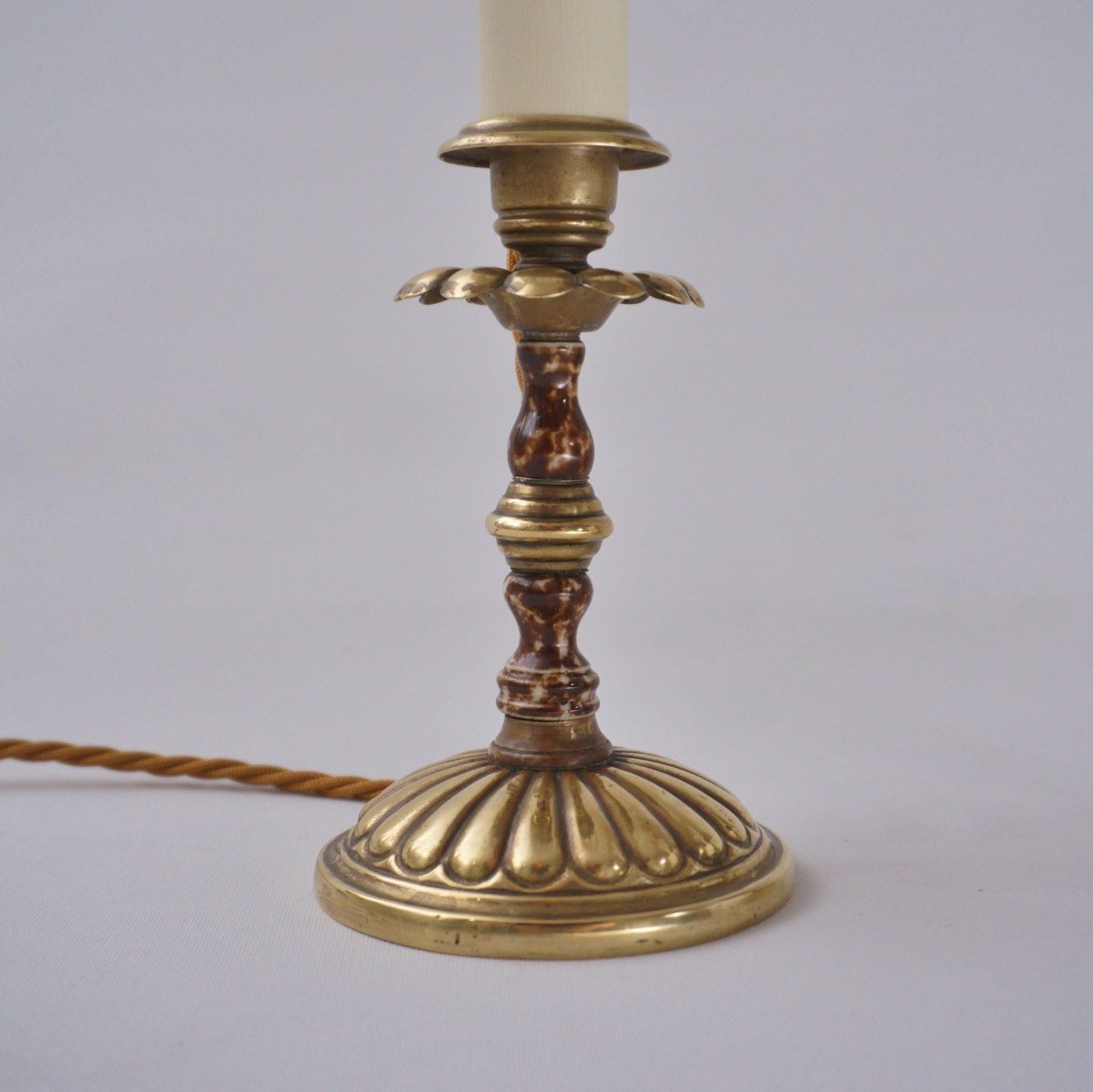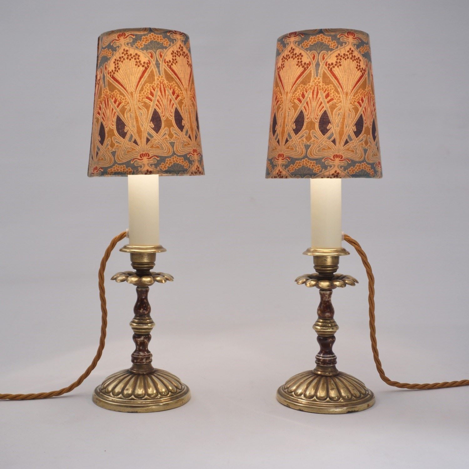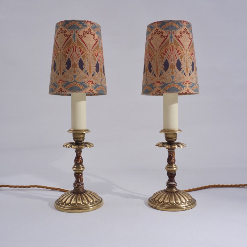 Arts & Crafts Pair Candlestick Table Lamps Brass & Porcelain, Liberty Lampshades