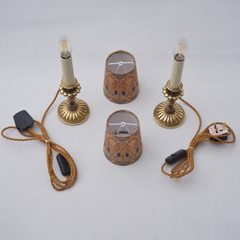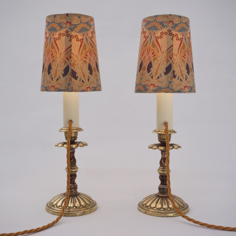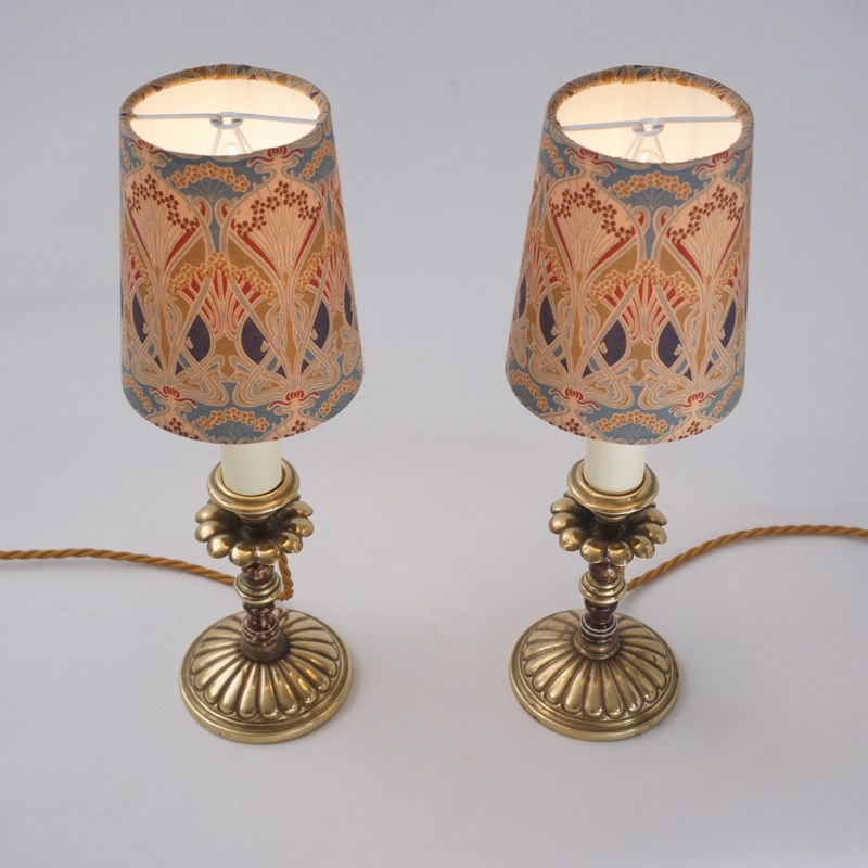 Both lamps are finished with new clip-on lampshades covered in genuine Liberty of London "Ianthe" fabric. This complements the style of the base. Considered to be Liberty’s most iconic Art Nouveau design, Ianthe was originally created as a wallpaper layout by French artist R. Beauclair in c.1902. It was reworked for Liberty by the Haward Studio in 1967, and has appeared in a multitude of different designs and styles ever since.