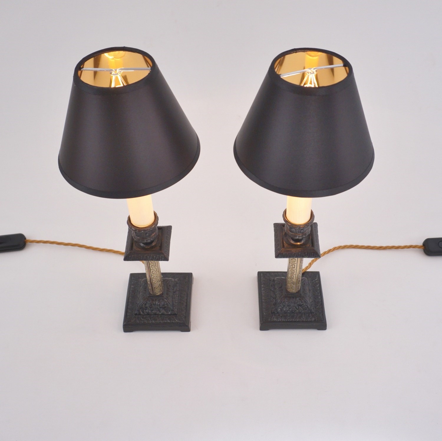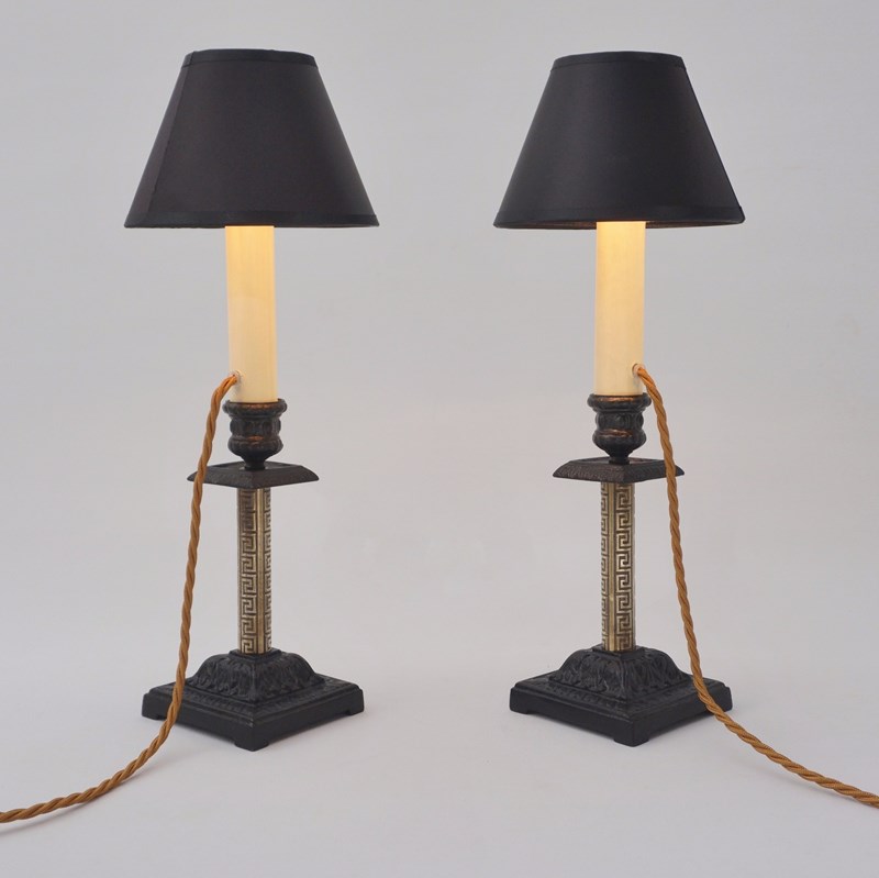 The Aesthetic Movement style flourished in Britain between 1860-1900. The sophisticated design was intended to bring beauty to everyday objects, escaping the ugliness & materialism of the Industrial Age. Aesthetic artists drew inspiration from various cultures and periods, in this example from ancient Greece, with the geometric decorative pattern on the brass. The contrast between the black & gold surfaces, tubular & square shapes, traditional & geometric motifs, make these lamps a good example of The Aesthetic Movement style. This rich eclecticism is one of the Aesthetic Movement`s most intriguing characteristics making these lamps fitting for Interiors today.