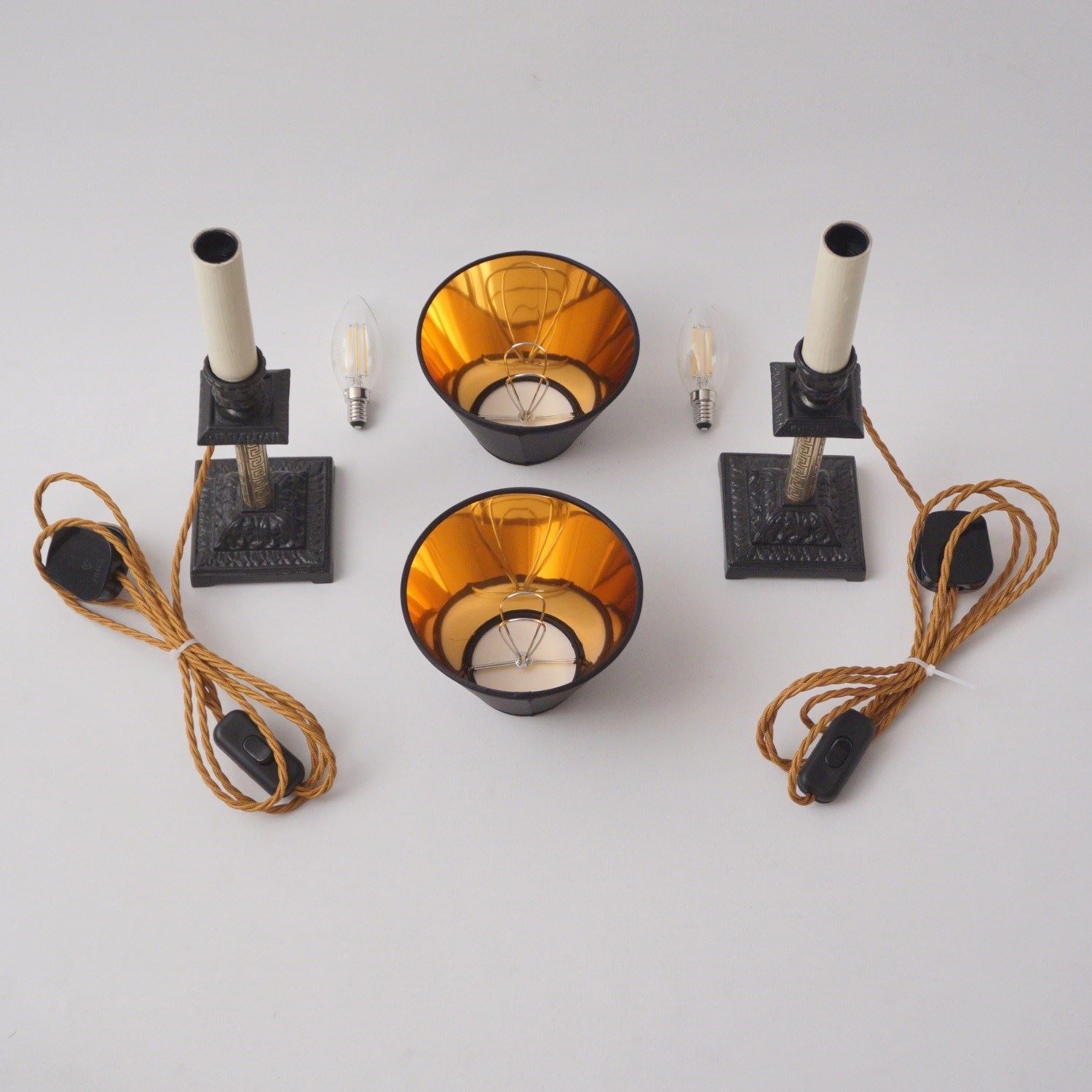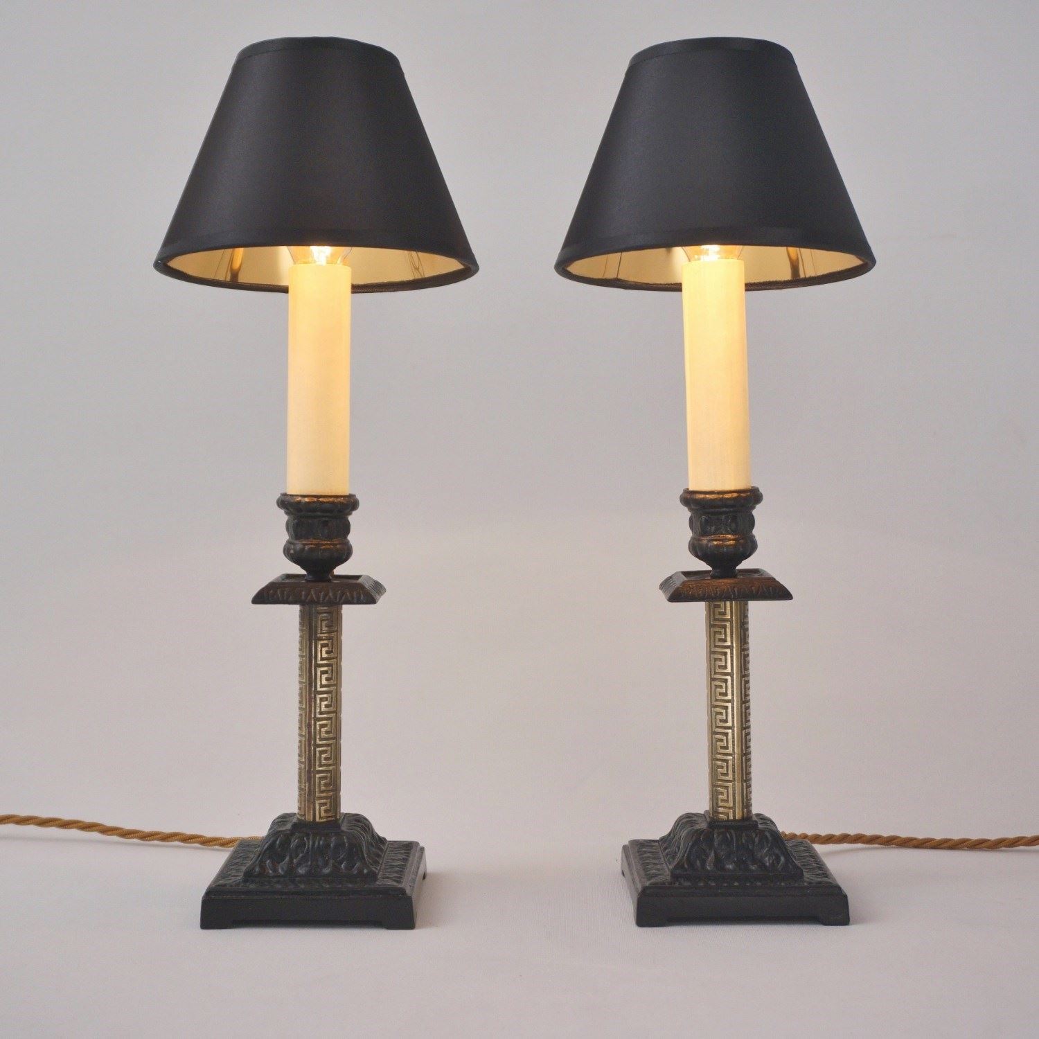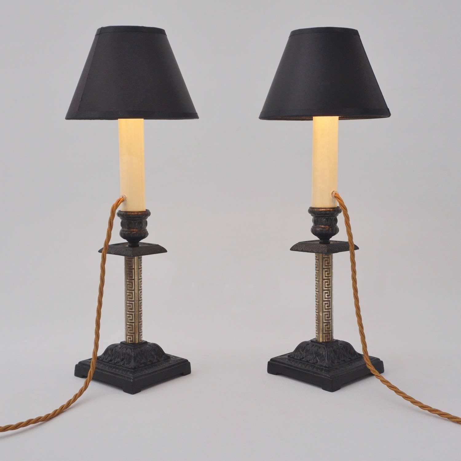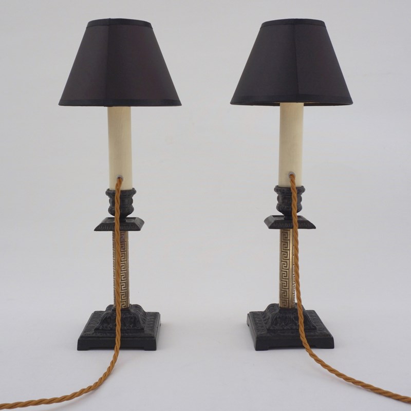 Pair of antique candlestick table lamps from the Aesthetic Movement period, in iron & brass, 1890`s ca, English.